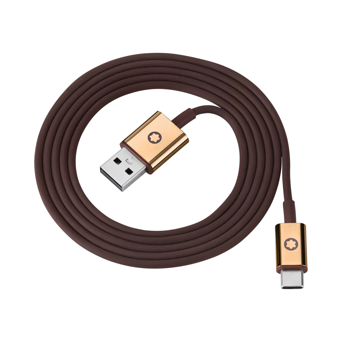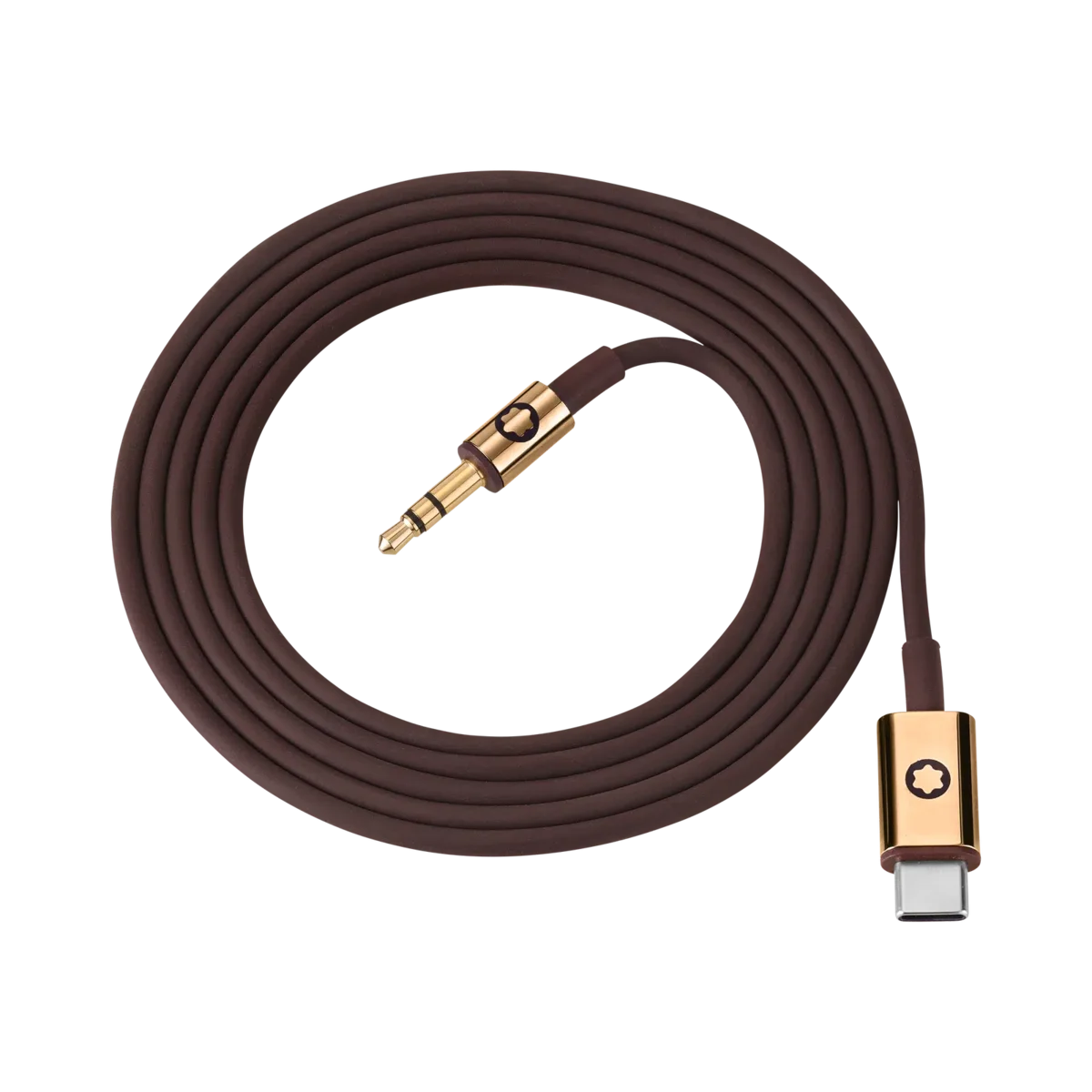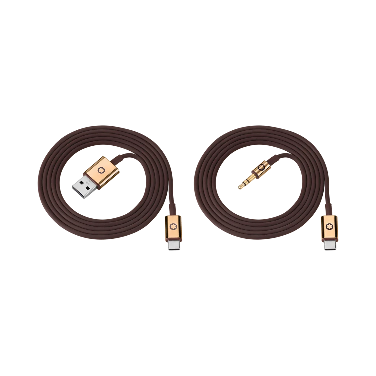 Ekstra kabelsæt til dine Montblanc MB 01-hovedtelefoner, der indeholder et brunt USB-C-opladerkabel og et brunt lydkabel.