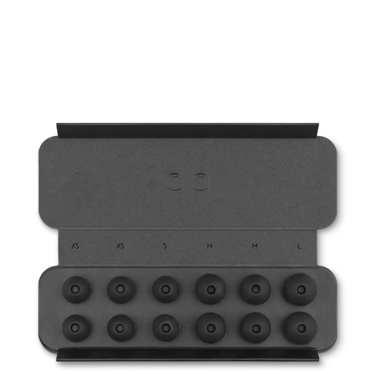 Sæt med 6 par silikoneørepropper i forskellige størrelser (XS, S, M, L).