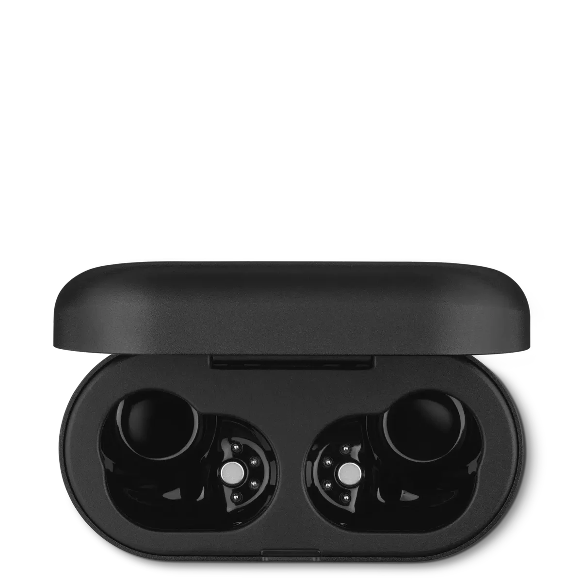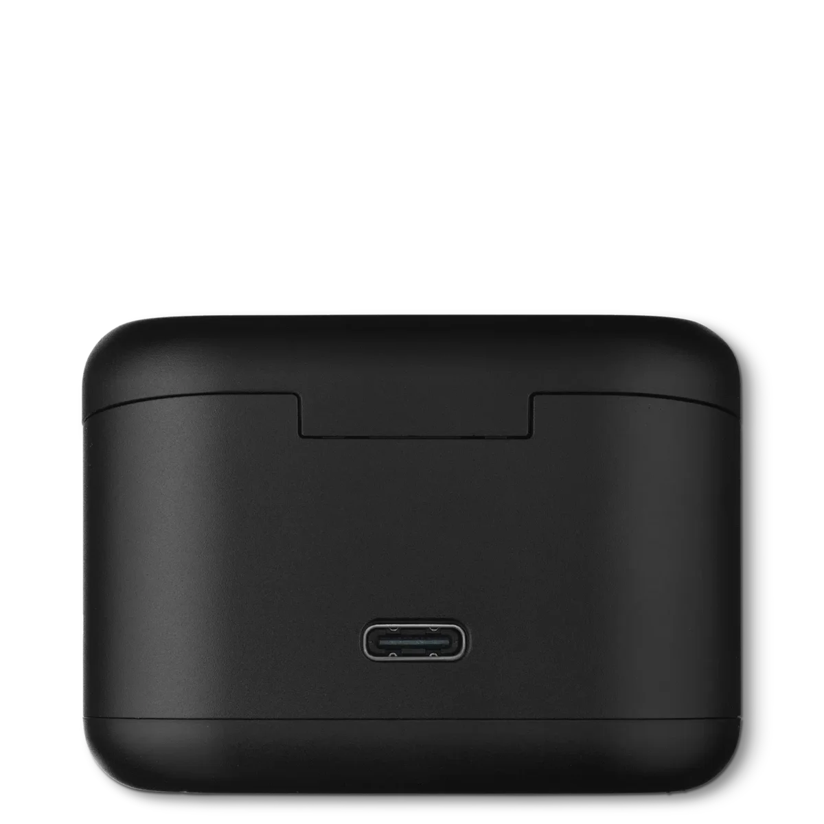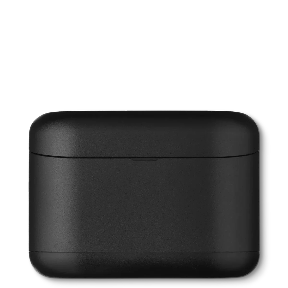 Sort opladningsetui til Montblanc MTB 03 in-ear-hovedtelefoner. Etuiet er kompatibelt med trådløs opladning.