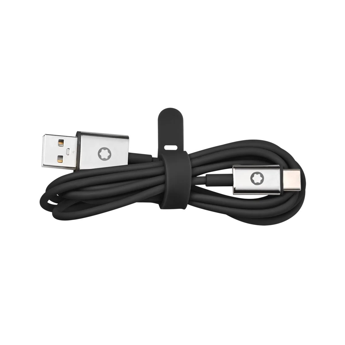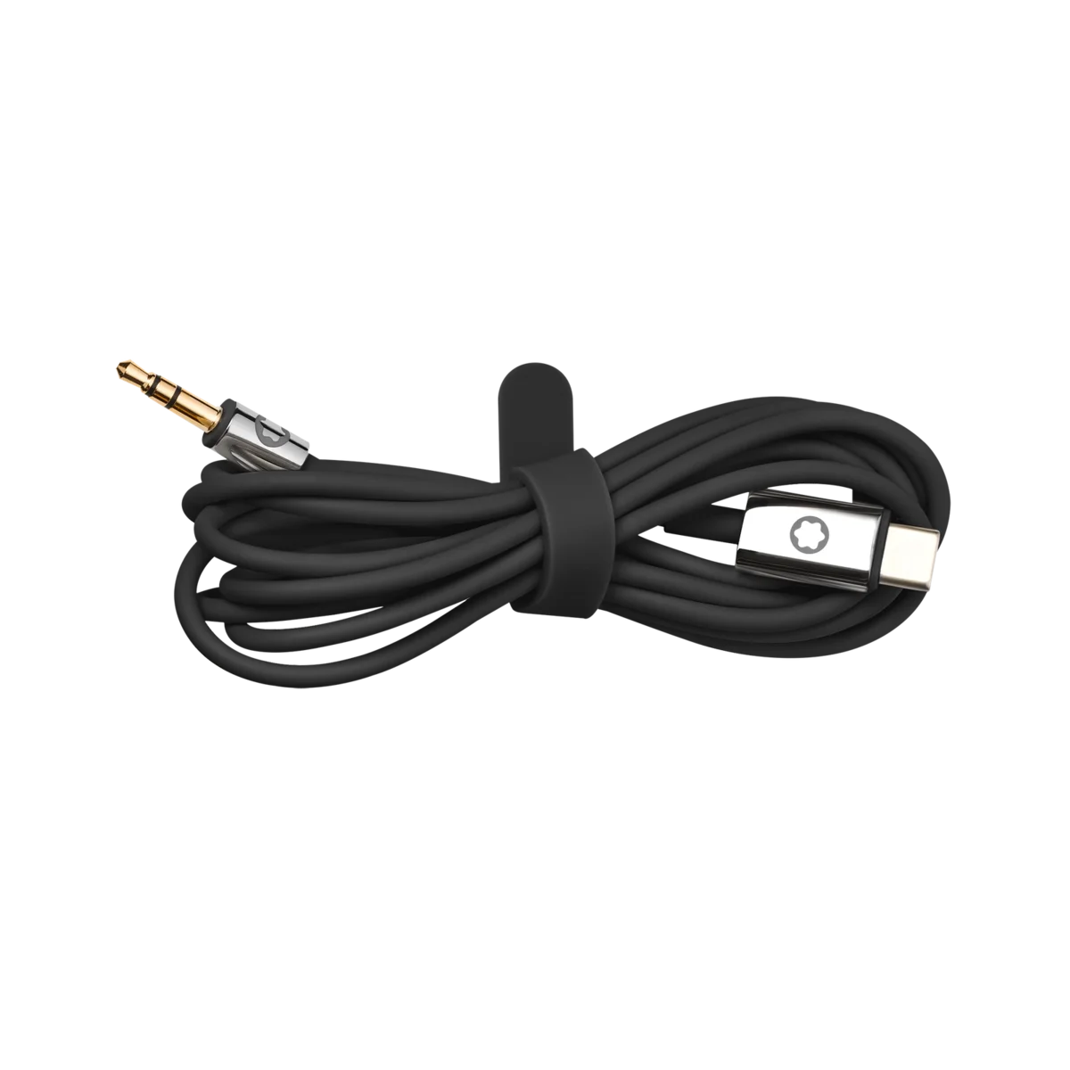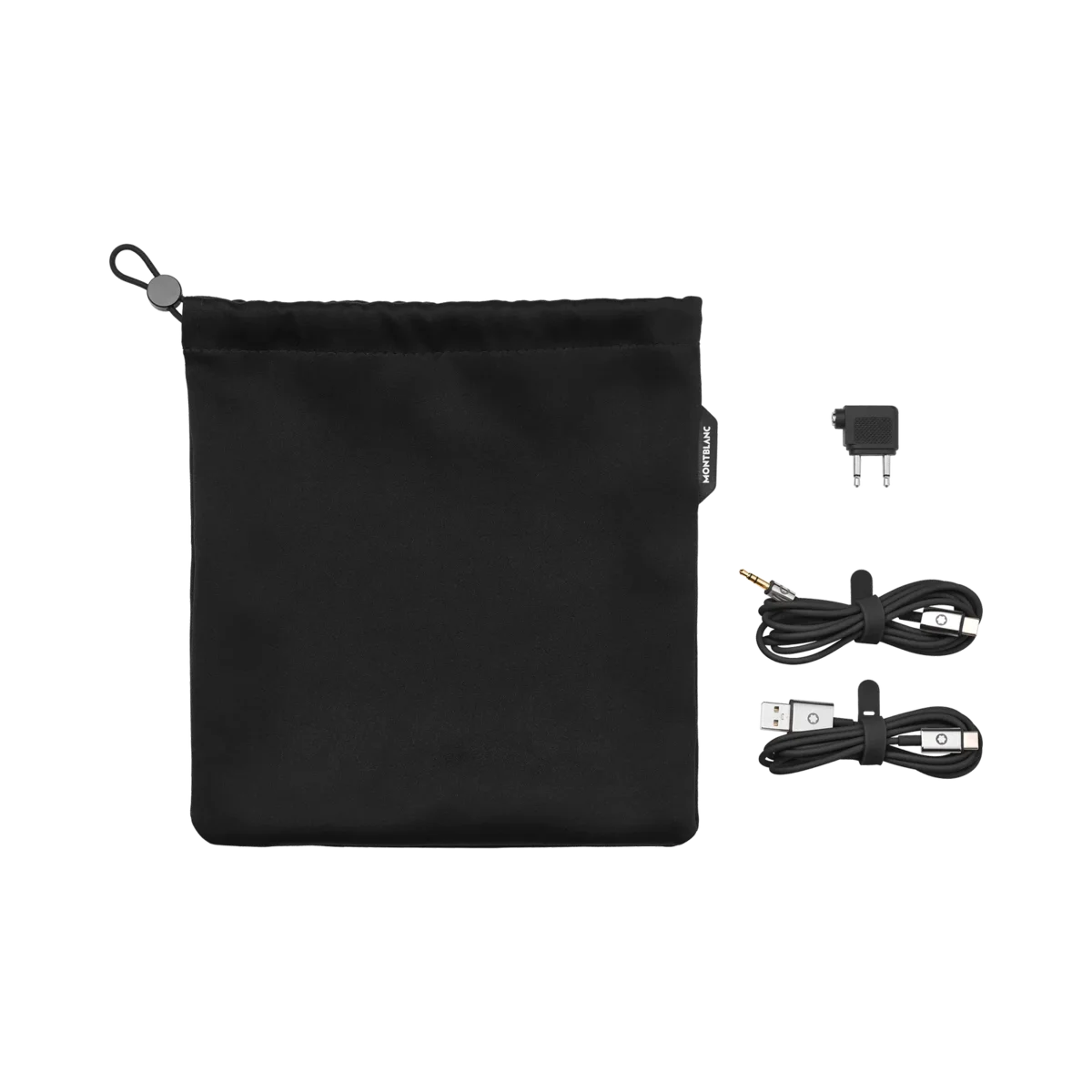 Ekstra rejsesæt til dine Montblanc MB 01-hovedtelefoner med en sort taske, et sort USB-C-opladerkabel, et sort lydkabel og en sort rejseadapter.