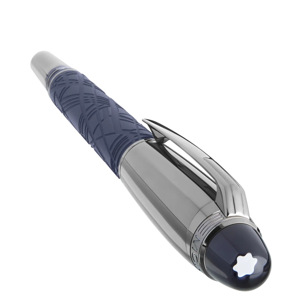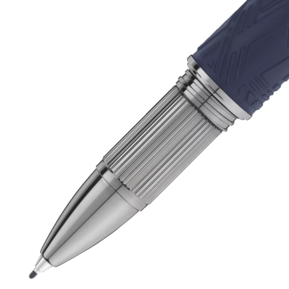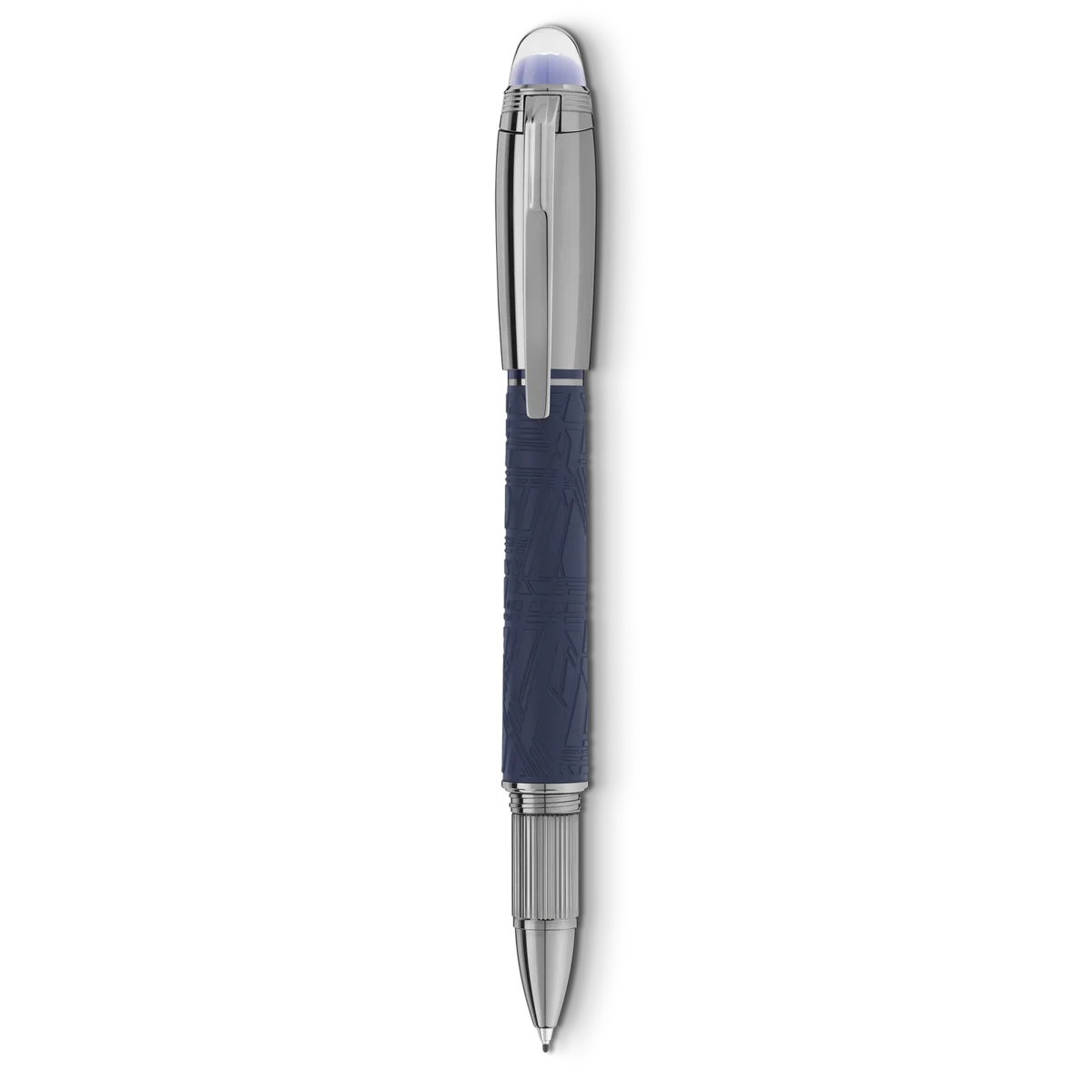 StarWalker SpaceBlue ser ud over planeten Jorden og vender sig mod stjernerne og galaksen. Denne nye StarWalker-kollektion giver harpiksstammen et nyt look med et design, der minder om de indviklede strukturer i Widmanstätten-mønsteret, en af naturens mest hypnotiske skabninger. Alle metaldele er belagt med mørkt ruthenium, ledsaget af en dyb rumblå tone til den matte ædle harpiks, der minder om nuancerne i en stjernehimmel. Derudover kommer subdomen på hætten, hvor Montblanc-emblemet svæver, i en dyb rumblå farve.