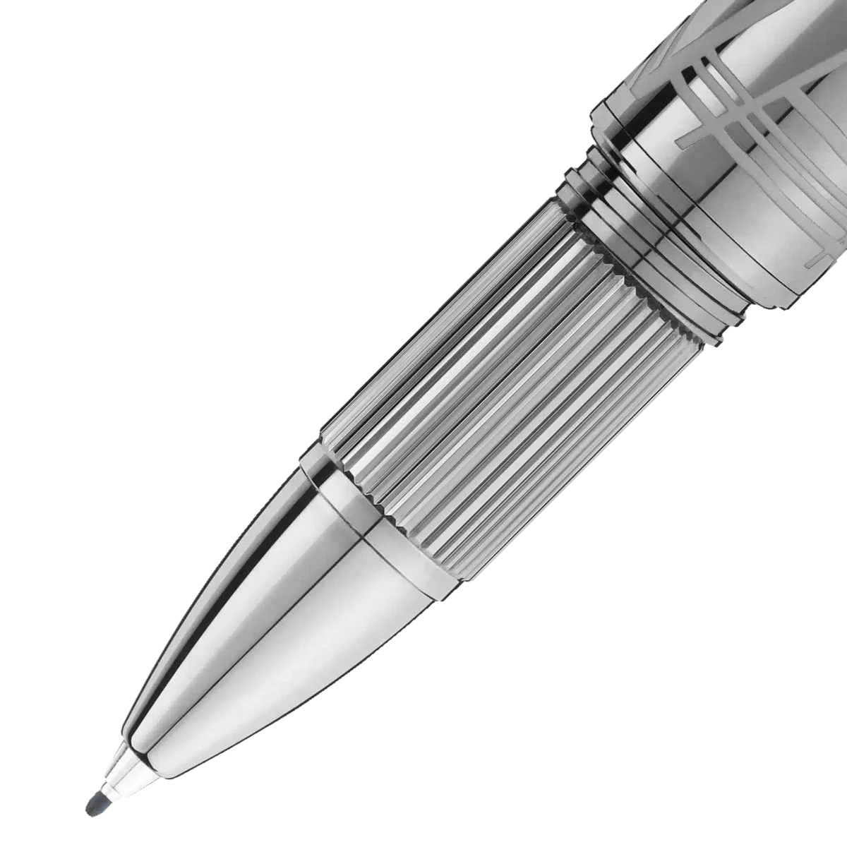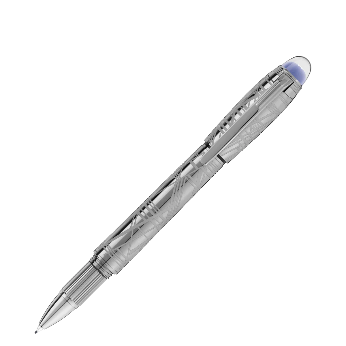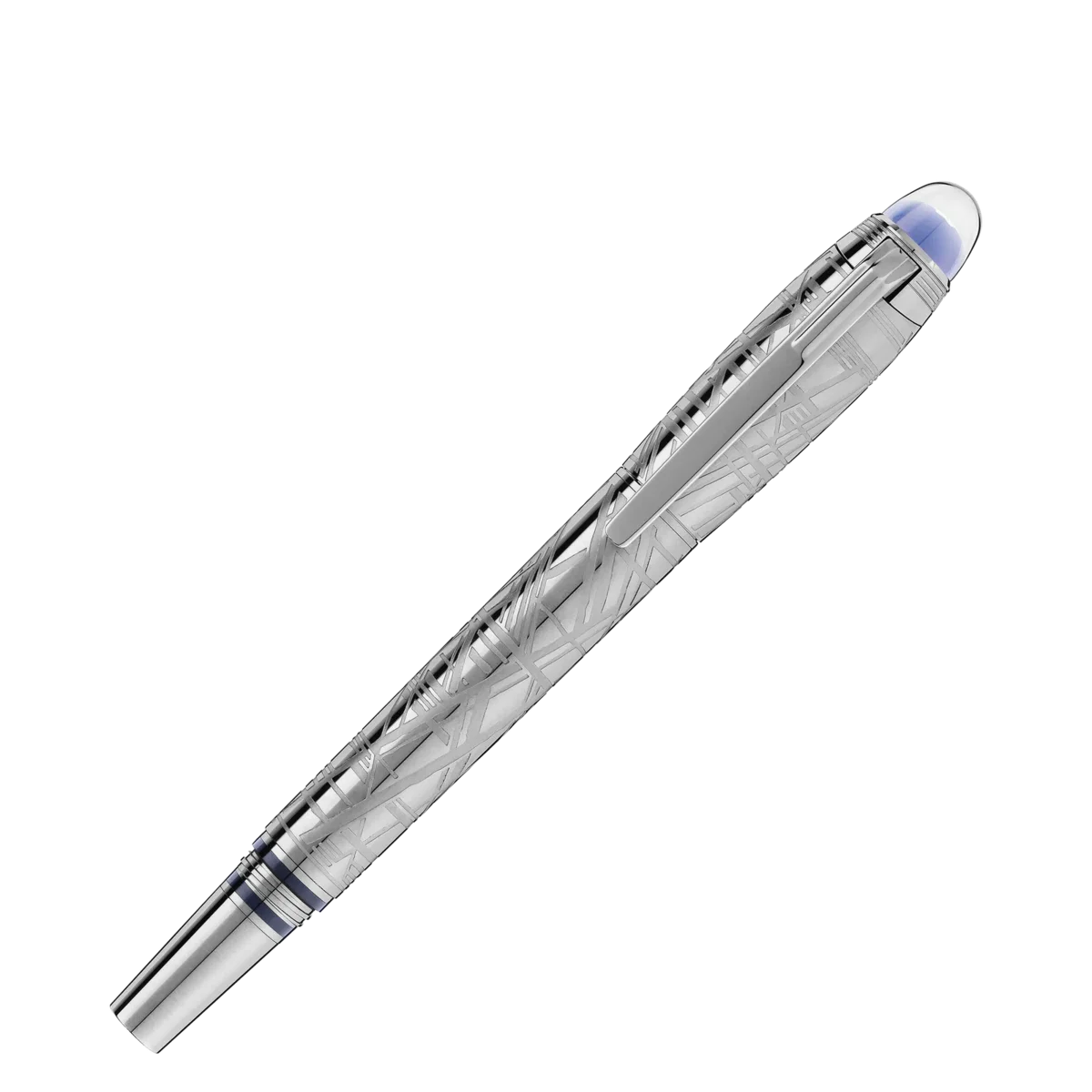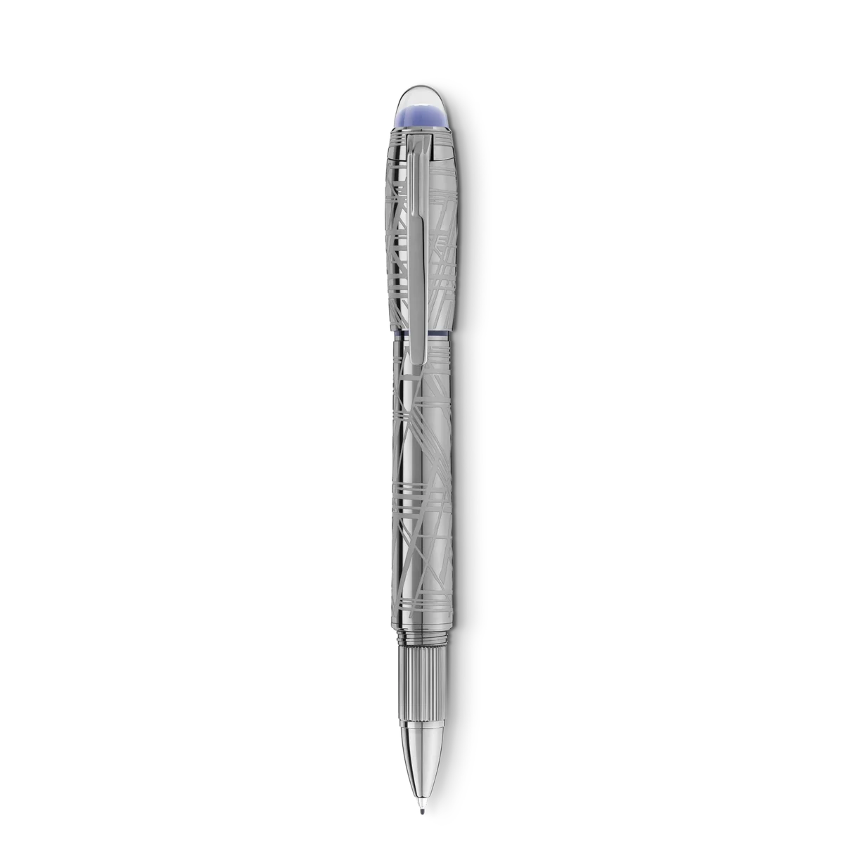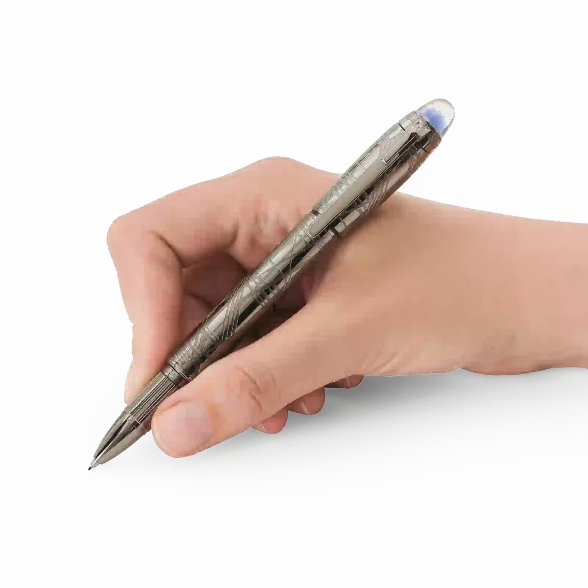 StarWalker SpaceBlue ser ud over planeten Jorden og vender sig mod stjernerne og galaksen. Denne nye StarWalker-kollektion giver metalhætten og -skaftet et nyt look med et design, der minder om de indviklede strukturer i Widmanstätten-mønsteret, en af naturens mest hypnotiske skabninger. Alle metaldele er belagt med mørkt ruthenium, ledsaget af en dyb rumblå subdome på hætten, der minder om nuancerne i en stjernehimmel, hvor Montblanc-emblemet svæver.