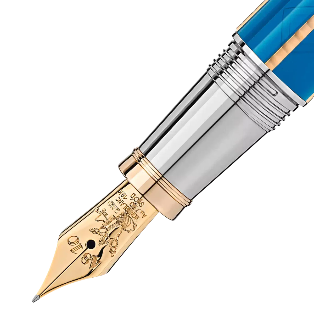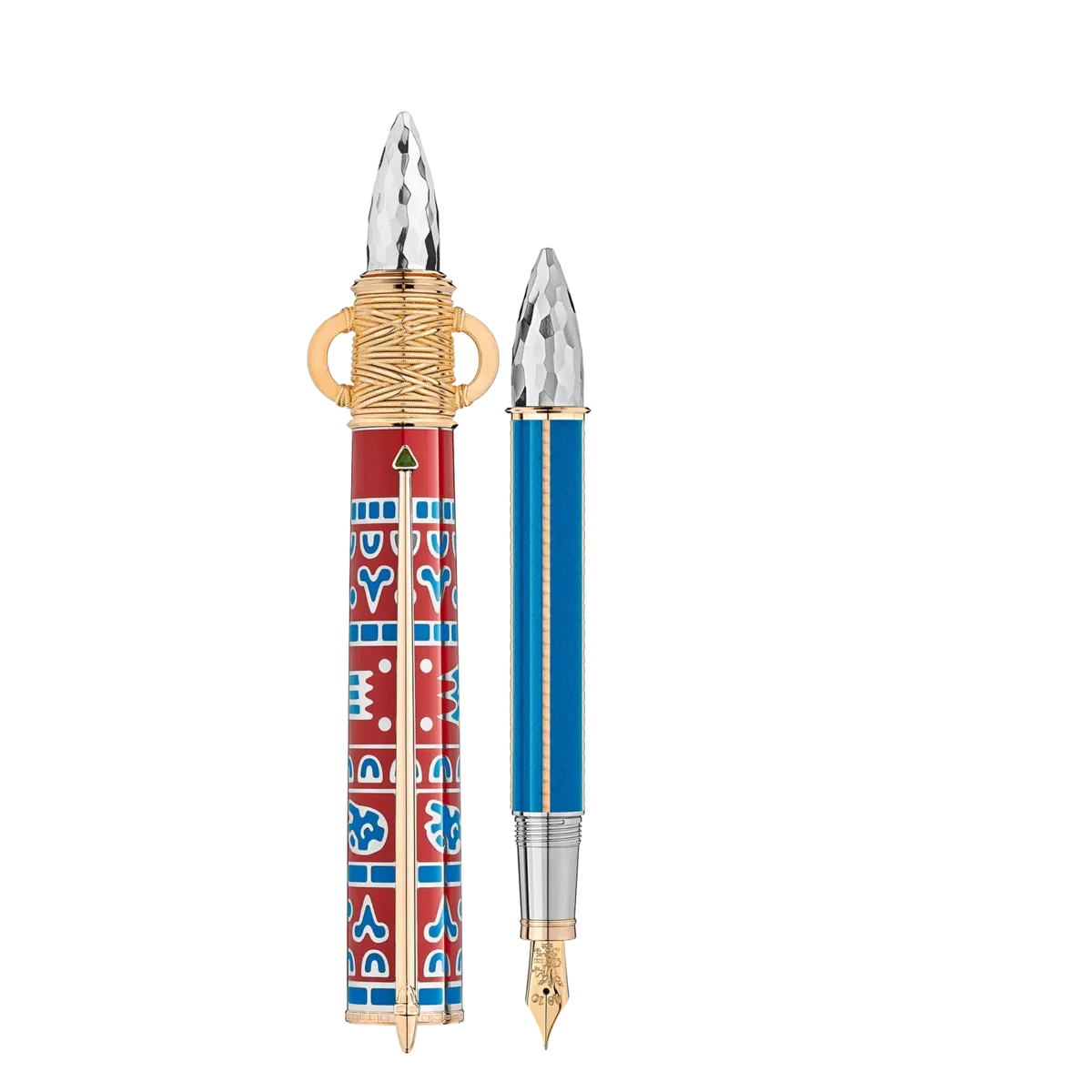 Moctezuma I blev kronet til hersker over det store aztekiske imperium i 1440 og indledte dermed aztekernes guldalder. Under hans regeringstid formede han det billede af den aztekiske stat, som vi kender i dag – en stat rig på kultur og mytologi. Hovedstaden Tenochtitlán, det nuværende Mexico City, blomstrede under hans styre. Montblanc Patron of Art Homage to Moctezuma I Limited Edition 4810 med signaturbelagte guldbeslag er dedikeret til denne suveræne hersker over en af de mest særlige kulturer i verdenshistorien. Det overordnede design er inspireret af en atlatl, et aztekisk spydkasteapparat. Formen på keglen, der er forfinet med en hammerfinish, er baseret på en aztekisk offerkniv med en obsidianklinge. Lakfarverne – turkis og karminrød – er inspireret af farverne på den kongelige kappe. Lakindlægninger inspireret af traditionelle tegn og ornamenter kroner hætten. Den håndlavede spids i massivt 750 guld er prydet med en fin gravering inspireret af det aztekiske tegn for byen Tenochtitlán: en trearmet kaktus med en kongelig diadem og to ruller.