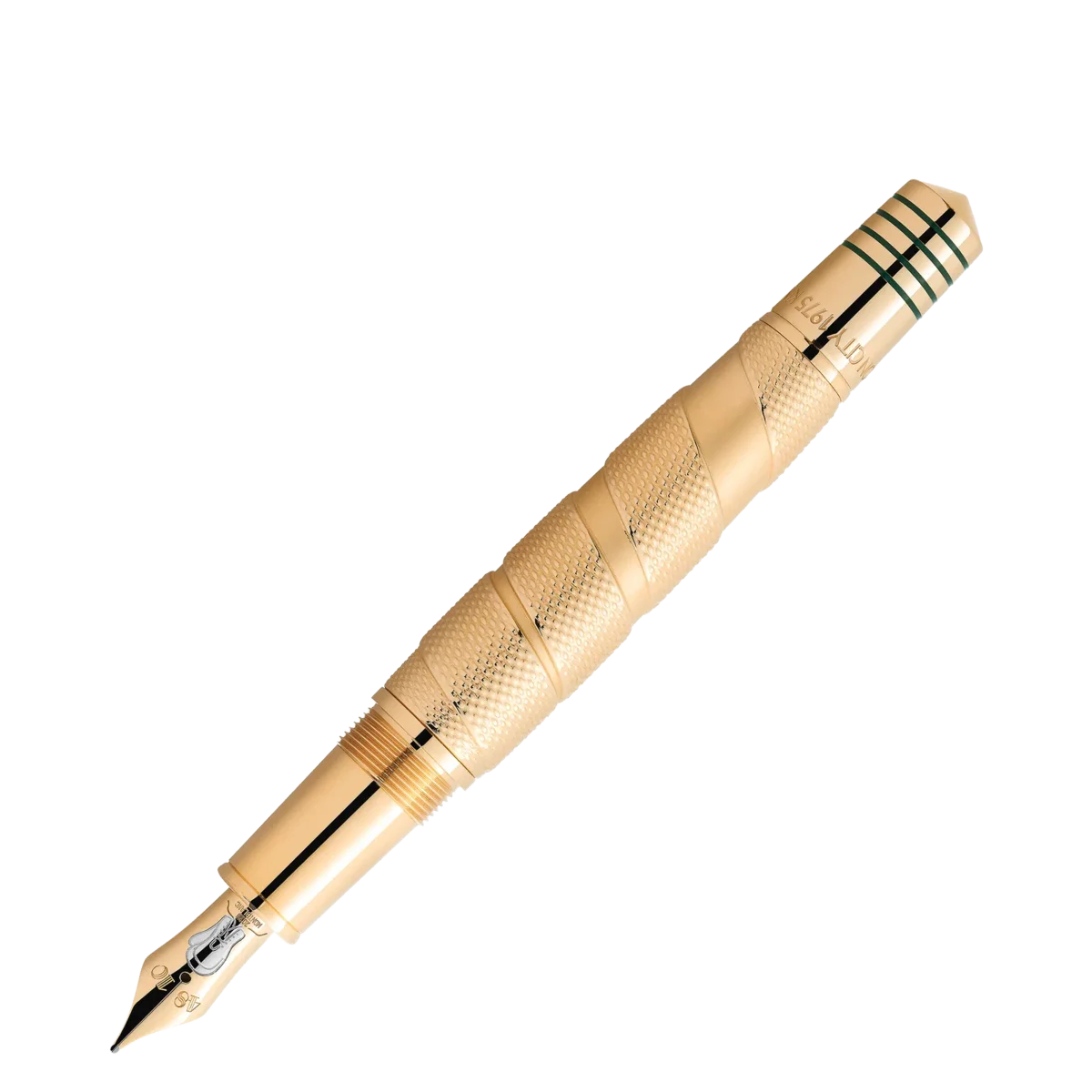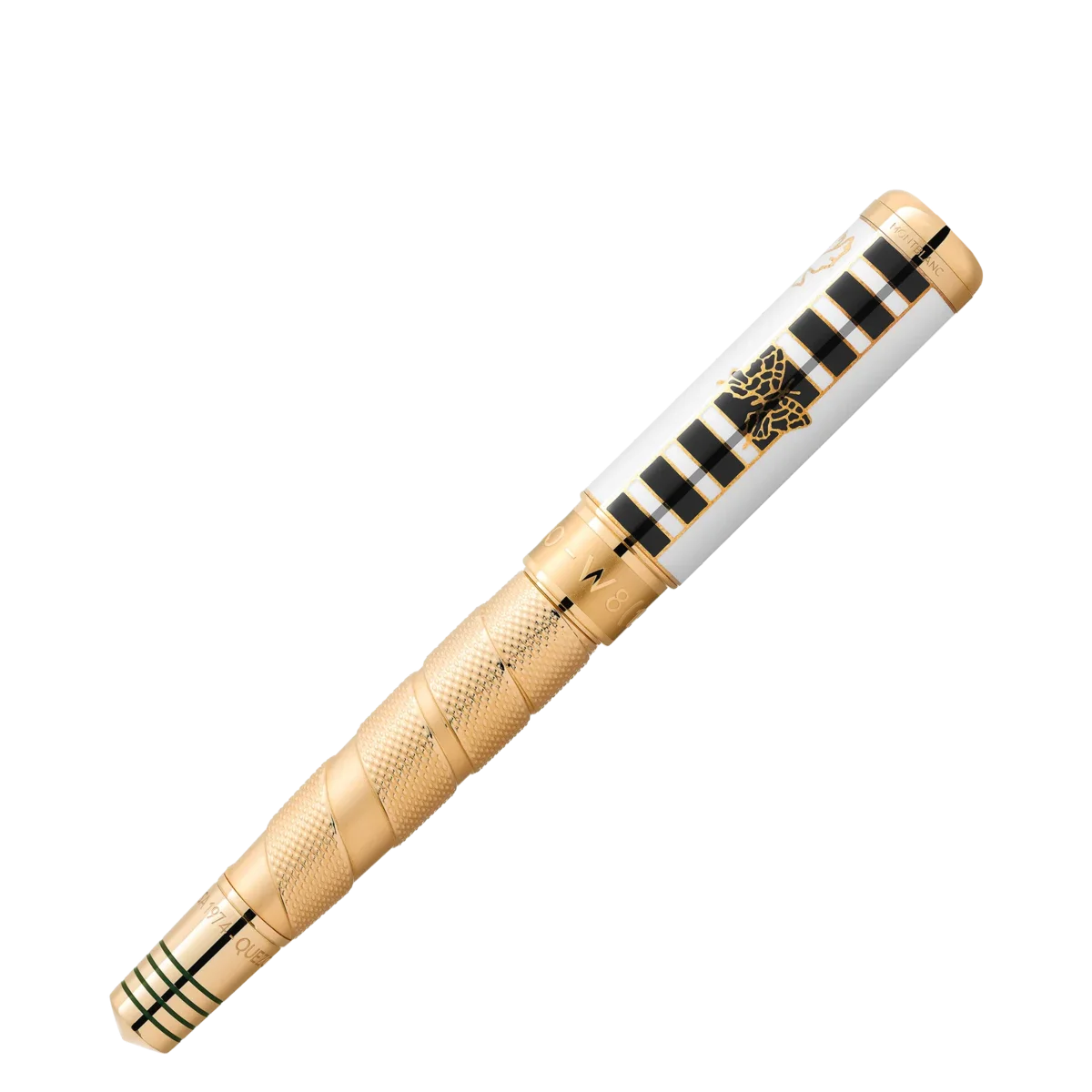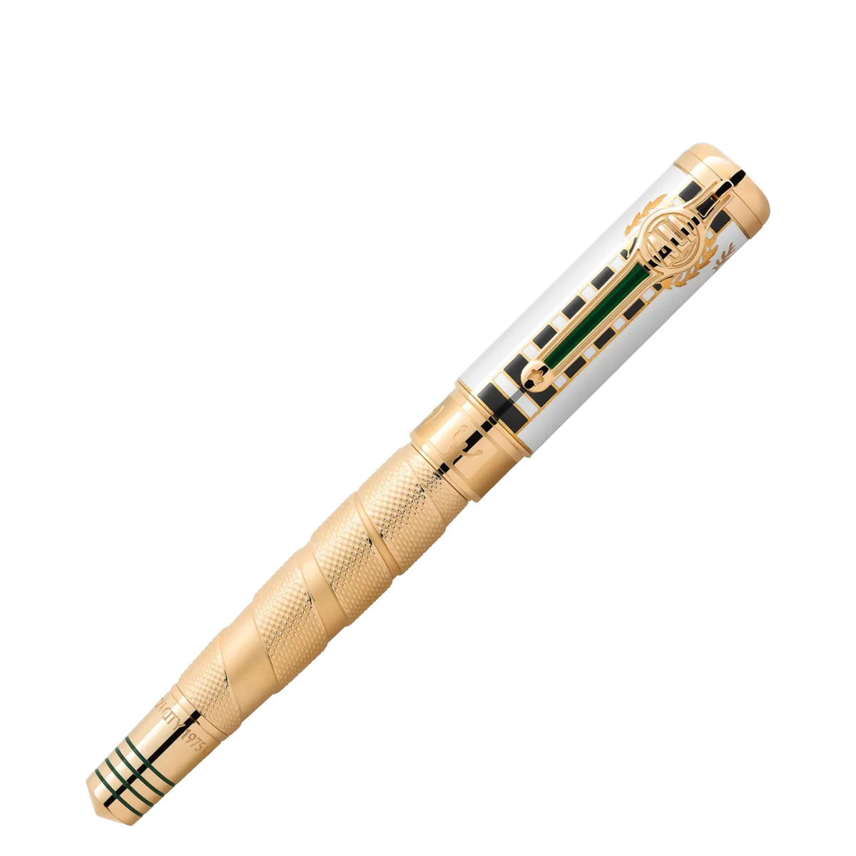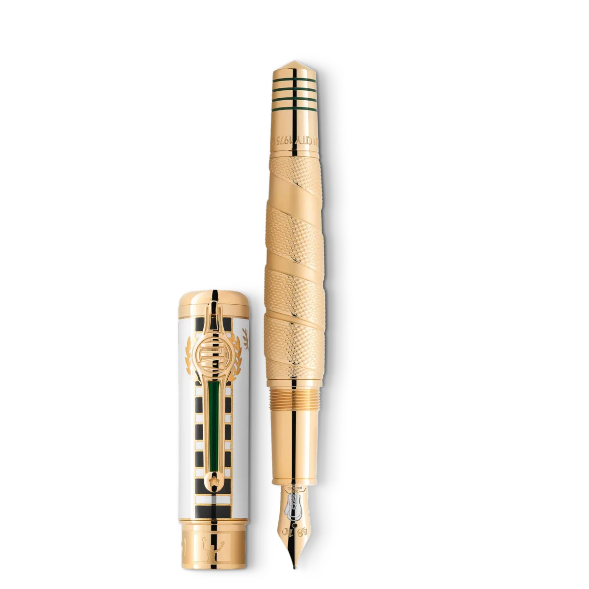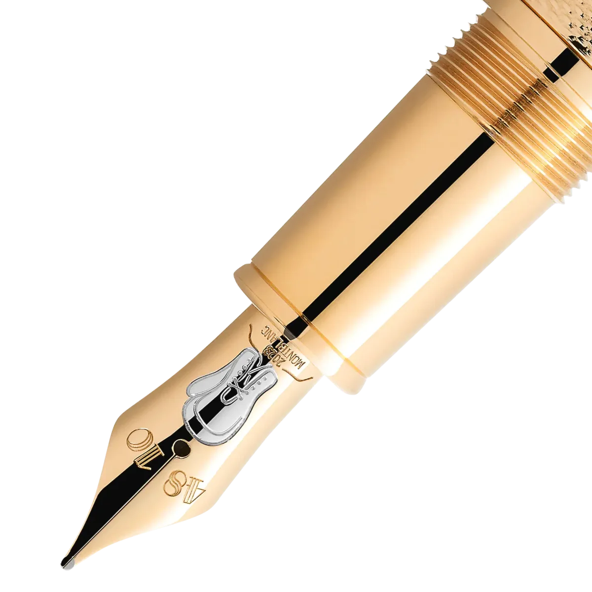 Kun få atleter er så berømte og hædrede som den tredobbelte verdensmester i sværvægtsboksning, Muhammad Ali, hvis legendariske øjeblikke inden for sport og borgerrettighedsaktivisme gjorde ham til en af de mest indflydelsesrige atleter og humanitære personer i det 20. århundrede. Som atlet rystede Ali verden med sin styrke, dygtighed og personlighed og blev verdensmester i sværvægtsboksning i en alder af kun 22 år. Hans største triumf var dog hans humanitære indsats. Inspireret af den kappe, Ali bar, da han gik ind i den legendariske kamp i Kinshasa, Zaire, i 1974, repræsenterer den kostbare lak på hætten dette karakteristiske mønster, mens mønsteret på den guldbelagte krop ligner de boksetapes, atleter bruger til at vikle om deres hænder. Den guldbelagte sommerfugl på huen er inspireret af hans typiske kampstil: “Flyv som en sommerfugl, stik som en bi”. Den spidse kegle tager denne idé op, og de fire lakerede linjer ligner rebene i en boksering. Inskriptionerne på keglen henviser til Alis sejr i kampen i 1974 med tilnavnet “Rumble in the Jungle”, hvor Ali vandt sit andet verdensmesterskab i sværvægtsboksning. Detaljerne om hans sejr, nemlig at han vandt i ottende runde ved teknisk knockout, findes på hætten. Keglen henviser også til en berømt kamp med Ali i 1975, med tilnavnet “Thrilla in Manila”.For at fejre hans anden titel er Montblanc-emblemet i hvid ædelharpiks prydet med et “2”. For at understrege denne succes er klipsen formet som et bokseverdensmesterskabsbælte og bærer hans navn. Den håndlavede, solide Au 750 tofarvede guldspids viser en boksehandske. Identifikationsnummer MB129336 Fysisk vægt 95,76 g Dimensioner 147,3 mm * 17,3 mm