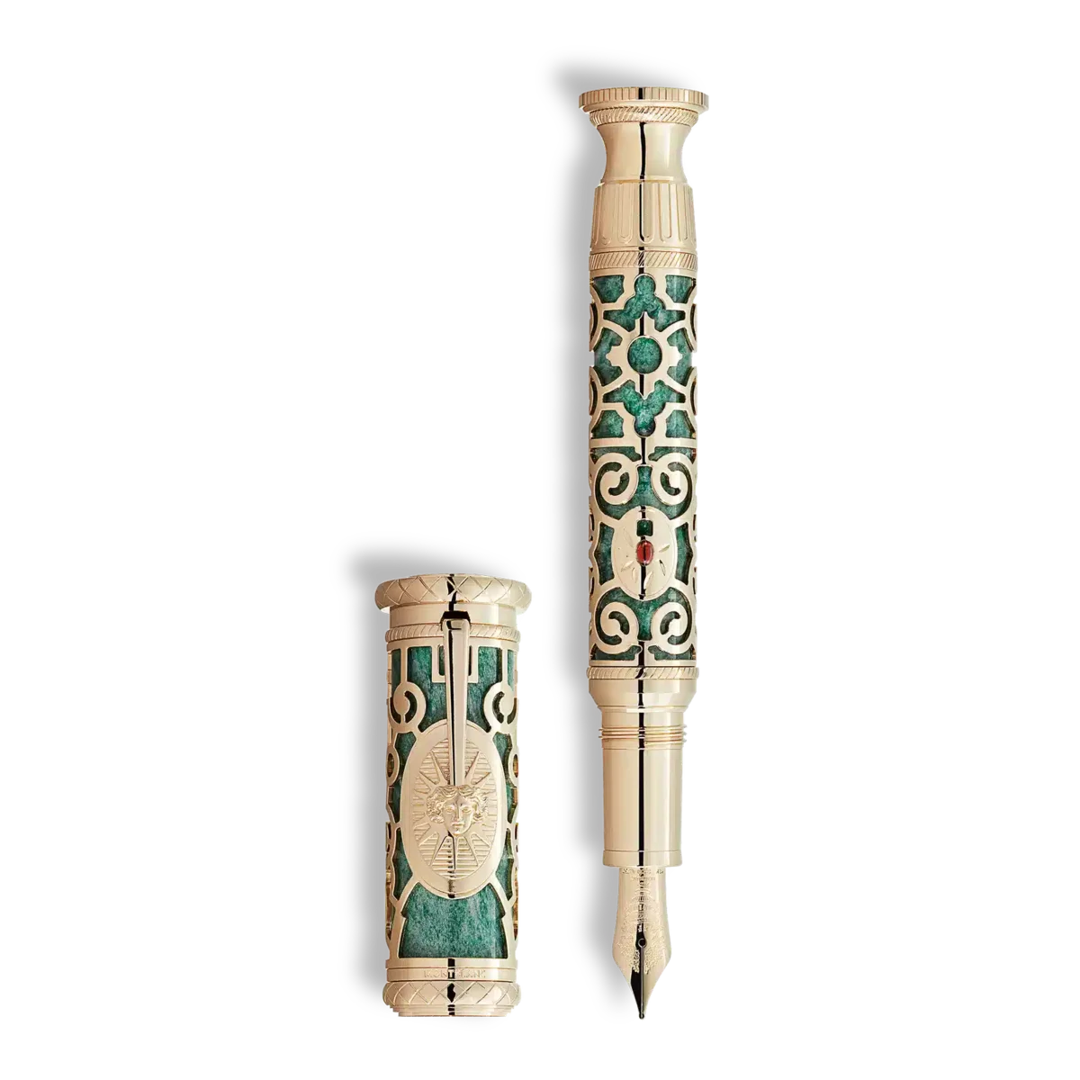 Det er næsten umuligt at forestille sig Versailles uden dens storslåede haver. Med A Journey through Château de Versailles Collection tager Montblanc os med på en tur gennem dette barokke mesterværk for at hylde Versailles, der er opført på verdensarvslisten. Limited Edition 195 hylder især de kongelige haver og orangeri, som var af så stor betydning for kongen. Først når man betragter ejendommen som en helhed, bliver Solkongens urokkelige ambition tydelig: at skabe en symbiose mellem skønhed og geometrisk præcision. Kendte landskabsarkitekter blev hyret til at designe og anlægge en have, der ville overskygge alle andre. Det, der engang var marskland, blev forvandlet til et perfekt orkestreret spektakel af vandkunst og lunde, prydblomsterbede, kunstfærdige springvand, vandstråler, marmorskulpturer og overdådigt dekorerede vaser. Det gav kongen enorm glæde at spadsere gennem sin have, og der var en del, han var særlig glad for: orangeri. Hans store passion for parfume, især duften af appelsinblomster, fik ham til at samle de fleste af appelsintræerne fra de kongelige huse og anskaffe et stort antal nye fra Italien, Spanien og Portugal. Beskyttet mod det kolde vintervejr blomstrede træerne i det enorme orangeri – en af grundene til, at det franske hof på det tidspunkt var kendt i hele Europa som “det parfumerede hof”. Designet af denne udgave, der har lånt mønster og farveskema fra de symmetriske kongelige haver, kombinerer et kunstfærdigt skeletoverlay af massivt Au 750 signaturguld med grøn aventurin, der glimter nedenunder. Midten af tønden, en granat-cabochon, er omgivet af en delikat blomstergravering. Et strejf af orangeriets atmosfære bringes ind i denne udgave, ikke kun gennem mønsteret på konen, der er inspireret af vaserne i orangeriets, men også gennem prægningen på den håndlavede, massive Au 750 guldspids. Den forestiller en af de historiske plantekrukker, der omkransede blomsterbedene i sommermånederne og fremviste kongens dyrebare citrus træer. Til ære for ‘Solkongen’, som monarken senere er blevet kaldt, møder man billedet af solen overalt i paladset i talrige repræsentationer og allegoriske hentydninger til den antikke græske gud. Solen indtager også en central plads på Limited Edition 479. Klipsen er et mesterværk af håndværksmæssig dygtighed og ender i en detaljeret afbildning af Apollos hoved omgivet af solens stråler og indfattet i en massiv Au 750 signaturguldplade. Hætten er kronet med Montblanc-emblemet i skinnende perlemor, indlejret i massivt 750 guld. Da hemmeligholdelse var et centralt element i magten ved hoffet, brugte Solkongen specielle krypteringssystemer med bogstaver og tal, kendt som ‘Grand Chiffre’ og ‘Petit Chiffre’. De bevarede fortroligheden af hans militære og diplomatiske kommunikation og skabte samtidig en aura af eksklusivitet og mystik. Ifølge dette system svarede tallet 195 til ordet ‘ære’, et grundlæggende princip ved hoffet på grund af dets association med prestige, social status og kongens gunst. Dette udtryks store betydning inspirerede til at begrænse udgaven til netop 195 eksemplarer. Identifikationsnummer MB132053 Fysisk vægt 116,8 g Dimensioner 144,2 mm * 22 mm * 22 mm