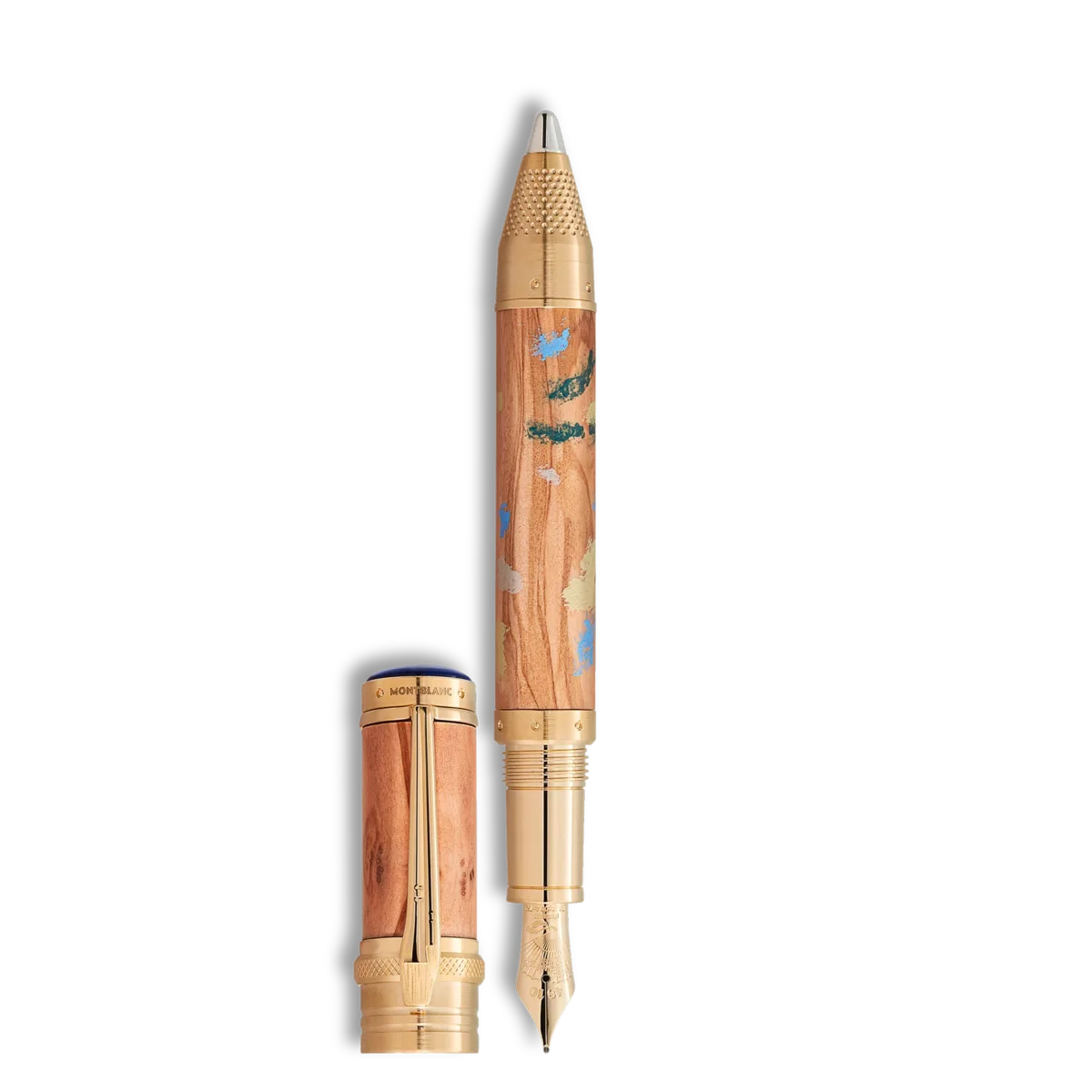 Gennem historien har store kunstnere udtrykt den menneskelige oplevelse i et universelt sprog af form og skønhed. Montblanc Masters of Art-kollektionen hylder deres evige bidrag til stræben efter perfektion i kunsten – en stræben, som Montblanc både fejrer og deltager i.Pierre-Auguste Renoir er en af de mest fremtrædende forløbere for modernismen, hvis solbeskinnede malerier var med til at sætte tonen for en hel bevægelse: impressionismen. Som en anerkendelse af denne fremtrædende og fascinerende franske impressionists banebrydende bedrifter har Montblanc skabt Masters of Art Homage to Pierre-Auguste Renoir Limited Edition 4810.Som om man kigger Renoir over skulderen, er udgaven lavet af oliventræ og smurt med maling, som om den er taget direkte fra kunstnerens hånd. Renoir selv ville sandsynligvis ikke have valgt noget andet træ, da han elskede de gamle oliventræer i sin have i Sydfrankrig og udødeliggjorde mange storslåede eksemplarer i sine billeder. Renoir fangede øjeblikke med skiftende stemninger og registrerede dem på lærredet ved hjælp af levende farver og hurtige penselstrøg. Et iøjnefaldende træk ved udgaven er den guldbelagte klips i form af to pensler, som dem Renoir brugte til at skabe både de fine detaljer og de mere vidtstrakte flader i sine mesterværker. Hætten er prydet med ultramarin ædelharpiks, der omkranser Montblanc-emblemet. Hætten bærer indgraveringen 1874, året hvor denne nye generation af kunstnere, impressionisterne, havde deres første udstilling. Året 1874 markerer således impressionismens fødsel som en selvstændig bevægelse. Den delikate foldbare vifte med to kvaster, der pryder den håndlavede, solide Au 750 guldspids, er en hyldest til viftens betydning, et tilbehør, der er at finde i mange af hans værker, især i mange af hans indsigtsfulde portrætter af kvinder. Som en hyldest til Renoirs tegnekunst er en sølvspids af blødt Ag 925 sterlingsølv integreret i den guldbelagte kegle, så man selv kan lave sølvspids-skitser.
