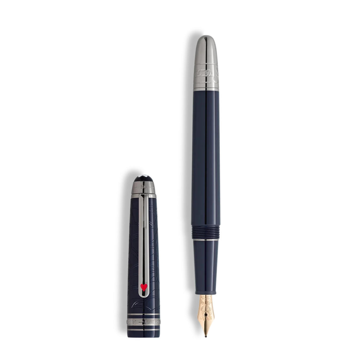 Meisterstück Around the World in 80 Days-kollektionen er inspireret af Jules Vernes berømte eventyrroman. Classique-fyldepen, der er prydet med mørkeblå ædelharpiks, fortæller om Mr. Fogg og Passepartouts episke rejse. Da de begiver sig ud på den sidste etape fra Yokohama tilbage til London via USA, krydser de to det store amerikanske kontinent med tog. Dyk ned i de intrikate detaljer – et tog, der er elegant indgraveret på hætten, et sikkerhedskædemønster på keglen, der afspejler et afgørende øjeblik, hvor Passepartout kobler toget fra lokomotivet for at redde besætningen, der blev angrebet af Sioux.Kappens design fanger trykventilerne og lokomotivets bølgende røg, mens klipsen prydes af et rødt lakeret hjerterkort, der symboliserer foreningen mellem Phileas Fogg og prinsesse Aouda. Derudover repræsenterer kortfarverne Foggs dristige væddemål om at gennemføre rejsen på blot 80 dage. Hatten har en præget tidslinje over rejsen – 36 dage fra Yokohama til London, der kulminerer i den samlede tid på 80 dage rundt om jorden.Dette skriveinstrument er foræret med en håndlavet 14K guldspids mærket med 14/11 og 21/12 – en påmindelse om Mr. Foggs afrejse fra Yokohama den 14. november og hans ambitiøse plan om at vende tilbage til klubben i London inden den 21. december for at vinde væddemålet. Den er også prydet med en afbildning af en luftballon, en reference til Jules Vernes første eventyrroman. Identifikationsnummer MB132879 Fysisk vægt 23,177 g Dimensioner 139,2 mm * 16,1 mm