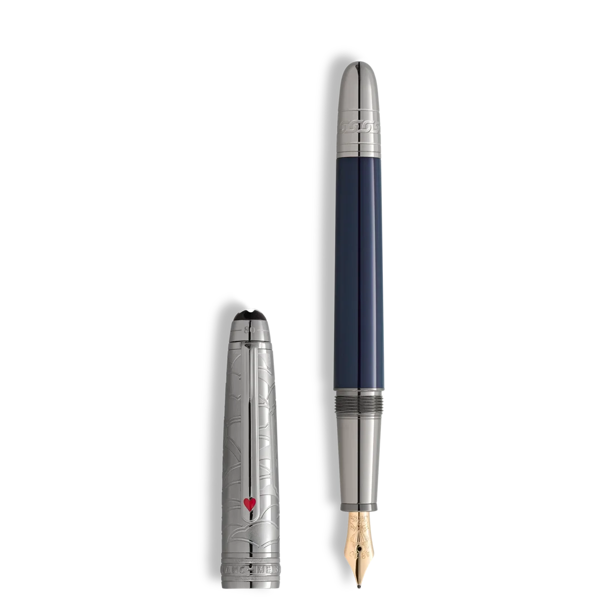 Meisterstück Around the World in 80 Days-kollektionen er inspireret af Jules Vernes berømte eventyrroman. Solitaire Doué Classique fyldepen, dekoreret med poleret mørkeblå ædel lak og metalhætte, fortæller om Mr. Fogg og Passepartouts episke rejse. På den sidste etape fra Yokohama tilbage til London via USA krydser de to det store amerikanske kontinent med tog. Dyk ned i de intrikate detaljer – et tog, der er elegant indgraveret på hætten, et sikkerhedskædemønster på keglen, der afspejler et afgørende øjeblik, hvor Passepartout kobler toget fra lokomotivet for at redde besætningen, der blev angrebet af Sioux.Kappens design fanger trykventilerne og lokomotivets bølgende røg, mens klipsen prydes af et rødt lakeret hjerterkort, der symboliserer foreningen mellem Phileas Fogg og prinsesse Aouda. Derudover repræsenterer kortfarverne Foggs dristige væddemål om at gennemføre rejsen på blot 80 dage. Hatten har en præget tidslinje over rejsen – 36 dage fra Yokohama til London, der kulminerer i den samlede tid på 80 dage rundt om jorden.Dette skriveinstrument er foræret med en håndlavet 18K guldspids mærket med 14/11 og 21/12 – en påmindelse om Mr. Foggs afrejse fra Yokohama den 14. november og hans ambitiøse plan om at vende tilbage til klubben i London inden den 21. december for at vinde væddemålet. Den er også prydet med en afbildning af en luftballon, en reference til Jules Vernes første eventyrroman. Identifikationsnummer MB132892 Fysisk vægt 50,14 g Dimensioner 139,8 mm * 14 mm