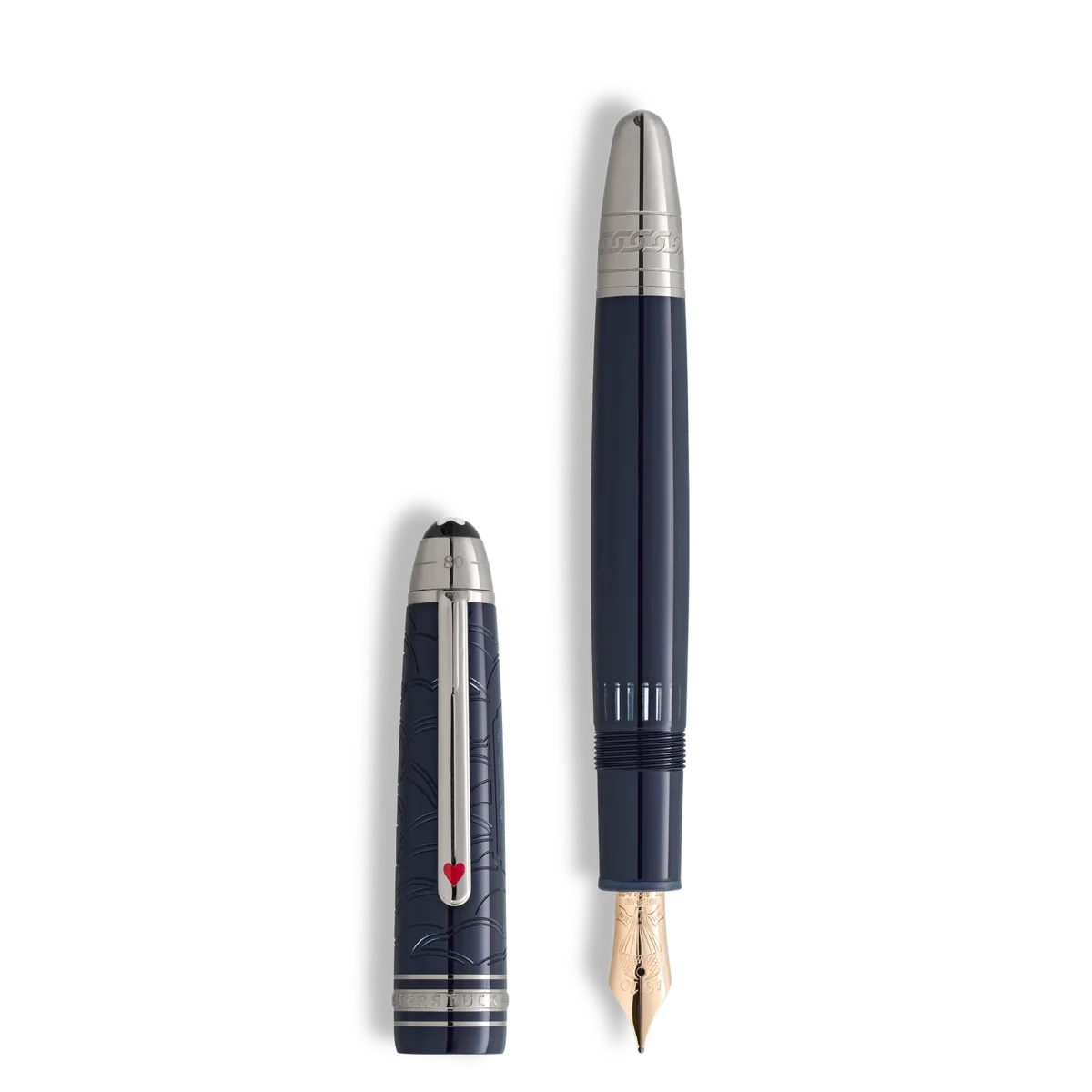 Meisterstück Around the World in 80 Days-kollektionen er inspireret af Jules Vernes berømte eventyrroman. LeGrand fyldepen, der er prydet med mørkeblå ædelharpiks, fortæller om Mr. Fogg og Passepartouts episke rejse. På den sidste etape fra Yokohama tilbage til London via USA krydser de to det store amerikanske kontinent med tog. Dyk ned i de intrikate detaljer – et tog, der er elegant indgraveret på hætten, et sikkerhedskædemønster på keglen, der afspejler et afgørende øjeblik, hvor Passepartout kobler toget fra lokomotivet for at redde besætningen, der blev angrebet af Sioux.Kappens design fanger trykventilerne og lokomotivets bølgende røg, mens klipsen prydes af et rødt lakeret hjerterkort, der symboliserer foreningen mellem Phileas Fogg og prinsesse Aouda. Derudover repræsenterer kortfarverne Foggs dristige væddemål om at gennemføre rejsen på blot 80 dage. Hatten har en præget tidslinje over rejsen – 36 dage fra Yokohama til London, der kulminerer i den samlede tid på 80 dage rundt om jorden.Dette skriveinstrument er foræret med en håndlavet 14K guldspids mærket med 14/11 og 21/12 – en påmindelse om Mr. Foggs afrejse fra Yokohama den 14. november og hans ambitiøse plan om at vende tilbage til klubben i London inden den 21. december for at vinde væddemålet. Den er også prydet med en afbildning af en luftballon, en reference til Jules Vernes første eventyrroman. Identifikationsnummer MB132874 Fysisk vægt 29,891 g Dimensioner 146,1 mm * 17,8 mm