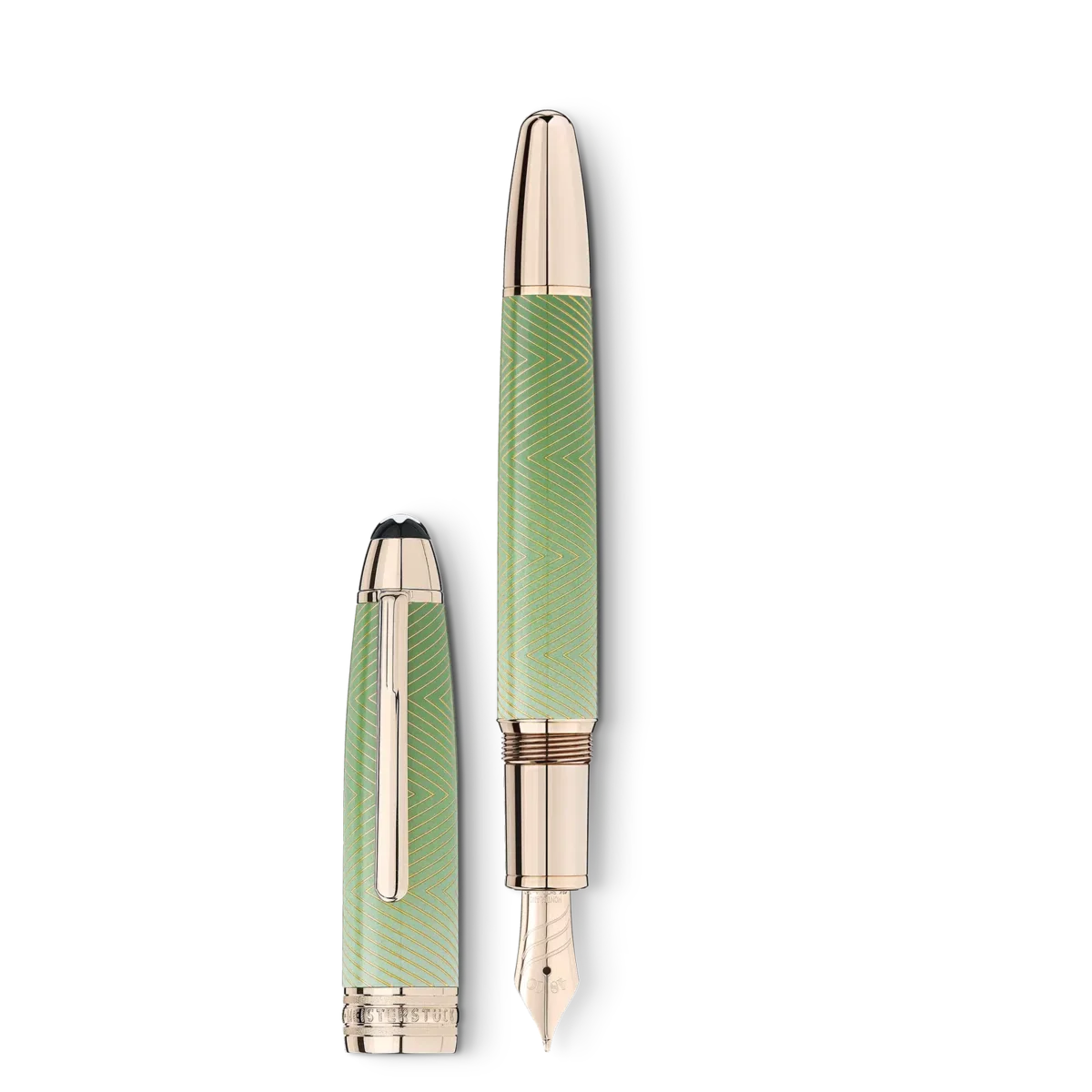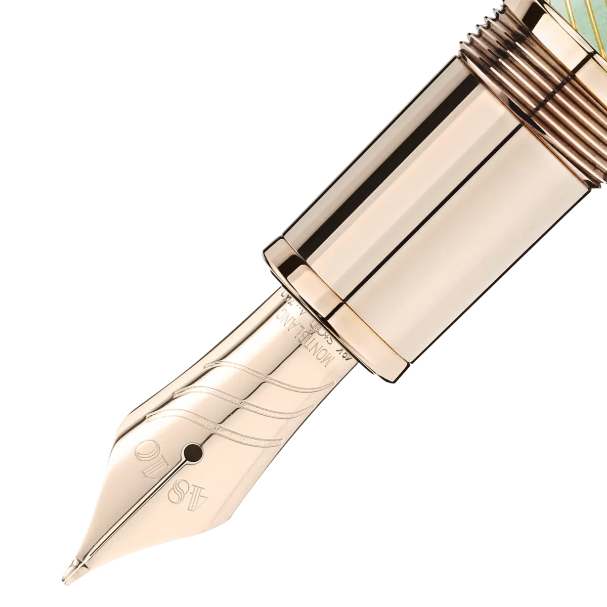Meisterstück Calligraphy Solitaire Celadon Dégradé fyldepen er inspireret af mødet mellem kunst og skrivning. Dette stykke er en moderne hyldest til nogle af de mest berømte og tidløse kinesiske håndværk: celadon-porcelæn og bambusfletning. Skriveinstrumentet i celadonfarvet gradientlak er afrundet med den karakteristiske guldbelagte klips og beslag. Fyldepen er kronet med den innovative buede penne, der er håndlavet i Au750 / 18K massivt guld og pyntet med tre fine parallelle linjer, et symbol inspireret af kalligrafiens bevægelser. Den buede penne spids giver mulighed for en række forskellige skrivestilarter og linjebredder, afhængigt af vinklen og retningen, som skriveinstrumentet holdes i. Med signaturguld og/eller signaturguldbelægning beskriver Montblanc den oplyste nuance af gult guld, som er blevet en værdsat tone for Maison’s skriveinstrumenter.
