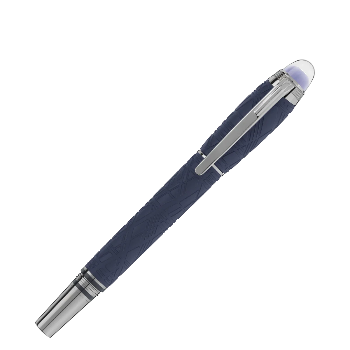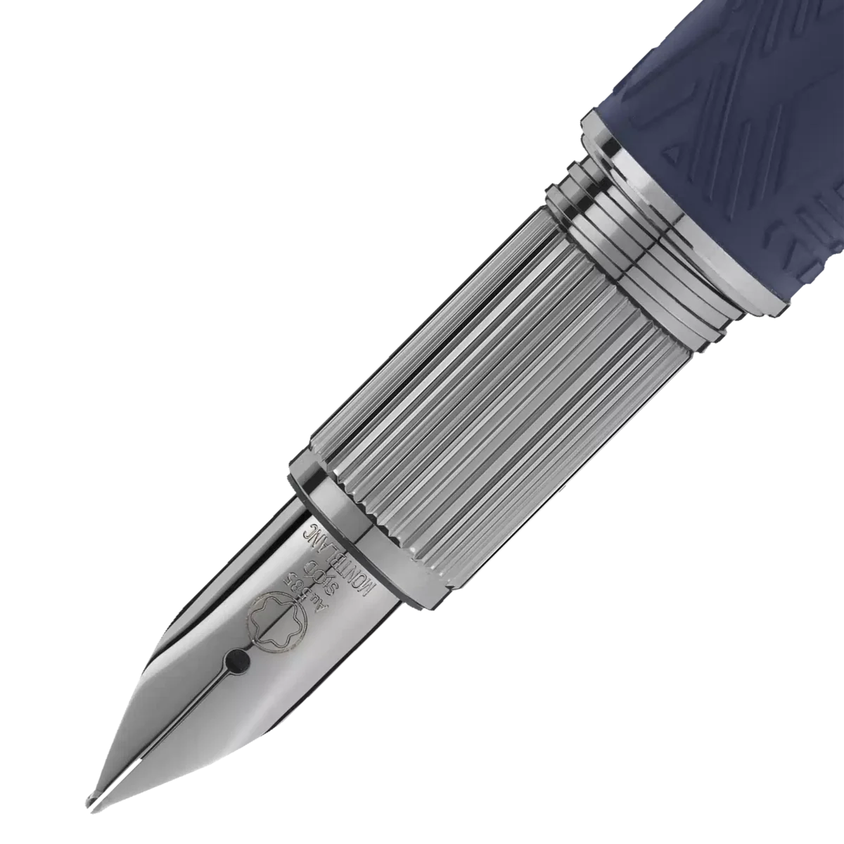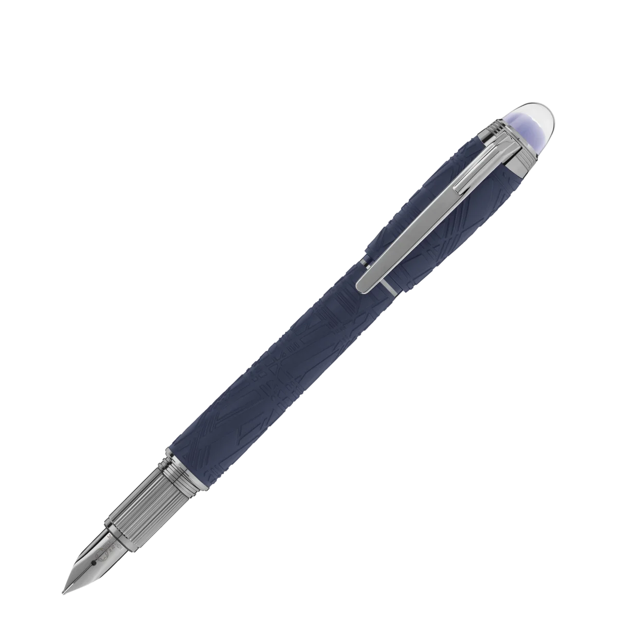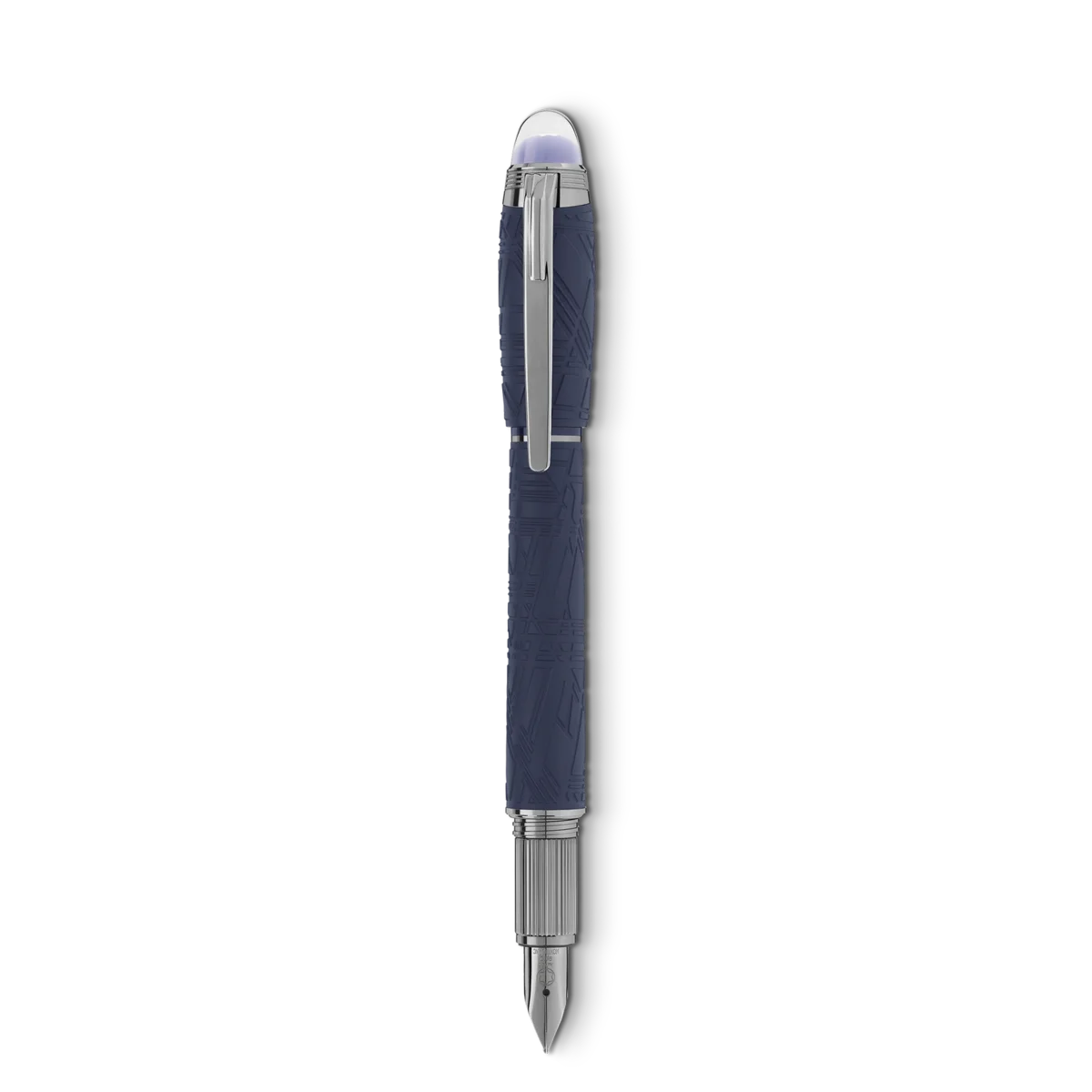 StarWalker SpaceBlue ser ud over planeten Jorden og vender sig mod stjernerne og galaksen. Denne nye StarWalker-kollektion giver harpikshatten og -skaftet et nyt look med et design, der minder om de indviklede strukturer i Widmanstätten-mønsteret, en af naturens mest hypnotiske skabninger. Alle metaldele er belagt med mørkt ruthenium, ledsaget af en dyb rumblå tone til den matte ædle harpiks, der minder om nuancerne i en stjernehimmel. Derudover kommer subdomen på hætten, hvor Montblanc-emblemet svæver, i en dyb rumblå farve. Fyldepennen er håndlavet med en rutheniumbelagt Au 585 guldspids. Identifikationsnummer MB130210 Fysisk vægt 28,3 g Dimensioner 135,7 mm * 14,9 mm