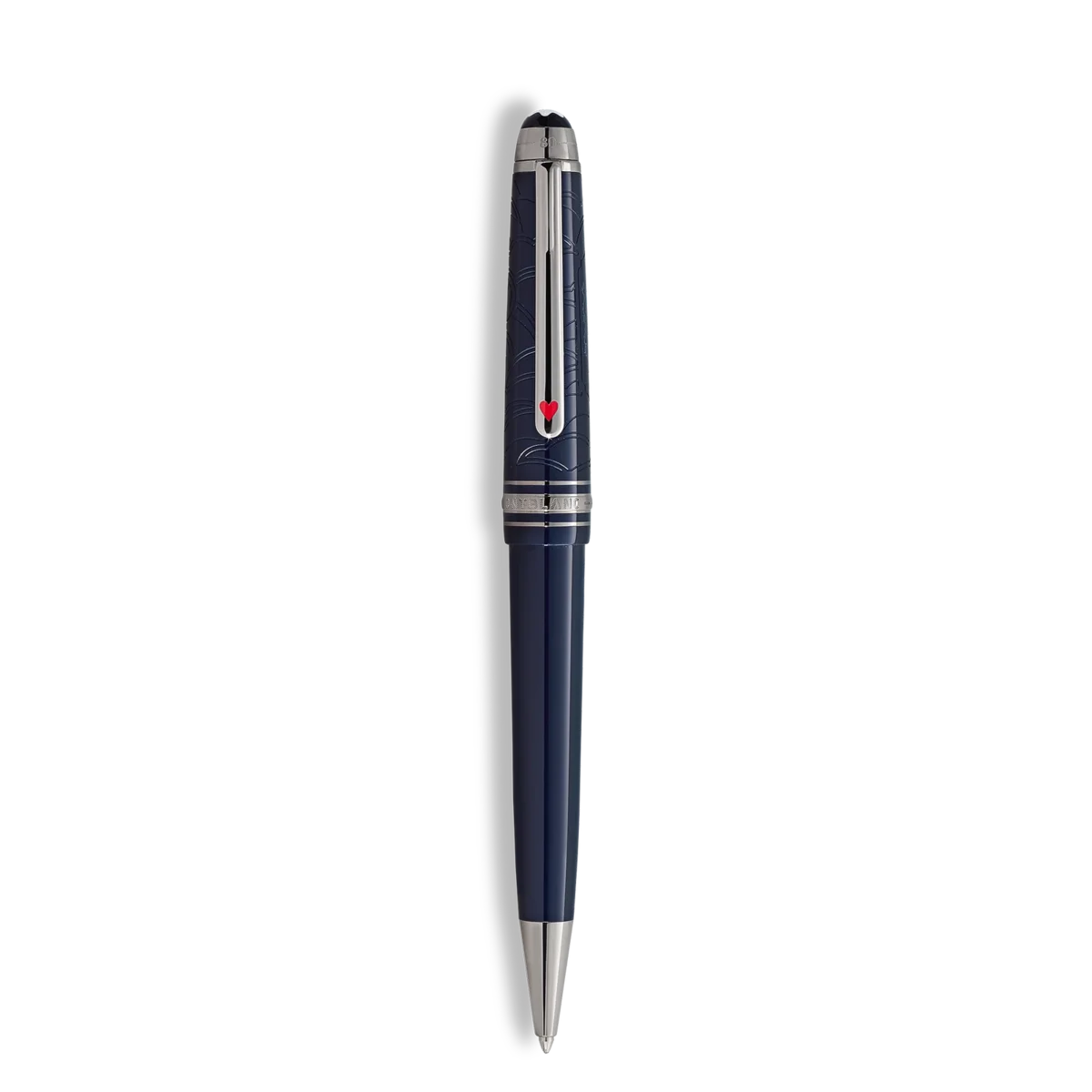 Meisterstück Around the World in 80 Days-kollektionen er inspireret af Jules Vernes berømte eventyrroman. Classique kuglepennen, der er prydet med mørkeblå ædelharpiks, fortæller om Mr. Fogg og Passepartouts episke rejse. Da de begiver sig ud på den sidste etape fra Yokohama tilbage til London via USA, krydser de to det store amerikanske kontinent med tog. Dyk ned i de intrikate detaljer – et tog, der er elegant indgraveret på hætten, et sikkerhedskædemønster på keglen, der afspejler et afgørende øjeblik, hvor Passepartout kobler toget fra lokomotivet for at redde besætningen, der blev angrebet af Sioux.Kappens design fanger trykventilerne og lokomotivets bølgende røg, mens klipsen prydes af et rødt lakeret hjerterkort, der symboliserer foreningen mellem Phileas Fogg og prinsesse Aouda. Derudover repræsenterer kortfarverne Foggs dristige væddemål om at gennemføre rejsen på blot 80 dage. På toppen af kasketten er rejsen tidslinje præget – 36 dage fra Yokohama til London, der kulminerer i den samlede tid på 80 dage rundt om jorden.