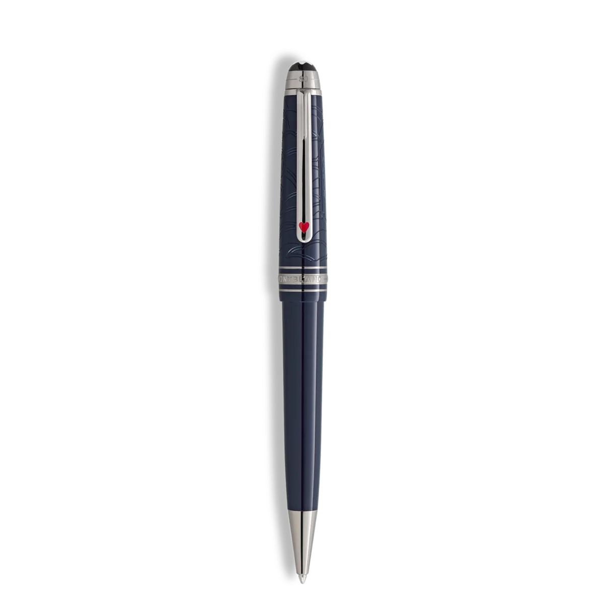 Meisterstück Around the World in 80 Days-kollektionen er inspireret af Jules Vernes berømte eventyrroman. LeGrand kuglepennen, der er prydet med mørkeblå ædelharpiks, fortæller om Mr. Fogg og Passepartouts episke rejse. På den sidste etape fra Yokohama tilbage til London via USA krydser de to det store amerikanske kontinent med tog. Dyk ned i de intrikate detaljer – et tog, der er elegant indgraveret på hætten, et sikkerhedskædemønster på keglen, der afspejler et afgørende øjeblik, hvor Passepartout kobler toget fra lokomotivet for at redde besætningen, der blev angrebet af Sioux.Kappens design fanger trykventilerne og lokomotivets bølgende røg, mens klipsen prydes af et rødt lakeret hjerterkort, der symboliserer foreningen mellem Phileas Fogg og prinsesse Aouda. Derudover repræsenterer kortfarverne Foggs dristige væddemål om at gennemføre rejsen på blot 80 dage. På toppen af kasketten er rejsen tidslinje præget – 36 dage fra Yokohama til London, der kulminerer i den samlede tid på 80 dage rundt om jorden.