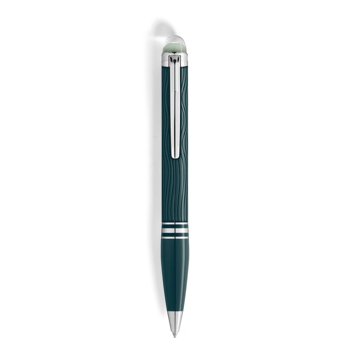 StarWalker PolarGreen bringer nordlysets skønhed til live. På Jorden kan mennesker kigge op mod himlen og blive transporteret til et eventyrligt rige, når de er vidne til det storslåede skue. Kuppelen på hætten er lavet af gennemsigtig harpiks og lyser i svagt lys, hvilket minder om de fortryllende dansende nordlys på nattehimlen. Bølgemønsteret på den mørkegrønne ædle harpiks på hætten og skaftet fanger på fornem vis lysets spektrale glans, og den matte finish fremhæver de smukke refleksioner. De mørkegrønne harpiksringe på forenden fremhæver kuglepennenes platinbelagte beslag. Identifikationsnummer MB132904 Fysisk vægt 31,6 g Dimensioner 134,5 mm * 13,1 mm