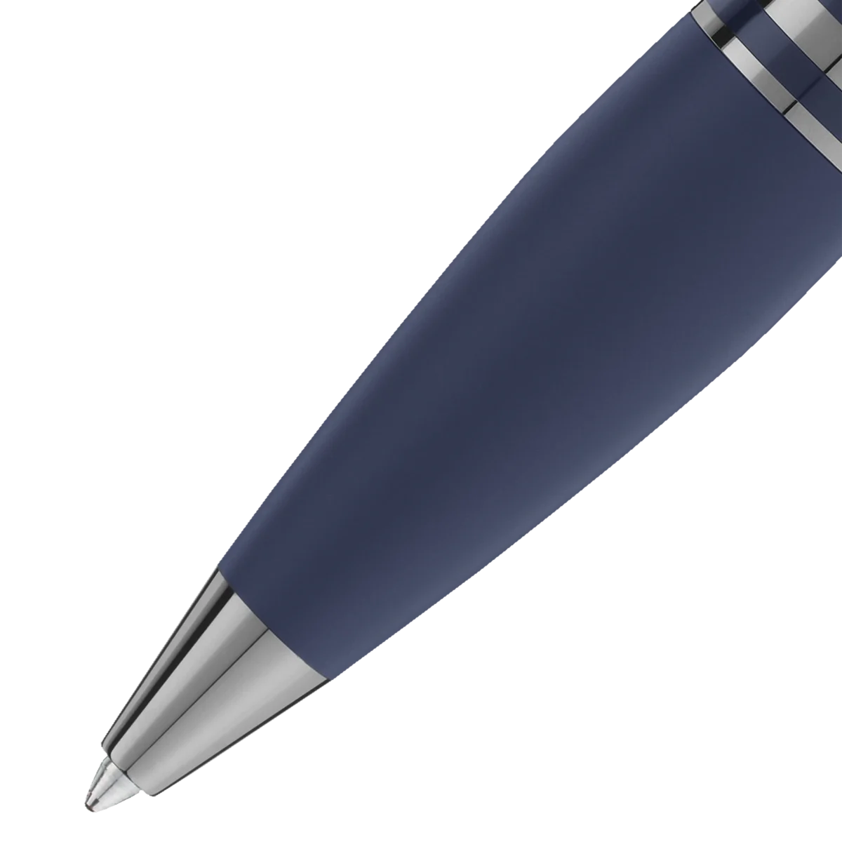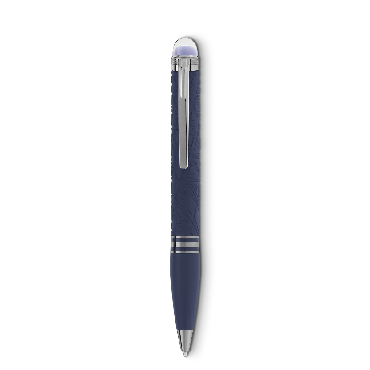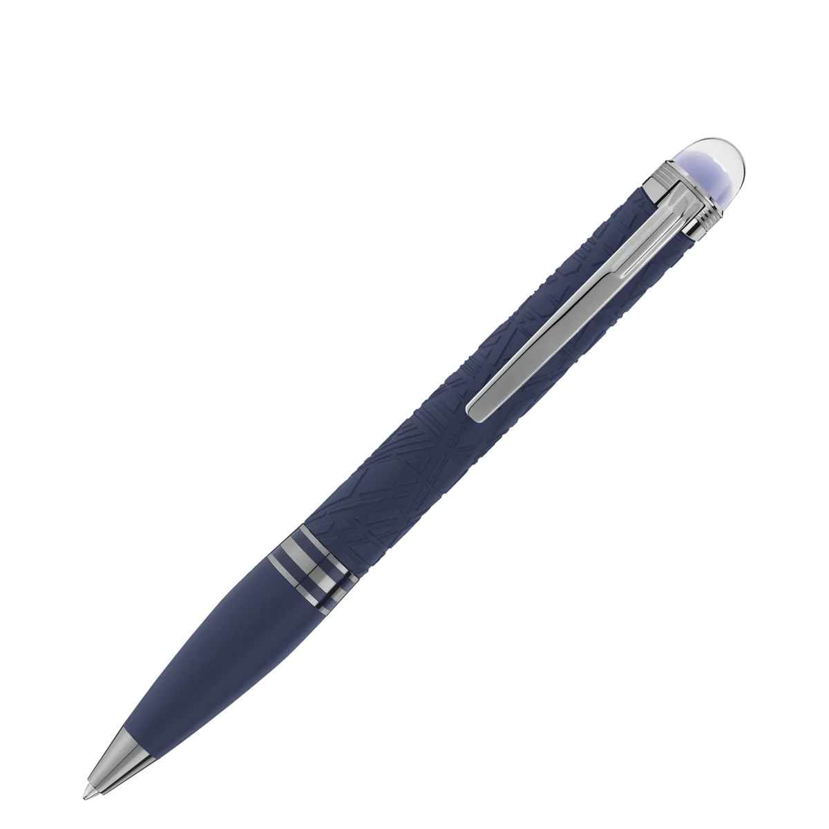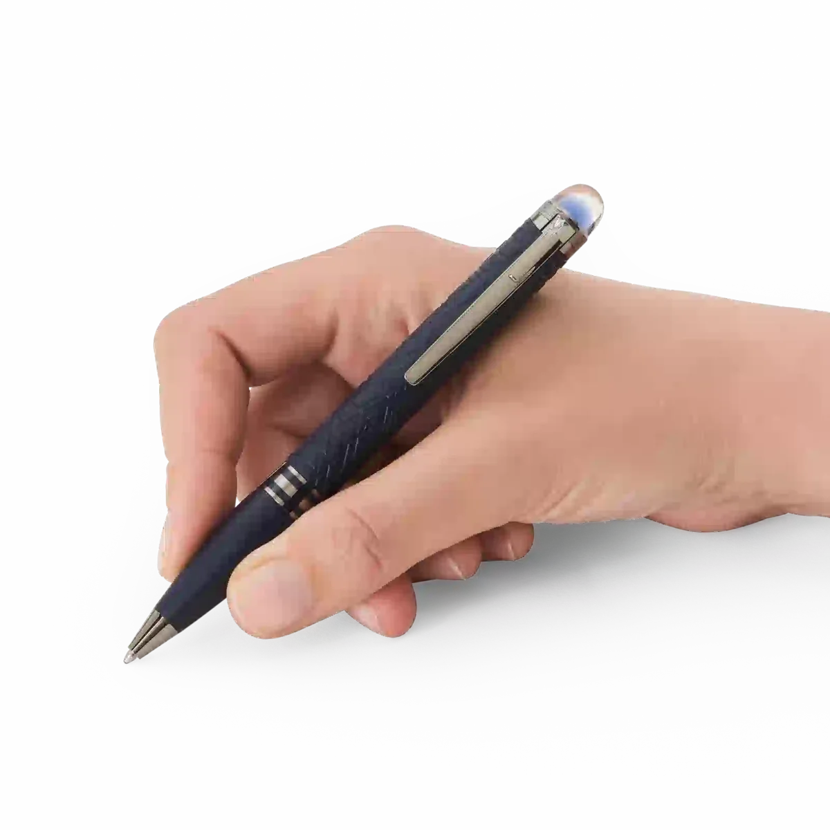 StarWalker SpaceBlue ser ud over planeten Jorden og vender sig mod stjernerne og galaksen. Denne nye StarWalker-kollektion giver harpiksstammen et nyt look med et design, der minder om de indviklede strukturer i Widmanstätten-mønsteret, en af naturens mest hypnotiske skabninger. Alle metaldele er belagt med mørkt ruthenium, ledsaget af en dyb rumblå tone til den matte ædle harpiks, der minder om nuancerne i en stjernehimmel. Derudover er subdomen på hætten, hvor Montblanc-emblemet svæver, udført i en dyb rumsblå farve. Identifikationsnummer MB130213 Fysisk vægt 31,6 g Dimensioner 134,5 mm * 13,1 mm