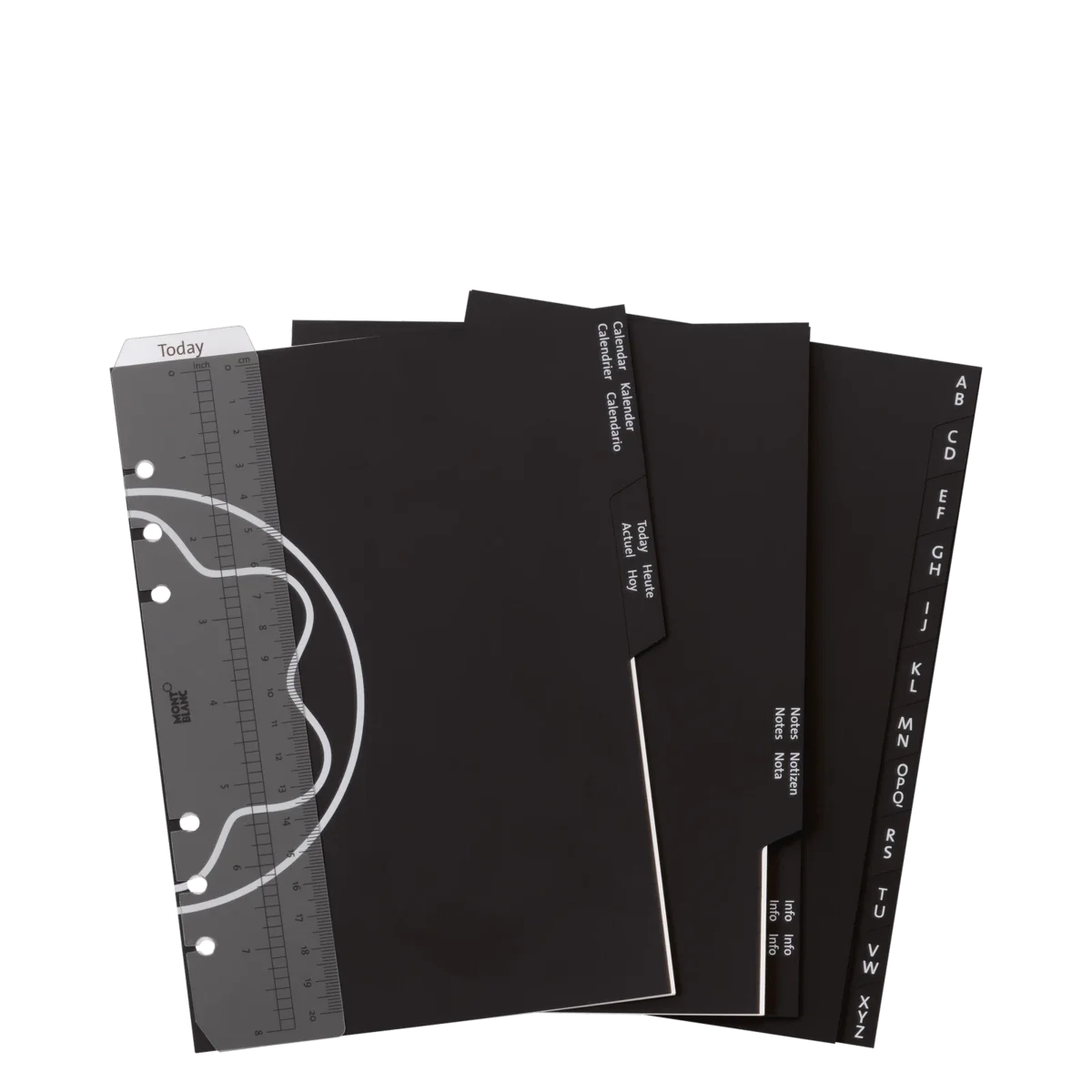 Starterkit Large. Sæt med skilleark, blanke ark, adresseark, verdenskort, internationale landekoder, oversigt over butikker, lineal og 2 klare plastlommer til alle store Montblanc-agenter.