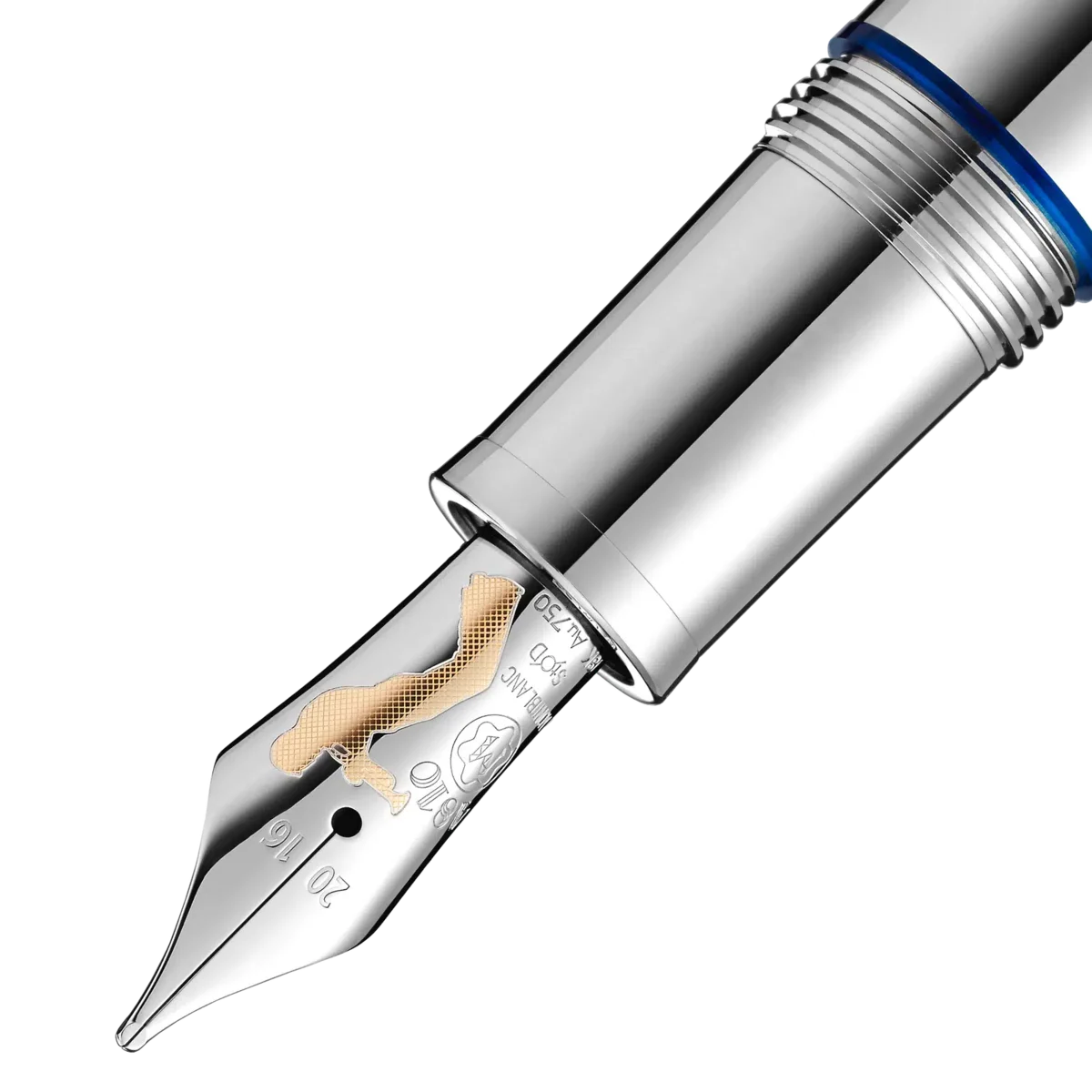 Denne Great Characters Edition hylder en af de mest revolutionerende og indflydelsesrige jazzmusikere gennem tiderne – Miles Dewey Davis. Han var ikke kun en trompetist med en enestående lyd, men også en pioner i stort set alle faser af udviklingen af amerikansk jazz efter 2. verdenskrig, fra cool jazz til rock-jazz-funk-fusion, der førte til hans optagelse i Rock & Roll Hall of Fame. Den overordnede form på Limited Edition 1926 afspejler trompeten, hvilket fremhæves gennem trompetfingerknapperne på klipsen. Den unikke, raffinerede gravering på cylinderen er inspireret af de vigtigste faser i udviklingen af amerikansk jazz efter 2. verdenskrig, som Miles Davis havde indflydelse på. Den blå kegle minder om “Kind of Blue”, det største jazzalbum nogensinde. Keglens form stammer fra det specielle “Heim”-mundstykke, han brugte til at spille på. Pennen er graveret med hans silhuet, og den begrænsede udgave på 1926 eksemplarer afspejler hans fødselsår. Identifikationsnummer: MB114191 Fysisk vægt: 88,65 g Dimensioner: 145 mm * 16 mm * 16 mm