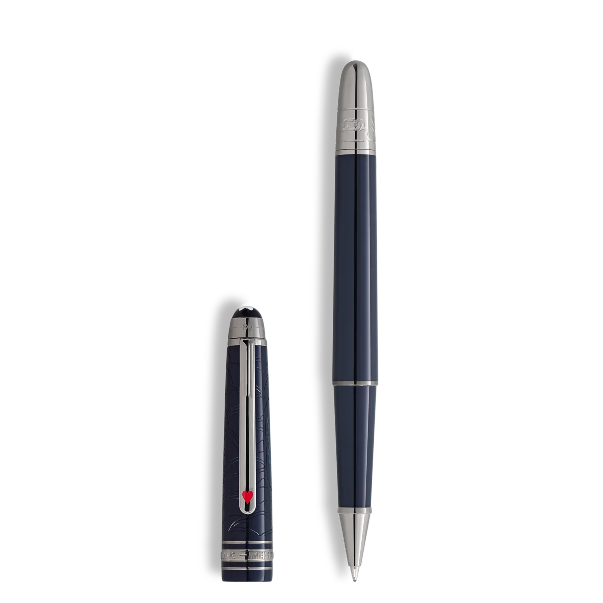 Meisterstück Around the World in 80 Days-kollektionen er inspireret af Jules Vernes berømte eventyrroman. Classique Rollerball, prydet med mørkeblå ædelharpiks, fortæller om Mr. Fogg og Passepartouts episke rejse. På den sidste etape fra Yokohama tilbage til London via USA krydser de to det store amerikanske kontinent med tog. Dyk ned i de intrikate detaljer – et tog, der er elegant indgraveret på hætten, et sikkerhedskædemønster på keglen, der afspejler et afgørende øjeblik, hvor Passepartout kobler toget fra lokomotivet for at redde besætningen, der blev angrebet af Sioux.Kappens design fanger trykventilerne og lokomotivets bølgende røg, mens klipsen prydes af et rødt lakeret hjertekort, der symboliserer foreningen mellem Phileas Fogg og prinsesse Aouda. Derudover repræsenterer kortene Foggs dristige væddemål om at gennemføre rejsen på blot 80 dage. På toppen af kasketten er rejsen tidslinje præget – 36 dage fra Yokohama til London, der kulminerer i den samlede tid på 80 dage rundt om jorden.