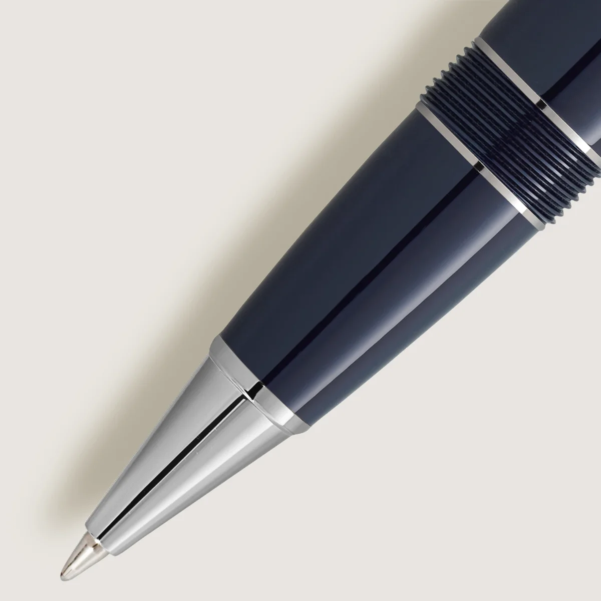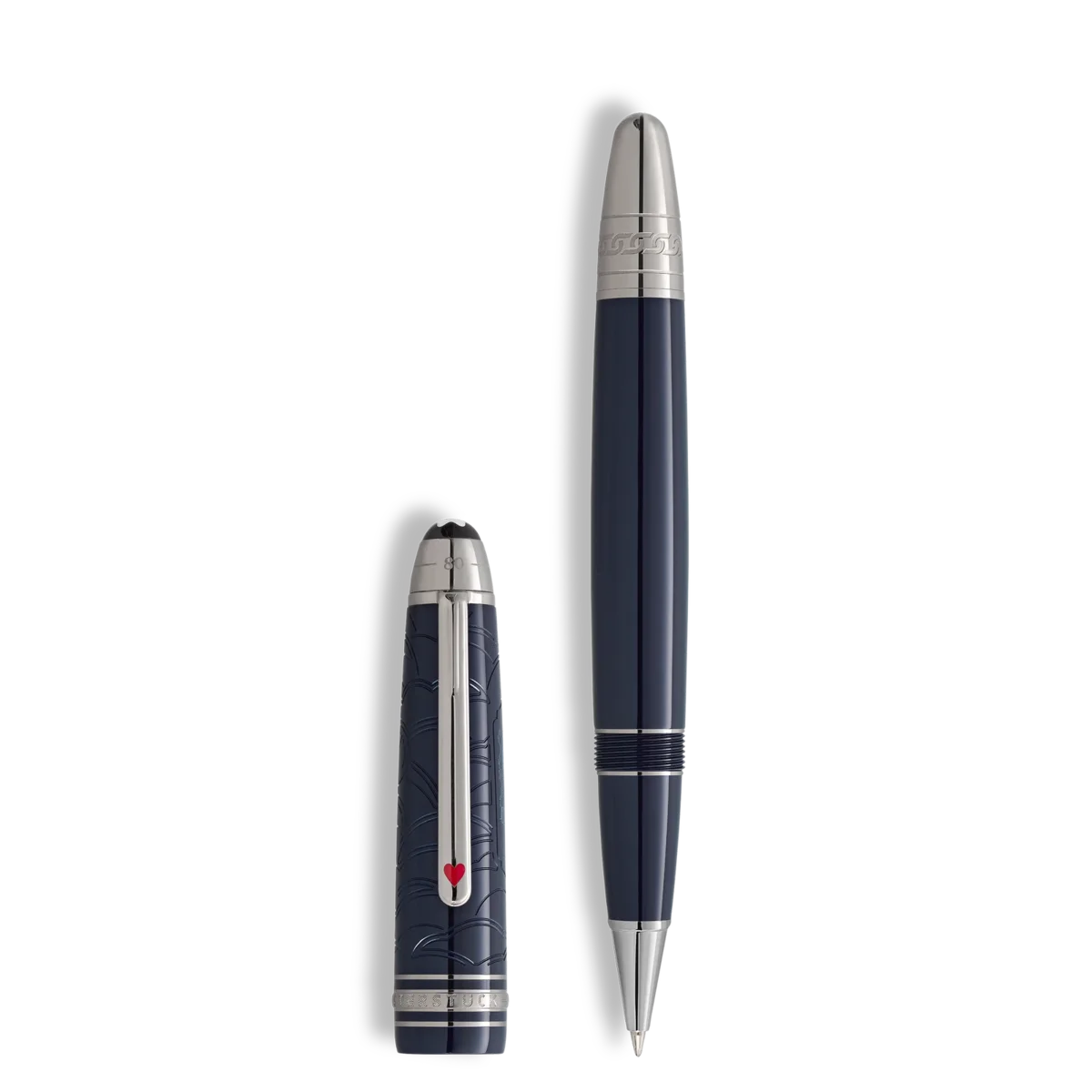 Meisterstück Around the World in 80 Days-kollektionen er inspireret af Jules Vernes berømte eventyrroman. LeGrand Rollerball, prydet med mørkeblå ædelharpiks, fortæller om Mr. Fogg og Passepartouts episke rejse. På den sidste etape fra Yokohama tilbage til London via USA krydser de to det store amerikanske kontinent med tog. Dyk ned i de intrikate detaljer – et tog, der er elegant indgraveret på hætten, et sikkerhedskædemønster på keglen, der afspejler et afgørende øjeblik, hvor Passepartout kobler toget fra lokomotivet for at redde besætningen, der blev angrebet af Sioux.Kappens design fanger trykventilerne og lokomotivets bølgende røg, mens klipsen prydes af et rødt lakeret hjerterkort, der symboliserer foreningen mellem Phileas Fogg og prinsesse Aouda. Derudover repræsenterer kortfarverne Foggs dristige væddemål om at gennemføre rejsen på blot 80 dage. På toppen af kasketten er rejsen tidslinje præget – 36 dage fra Yokohama til London, der kulminerer i den samlede tid på 80 dage rundt om jorden.