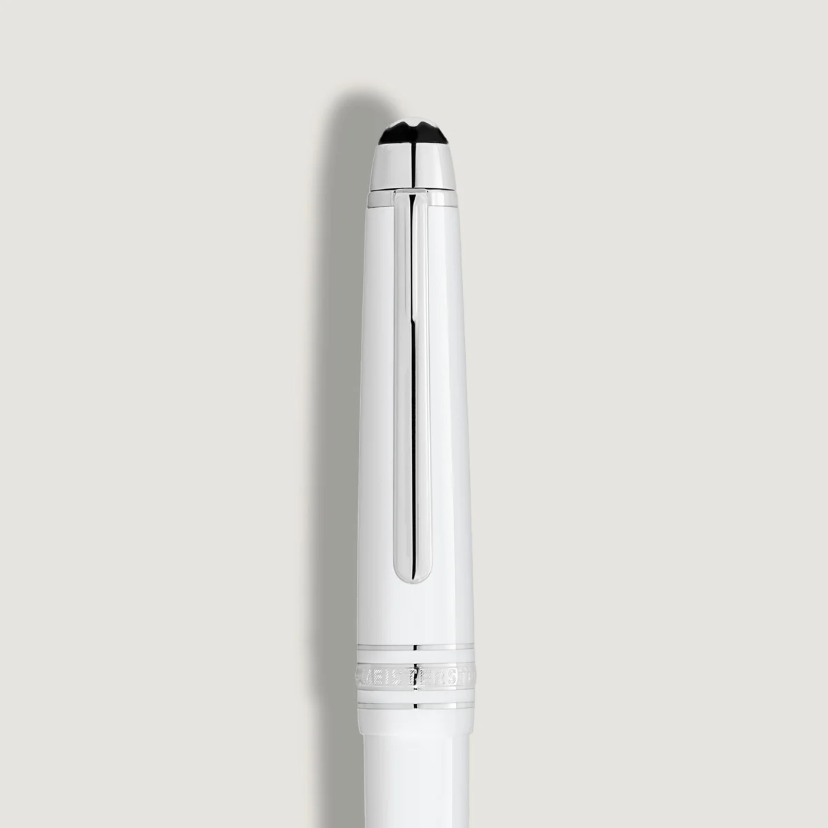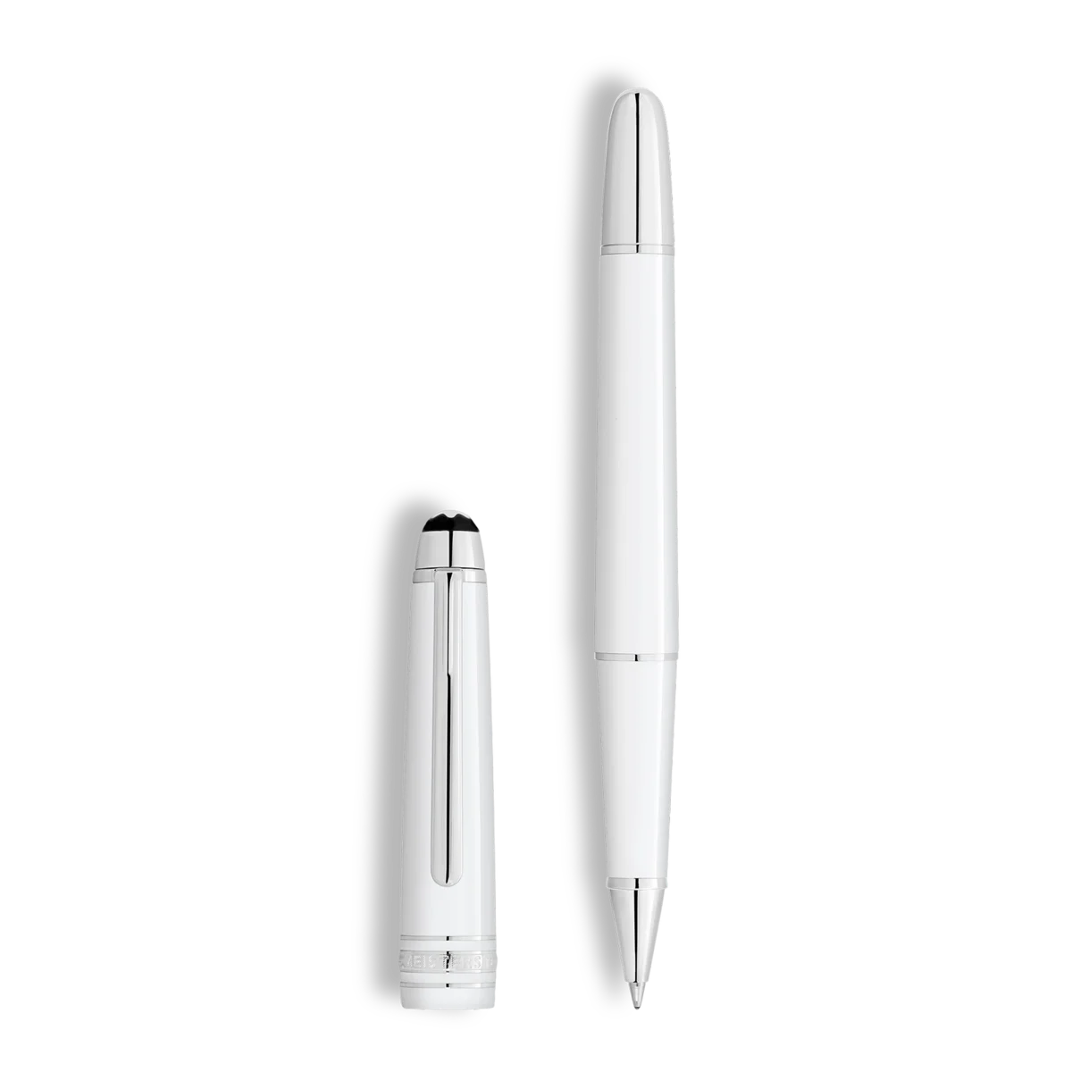 Meisterstück Classique Rollerball i hvid ædelharpiks med elegante platinbelagte beslag, kronet af det hvide Montblanc-emblem indlagt i hætten, udvikler sig til et karakteristisk designikon.