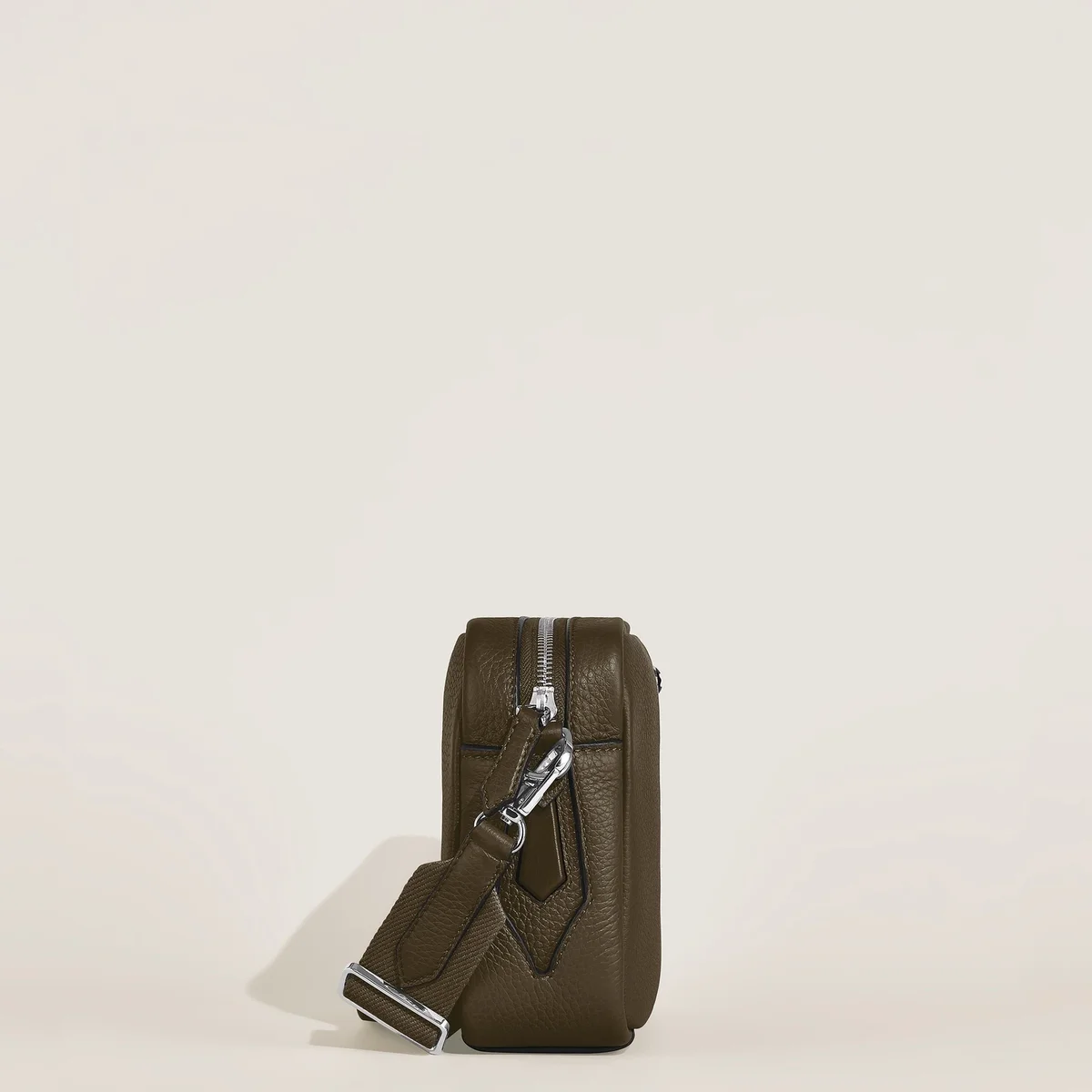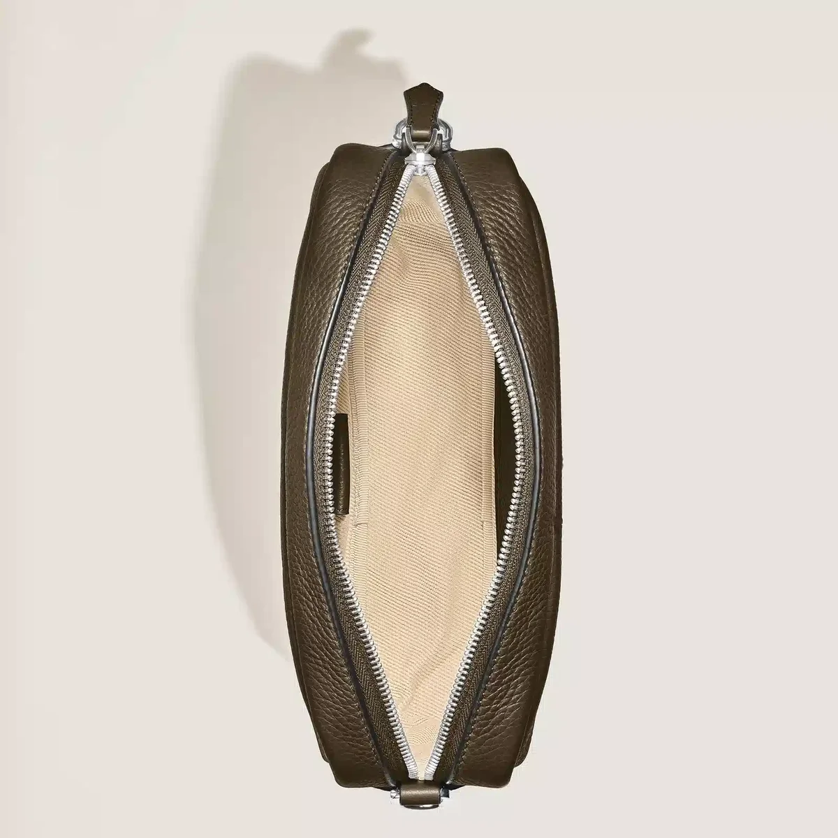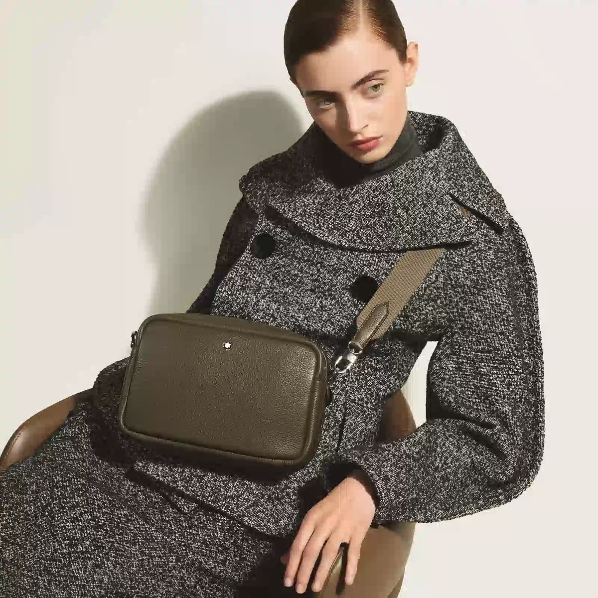 Denne lille crossbody-taske er fremstillet af blødt khaki-farvet kalveskind og har en rektangulær silhuet, der fremhæves af Meisterstück-læderdetaljer, herunder en markant lynlåstrækker i form af en penespids og raffinerede sadelsting, der minder om sporene efter en pen. Den er designet med henblik på praktisk anvendelighed og har et hovedrum med en åben lomme og to penneholdere, mens en aftagelig, justerbar skulderrem giver alsidige bæremuligheder med ubesværet stil.