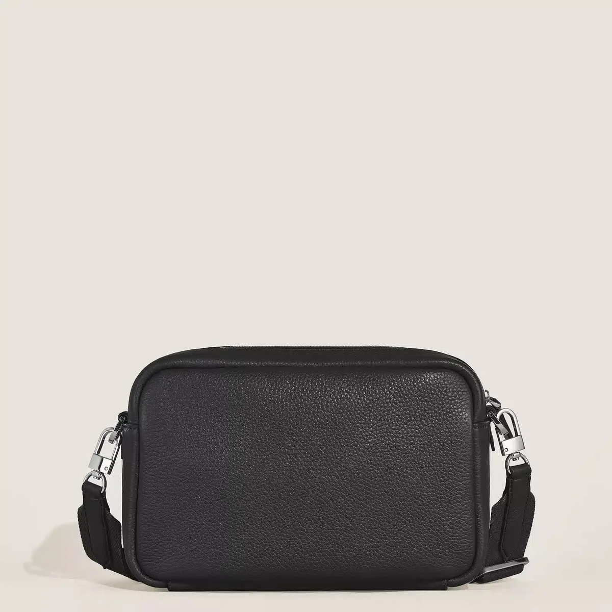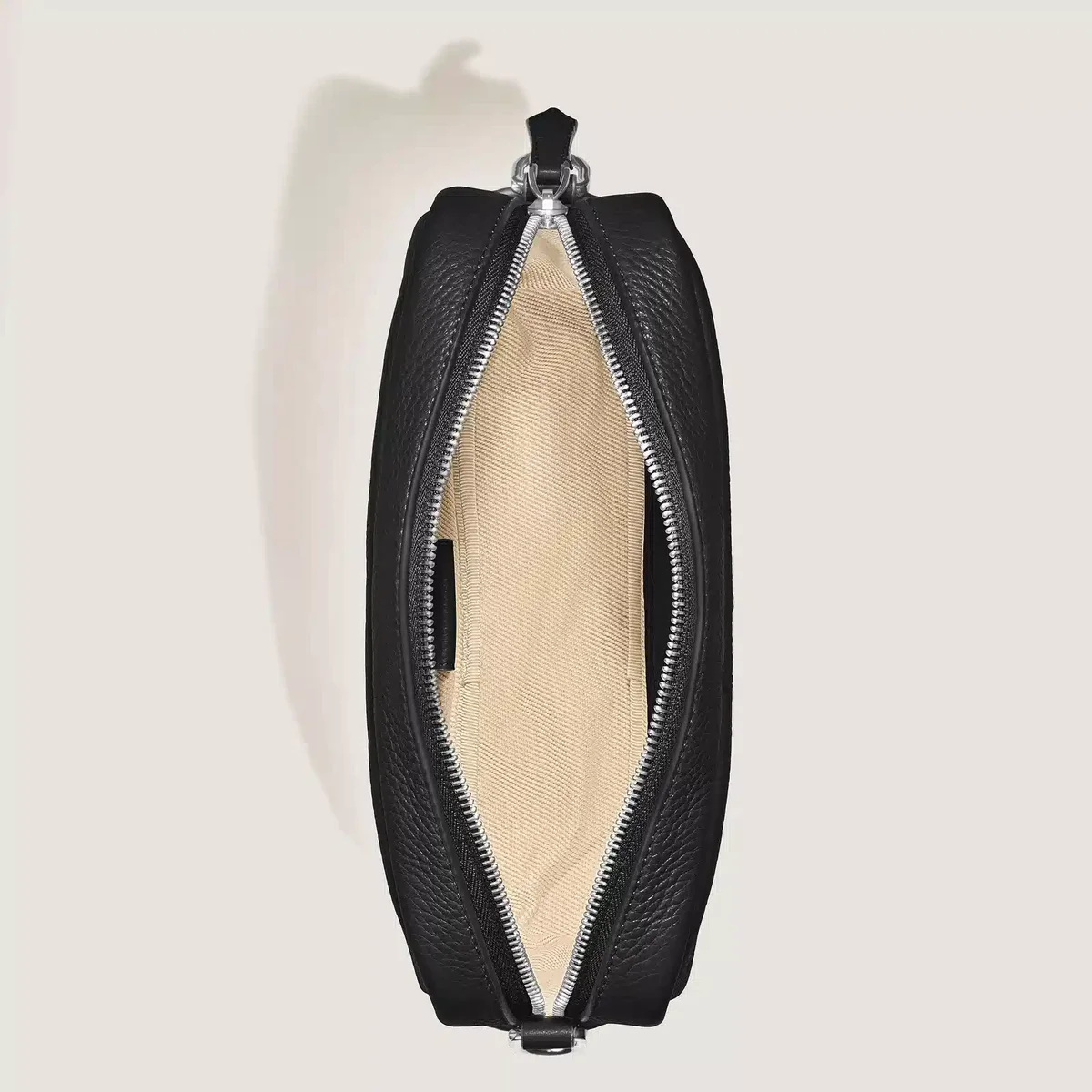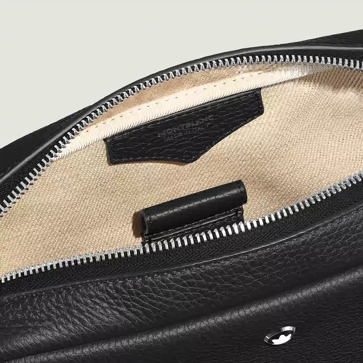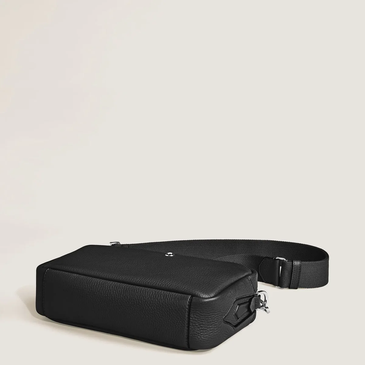Denne lille crossbody-taske er fremstillet af sort kornet kalveskind og har en rektangulær silhuet, der fremhæves af Meisterstück-læderdetaljer, herunder en markant lynlåstrækker i form af en penespids og raffinerede sadelsting, der minder om sporene efter en pen. Den er designet med henblik på praktisk anvendelighed og har et hovedrum med en åben lomme og to penneholdere, mens en aftagelig, justerbar skulderrem giver alsidige bæremuligheder med ubesværet stil.