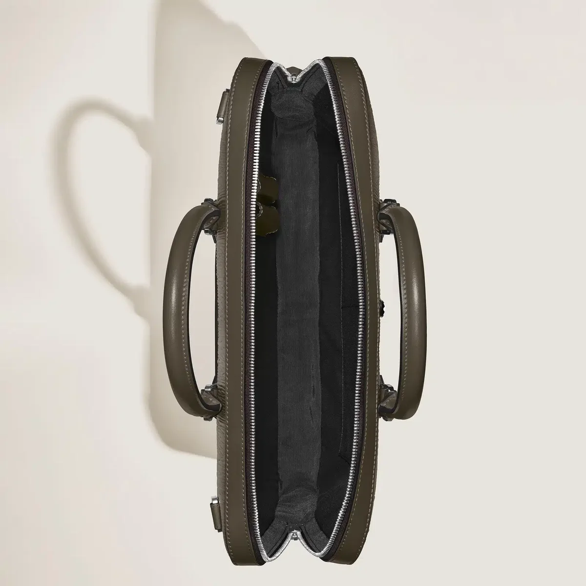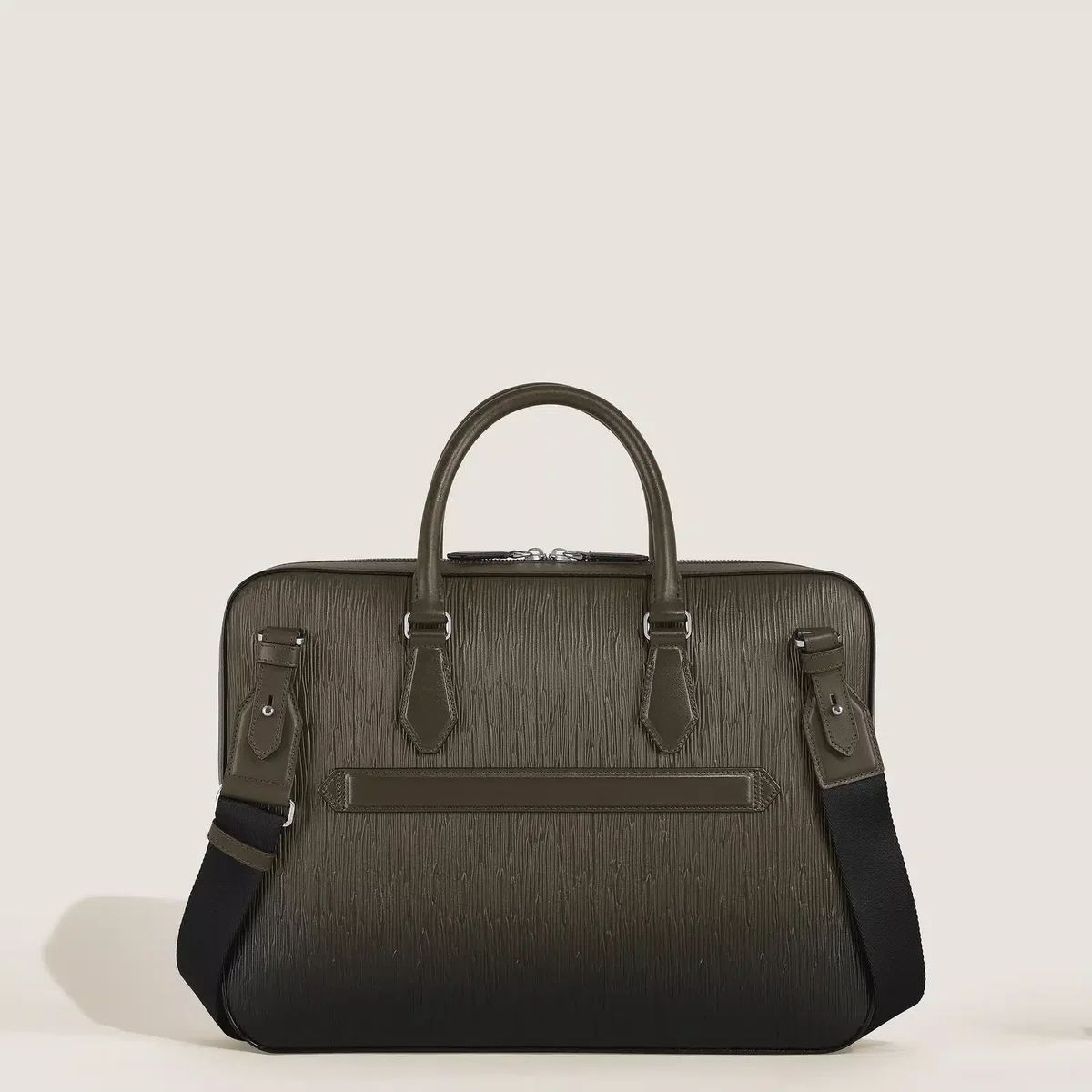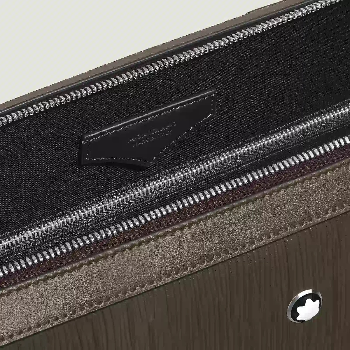 Denne elegante og rummelige tynde dokumentmappe hylder Montblancs tradition for skrivning med sit konvolutinspirerede design. Den er fremstillet af khaki Corteccia-læder, og det barkinspirerede motiv er opnået gennem varmprægning, mens en håndpåført sfumato-effekt skaber skygger for et raffineret, naturligt finish. Den er perfekt til forretningsartikler og har plads til elektroniske enheder og A4-dokumenter, mens den indvendige del har to åbne lommer og to løkker til skriveinstrumenter, hvilket kombinerer praktisk funktionalitet med tidløs stil.