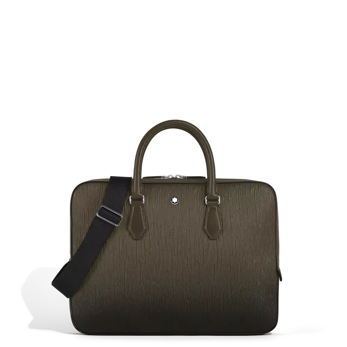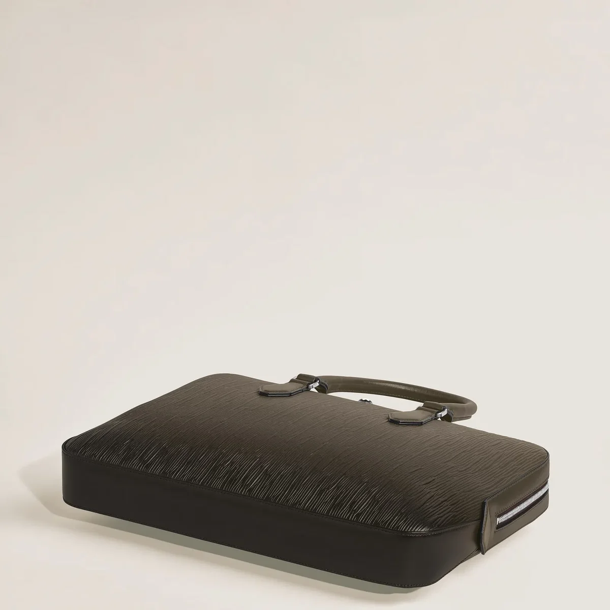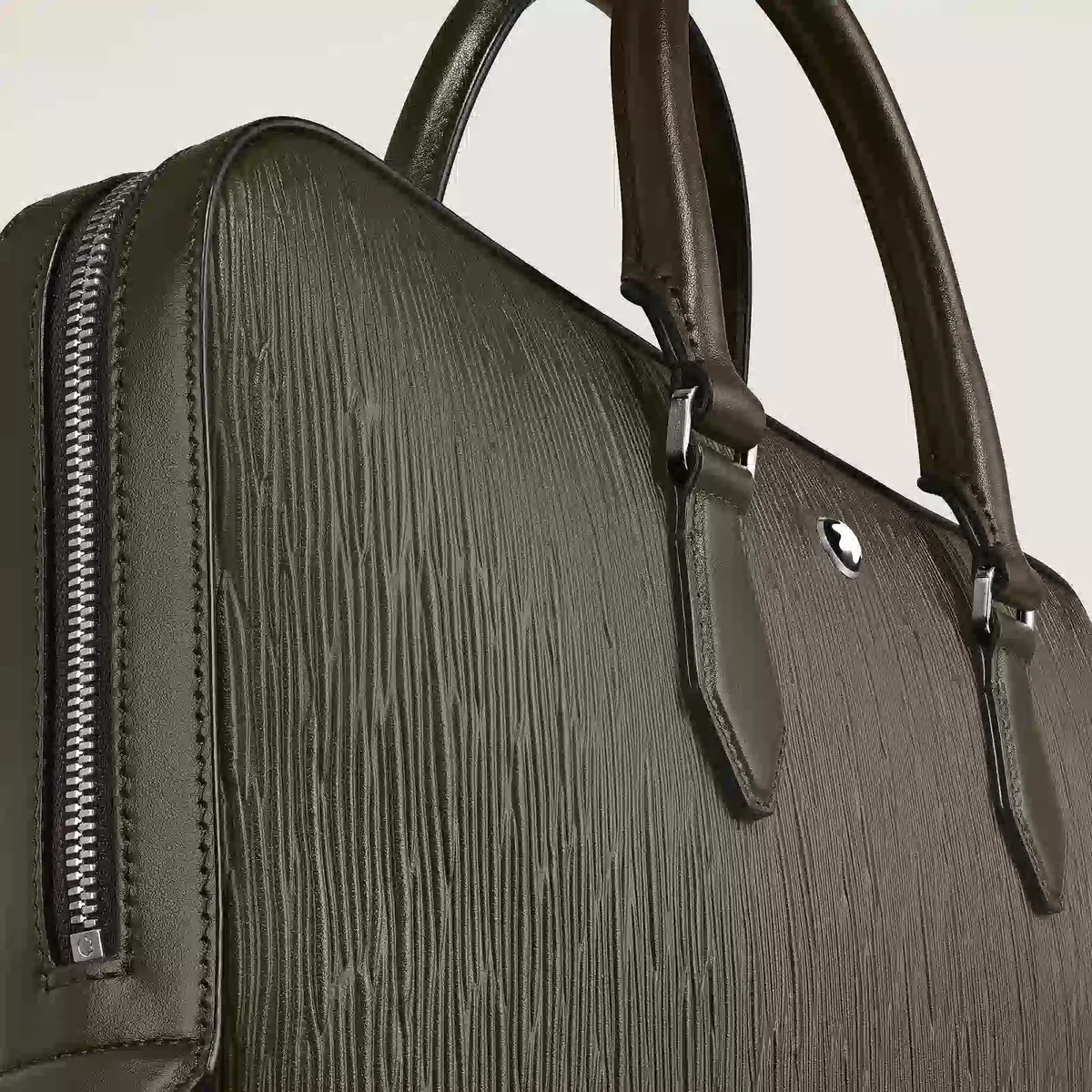 Denne elegante og rummelige tynde dokumentmappe hylder Montblancs tradition for skrivning med sit konvolutinspirerede design. Den er fremstillet af khaki Corteccia-læder, og det barkinspirerede motiv er opnået gennem varmprægning, mens en håndpåført sfumato-effekt skaber skygger for et raffineret, naturligt finish. Den er perfekt til forretningsartikler og har plads til elektroniske enheder og A4-dokumenter, mens den indvendige del har to åbne lommer og to løkker til skriveinstrumenter, hvilket kombinerer praktisk funktionalitet med tidløs stil.