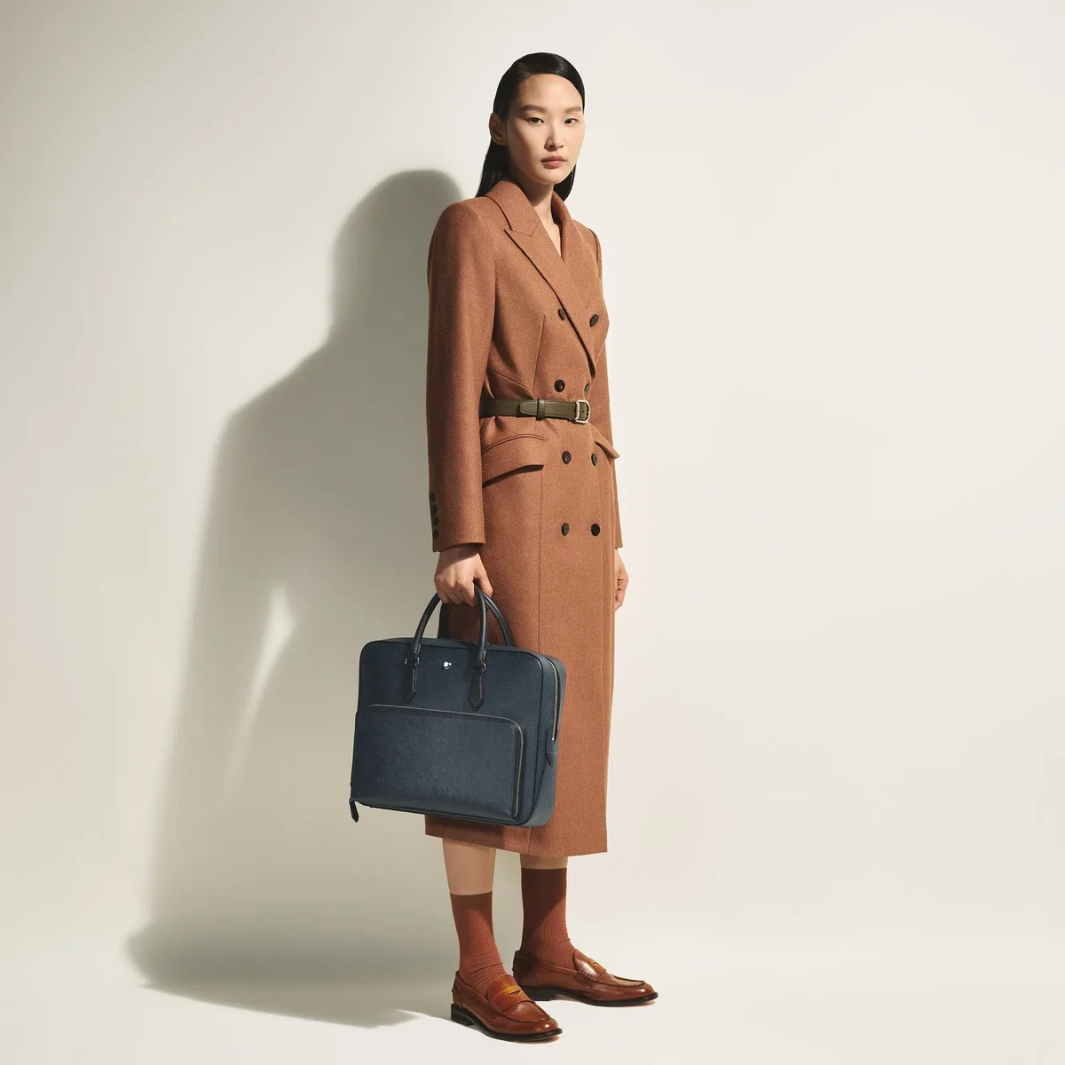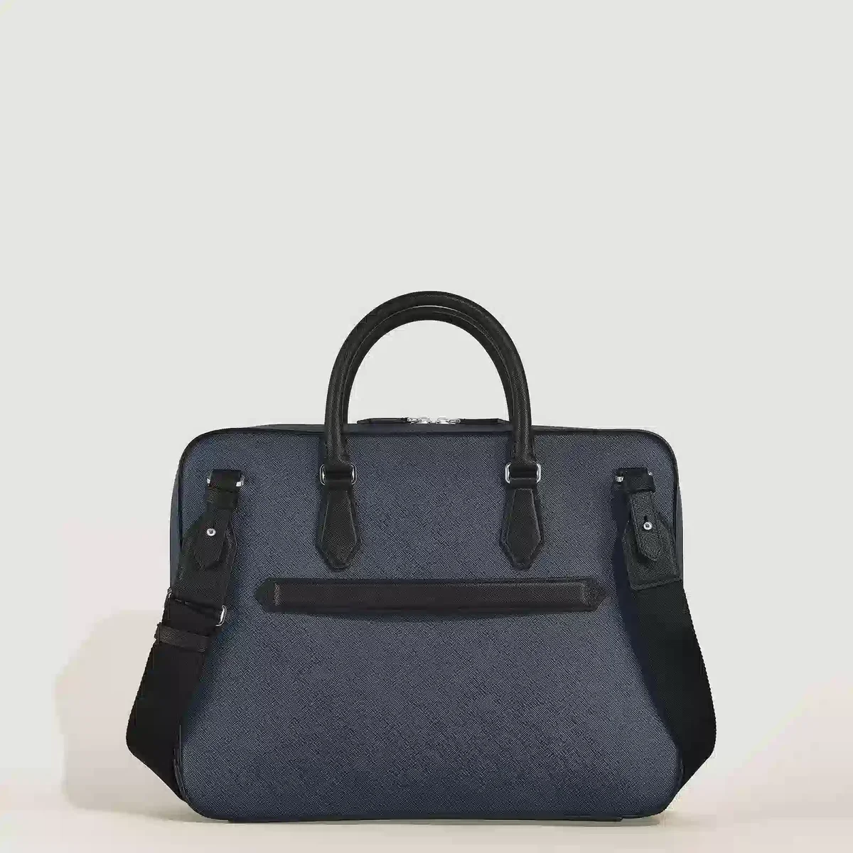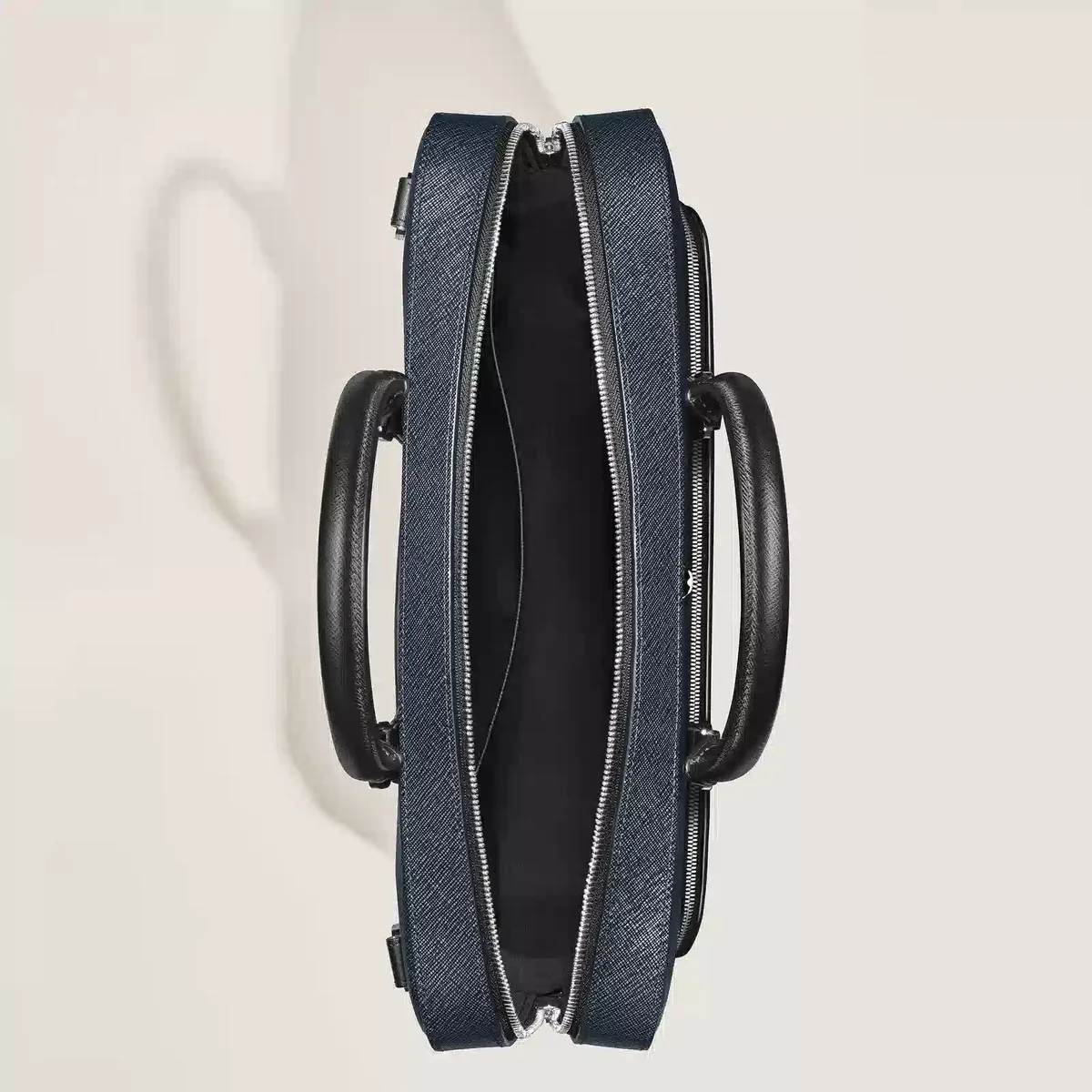 Denne elegante taske har et rummeligt hovedrum til transport af A4-dokumenter, bærbare computere op til 13″, elektroniske enheder og andre professionelle fornødenheder med stil. Den er fremstillet af tofarvet præget Sartorial-læder i sort og blåt og er omhyggeligt designet til forretningsbehov. Dine skriveinstrumenter kan opbevares i dedikerede løkker, mens andre ejendele kan opbevares sikkert i en lynlåslomme eller i de to ekstra åbne lommer.