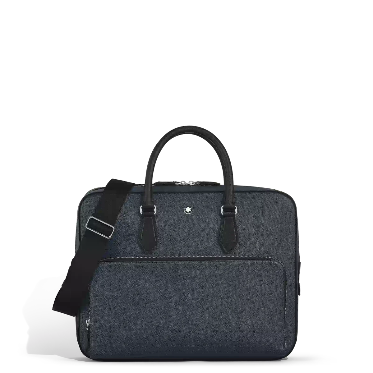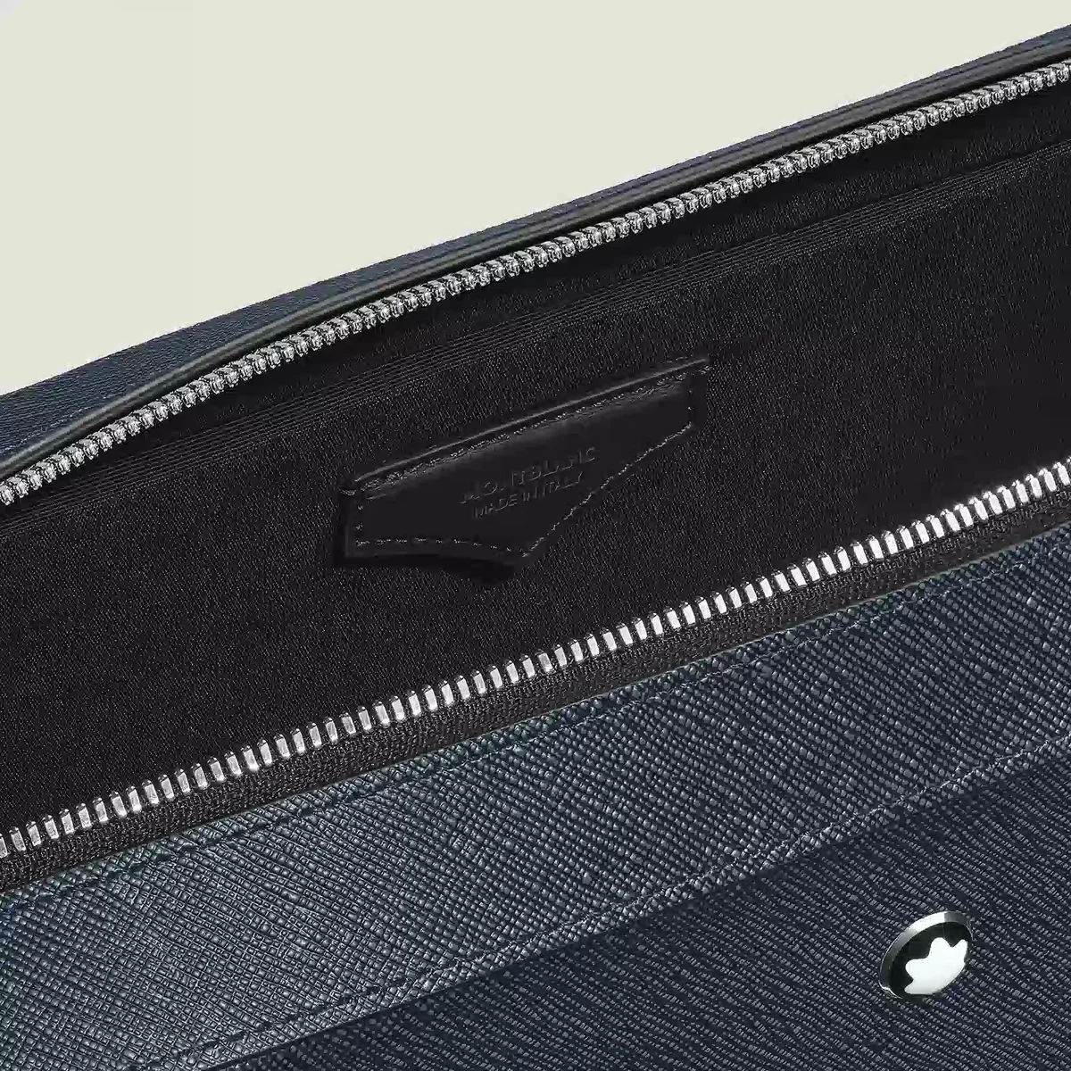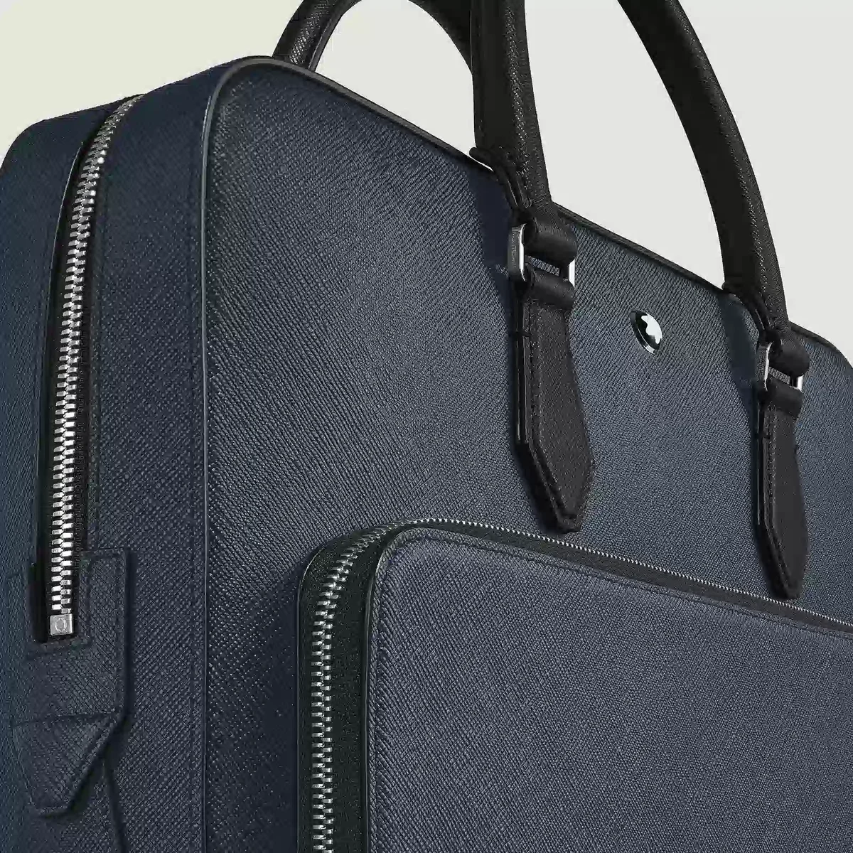 Denne elegante taske har et rummeligt hovedrum til transport af A4-dokumenter, bærbare computere op til 13″, elektroniske enheder og andre professionelle fornødenheder med stil. Den er fremstillet af tofarvet præget Sartorial-læder i sort og blåt og er omhyggeligt designet til forretningsbehov. Dine skriveinstrumenter kan opbevares i dedikerede løkker, mens andre ejendele kan opbevares sikkert i en lynlåslomme eller i de to ekstra åbne lommer.
