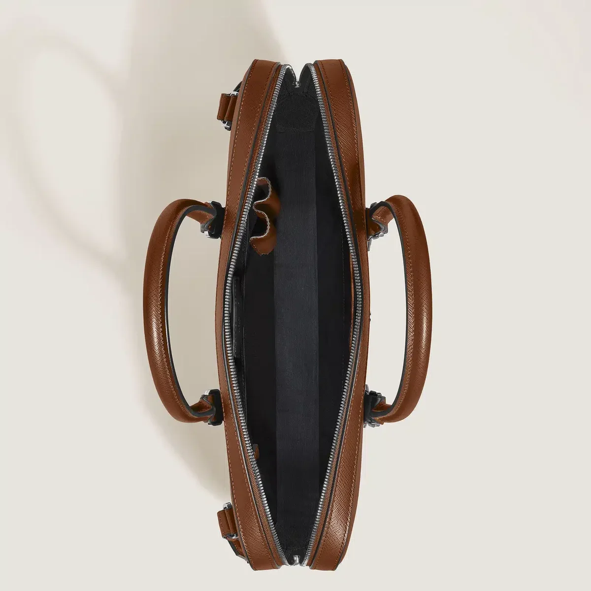 Denne tynde dokumentmappe kombinerer Montblancs tradition for skrivning med elegant, moderne funktionalitet. Den er fremstillet af præget Sartorial-læder i farven fauve og er skræddersyet til forretningsbehov. Det rummelige hovedrum tilbyder rigelig plads til A4-mapper, elektroniske enheder og skriveinstrumenter. Den aftagelige, justerbare rem giver alsidige bæremuligheder, hvilket gør den til et raffineret og praktisk valg for professionelle.