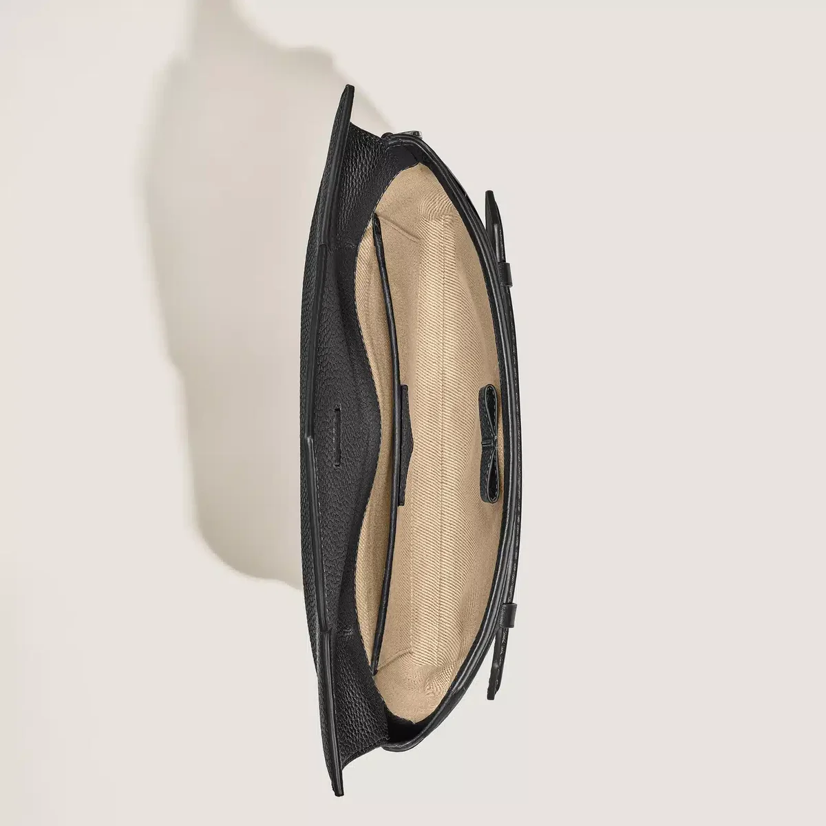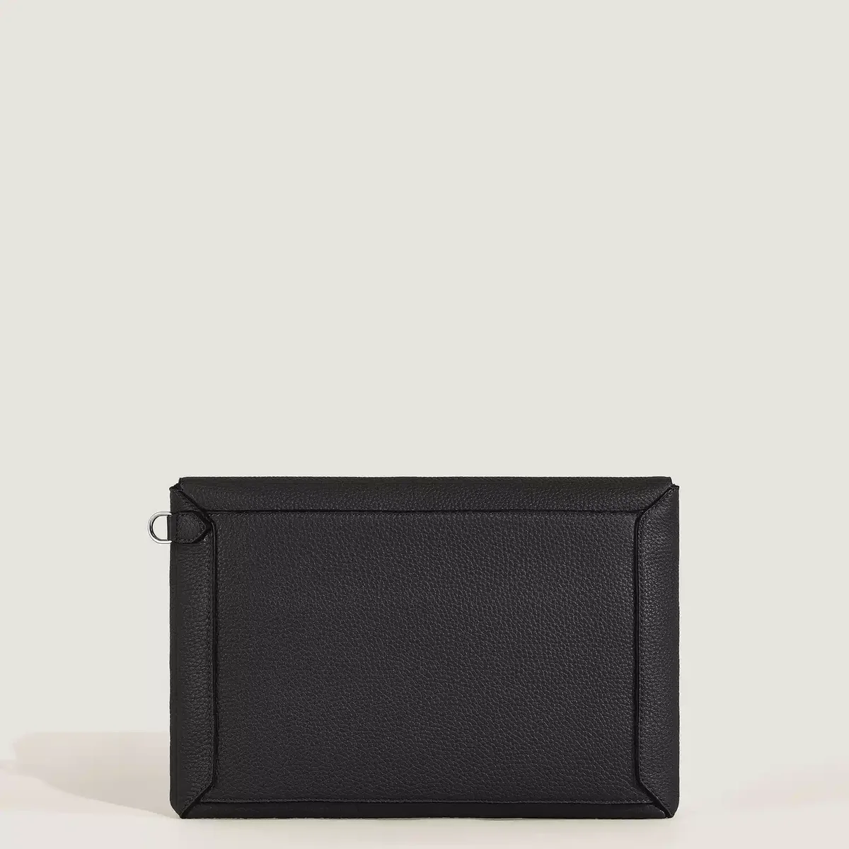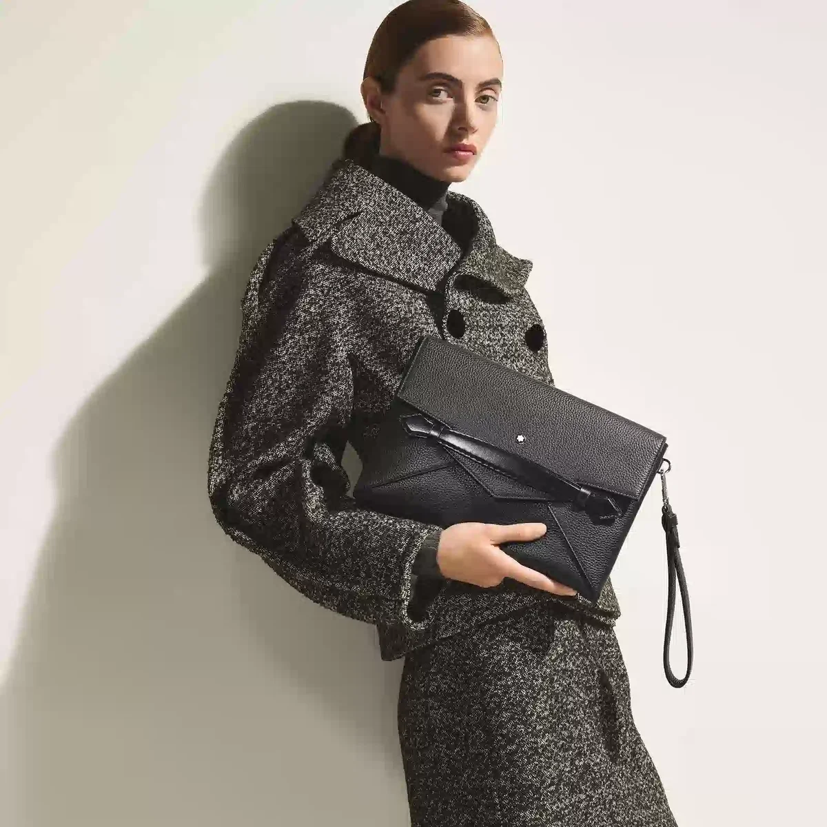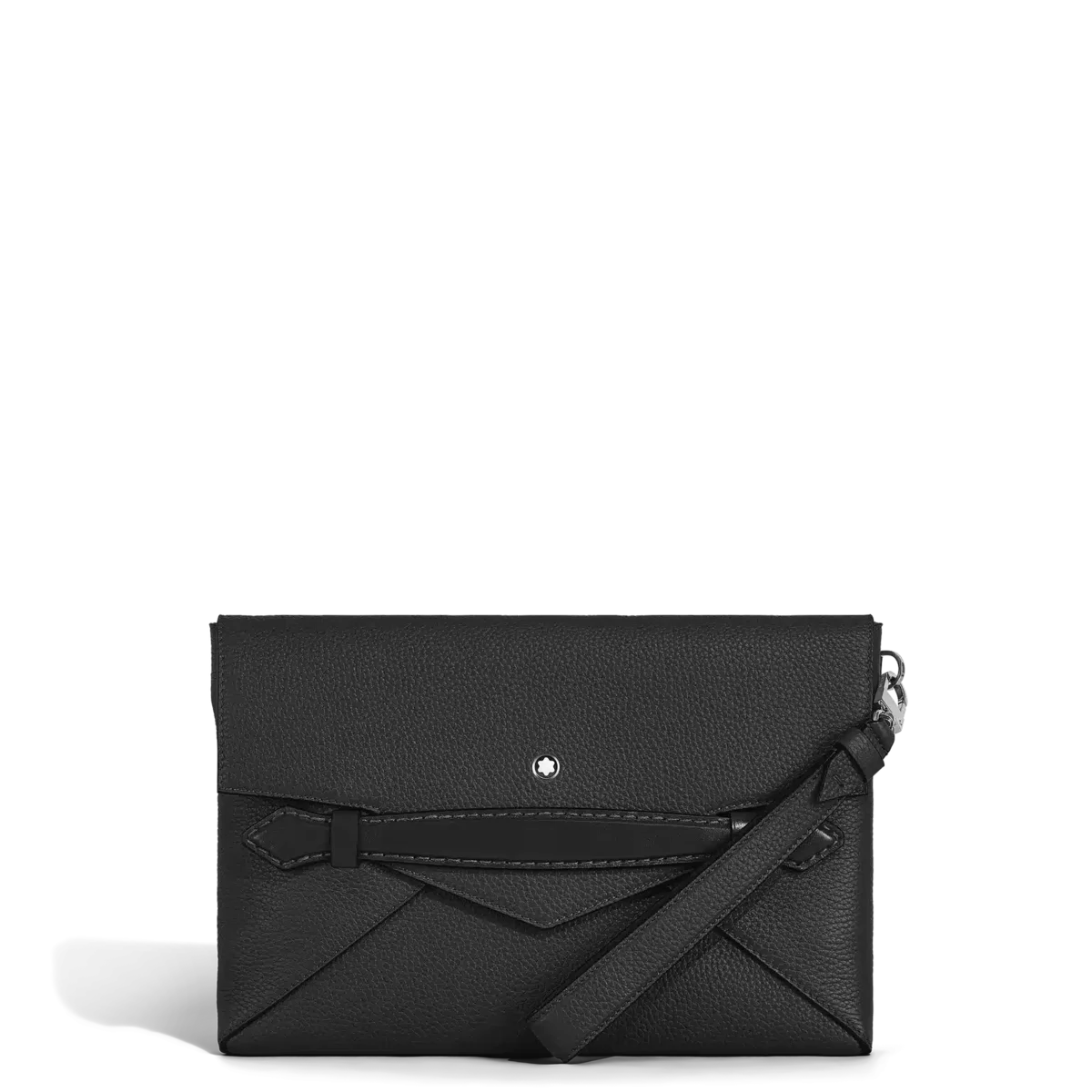 Denne clutch-taske kombinerer Montblancs skrivestil med raffineret funktionalitet. Dens kuvertinspirerede design er fremstillet af sort, smidigt læder med sadelsting, der minder om en pen, der tegner en stiplet linje. Det unikke penneformede håndtag foran gør det behageligt at holde tasken i én hånd, mens et aftageligt håndledshåndtag tilføjer alsidighed. Indvendigt har den et hovedrum, en åben lomme og to penneholdere, suppleret med en baglomme for ekstra praktisk anvendelighed.
