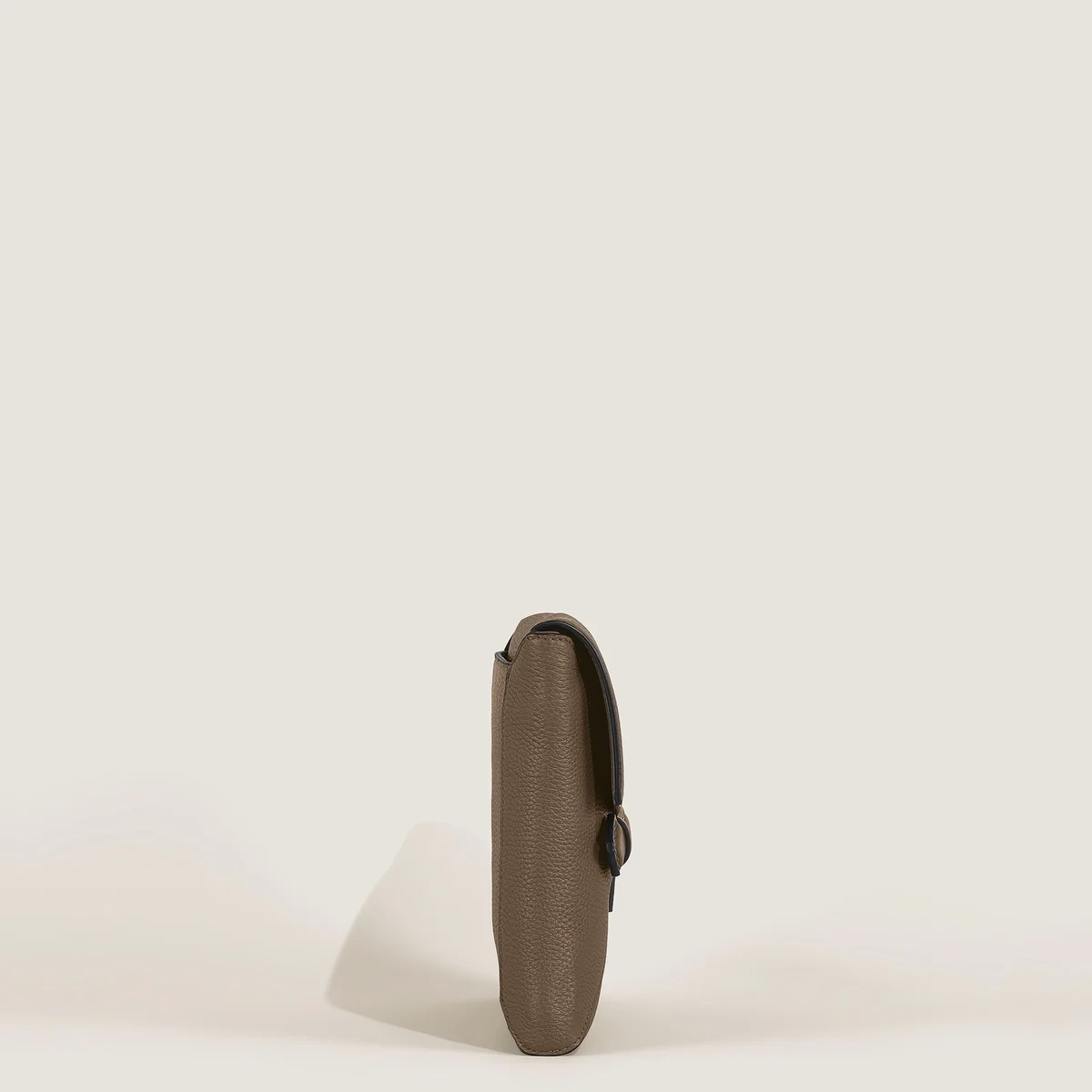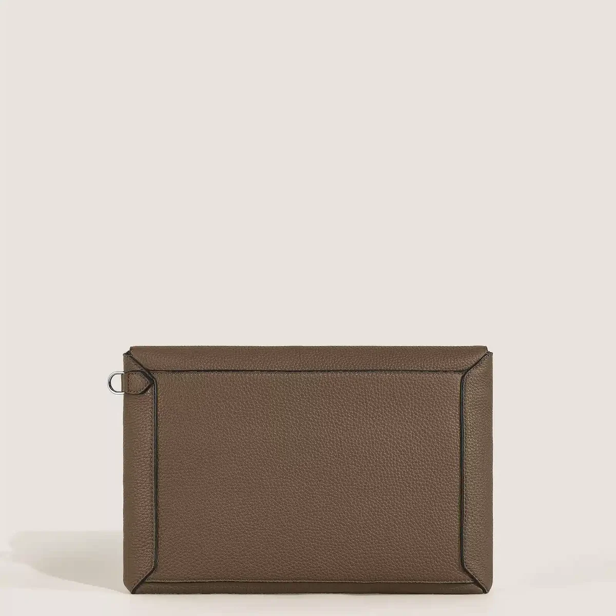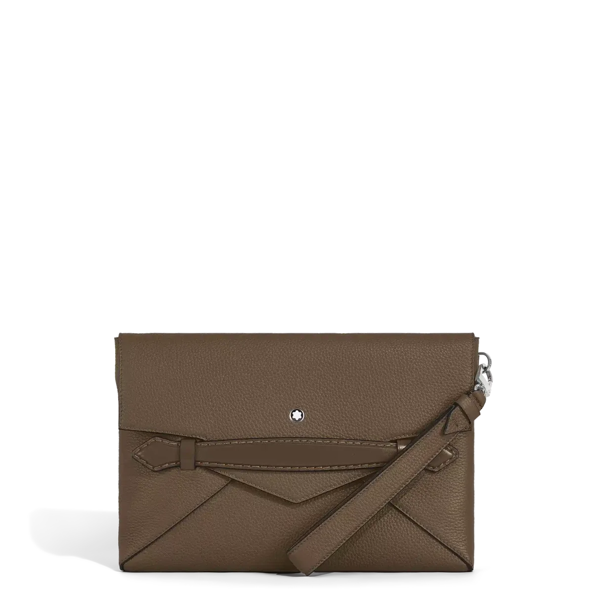 Clutch-tasken kombinerer Montblancs skrivestil med raffineret funktionalitet. Dens kuvertinspirerede design er fremstillet af sort, smidigt noisettefarvet læder med sadelsting, der minder om en pen, der tegner en stiplet linje. Det unikke penneformede håndtag foran gør det nemt at holde tasken i én hånd, mens et aftageligt håndledshåndtag giver ekstra alsidighed. Indvendigt har den et hovedrum, en åben lomme og to penneholdere, suppleret med en baglomme for ekstra praktisk anvendelighed.