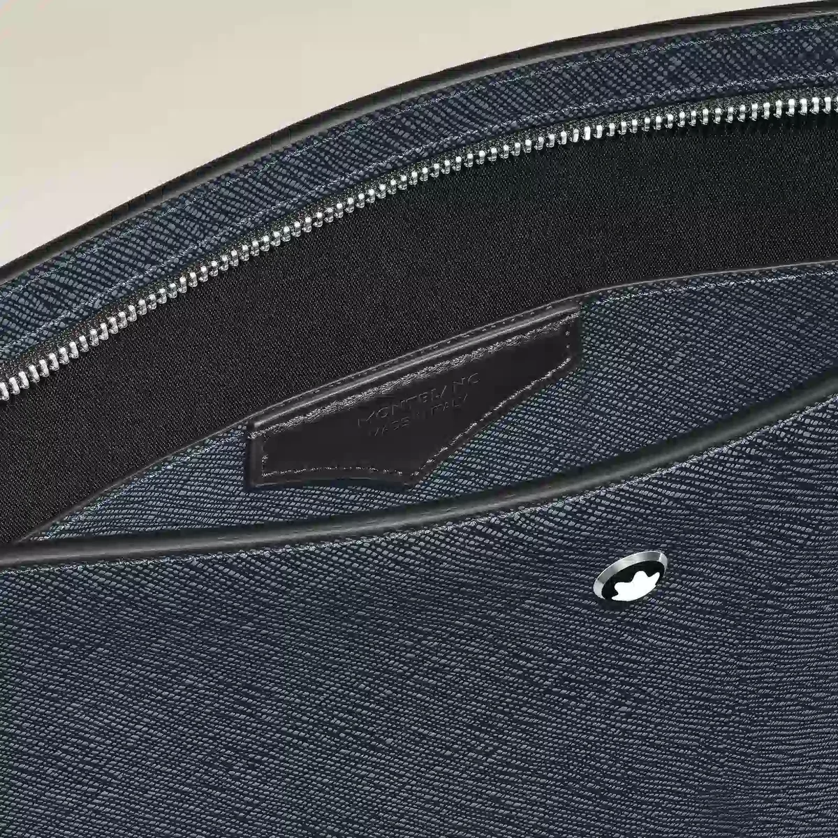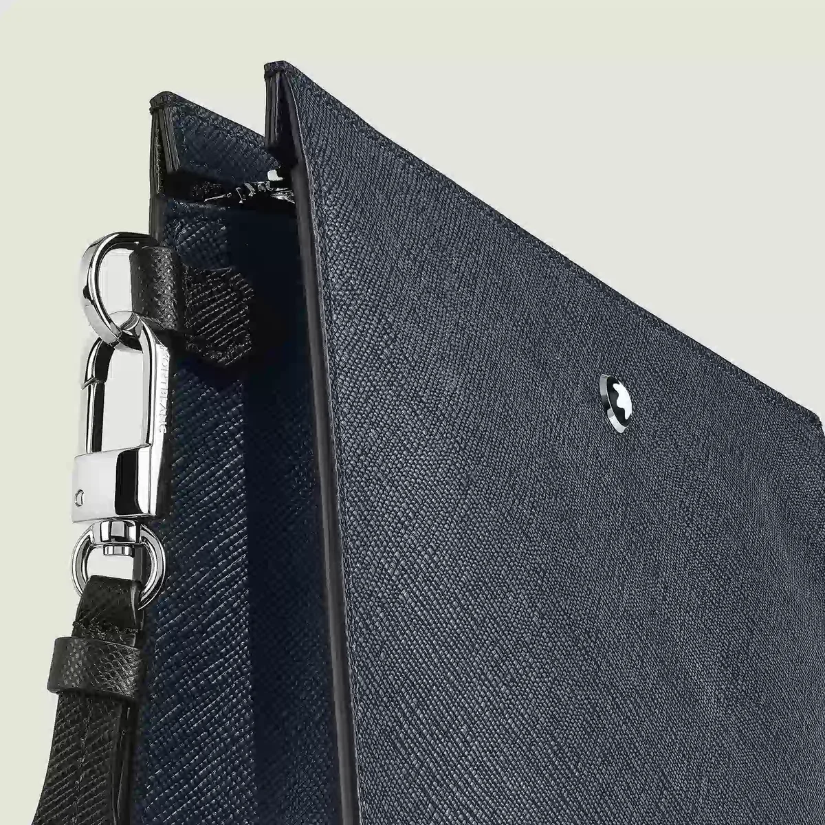 Bær dine daglige fornødenheder med stil med denne sofistikerede clutch. Den er fremstillet af præget Sartorial-læder i en raffineret tofarvet kombination af elegant blå og sort og har et rummeligt hovedrum med en ekstra åben lomme for ekstra bekvemmelighed. Den er alsidig og elegant og kan bæres i hånden, under armen eller om håndleddet med det aftagelige håndtag. Identifikationsnummer: MB220428 Mål: 240 mm * 45 mm * 200 mm