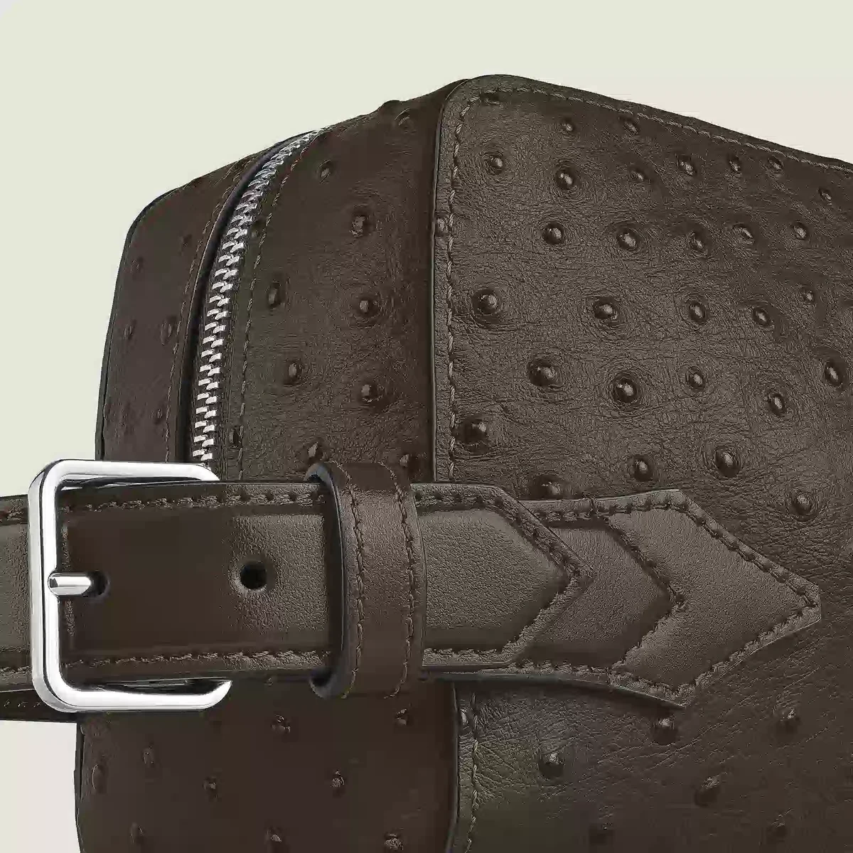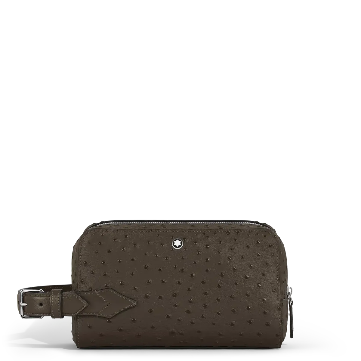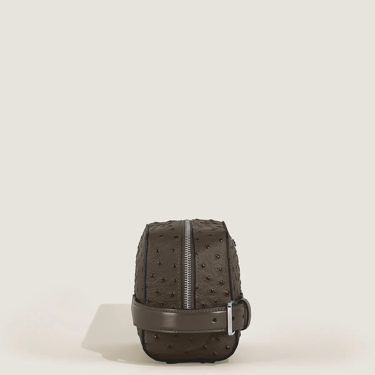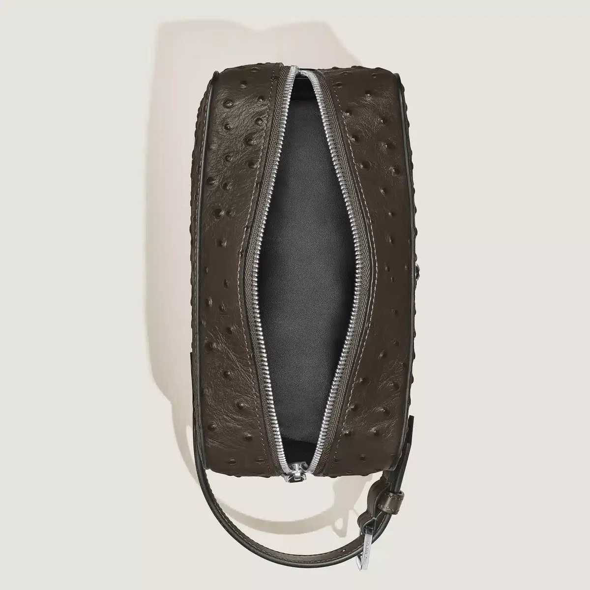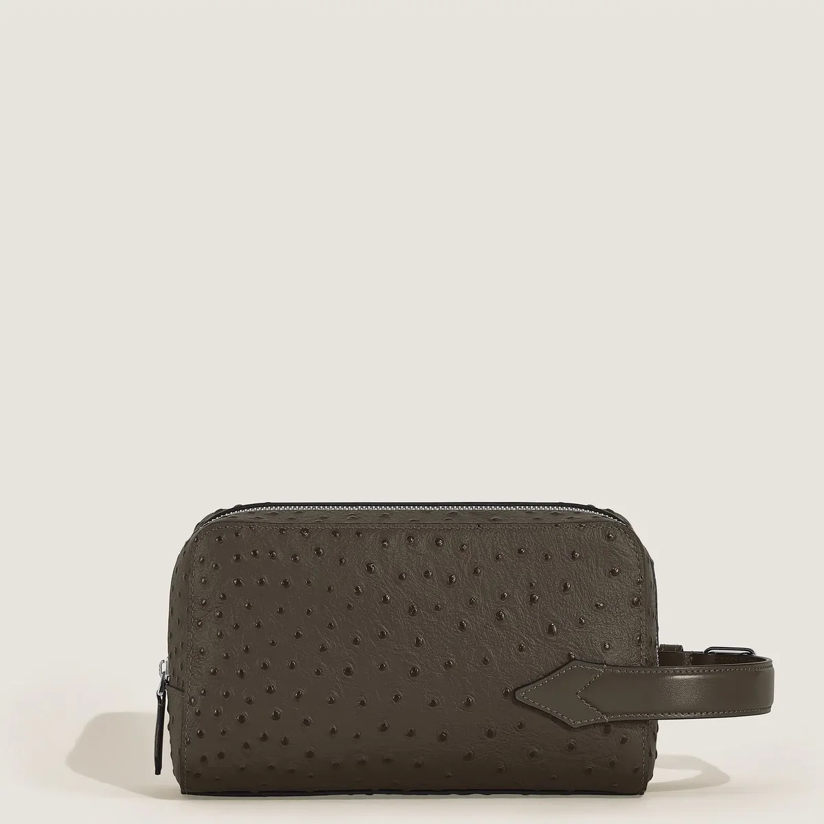 Med skrivekunsten i centrum er den nye clutch-taske fremstillet af stilfuldt khaki strudsepræget læder. Hjørnedetaljerne giver designet et karakteristisk og raffineret touch. Den har den perfekte størrelse til daglige fornødenheder og har et hovedrum med en åben lomme og en aftagelig håndledsrem, der kombinerer elegance med alsidig funktionalitet.