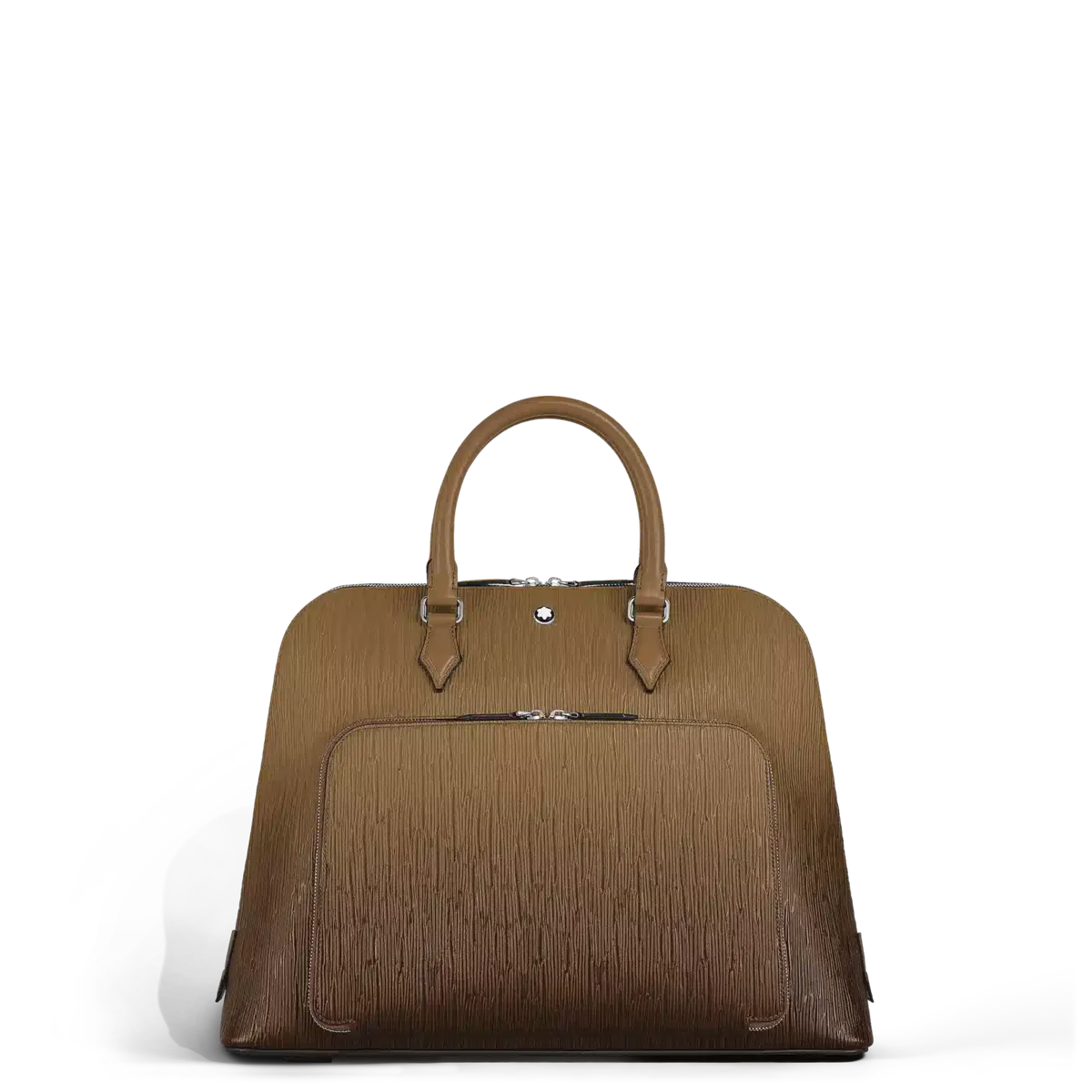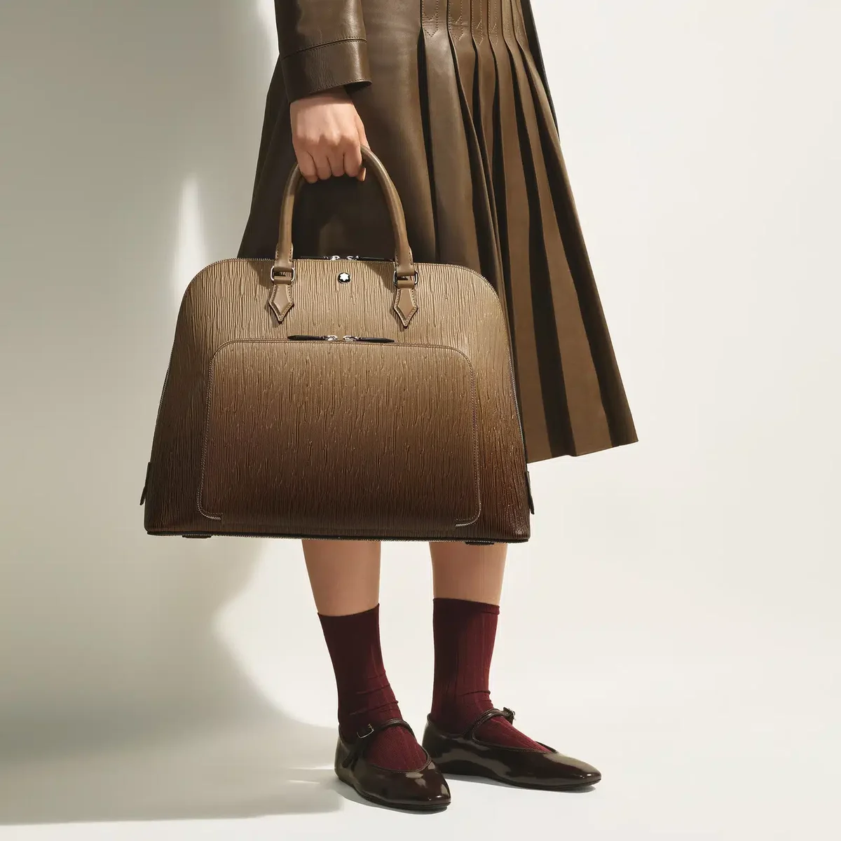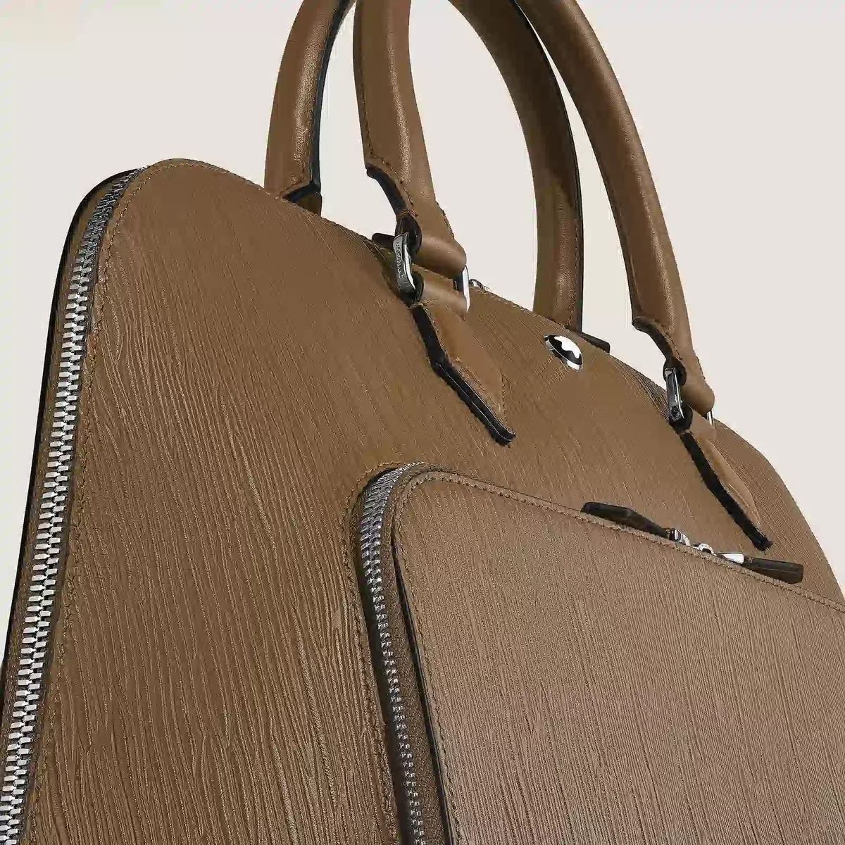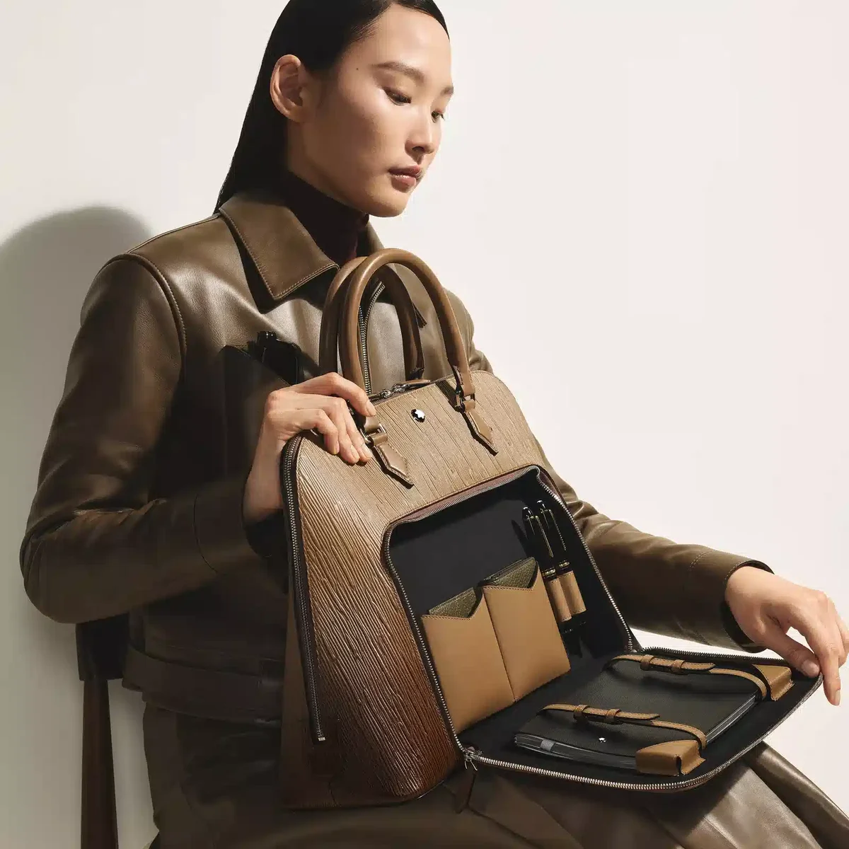 Denne håndtaske i sandfarvet Corteccia-læder omdefinerer luksus med et strejf af kreativ magi. Den er fremstillet med et lodret barkinspireret motiv og forstærket med en håndpåført sfumato-effekt, og dens naturlige farver fremkalder skønheden i træbark. Ydersiden har en stor lynlåslomme foran og en kuvertlomme bagpå, der kombinerer elegance med praktisk funktionalitet. Indvendigt har hovedrummet et polstret rum til en bærbar computer, to åbne lommer til vigtige ting, mens frontlommen kan omdannes til et mini-skrivebord med to åbne lommer, to penneholdere og læderbånd til at fastgøre en notesbog eller papirer. Denne unikke håndtaske løfter hverdagen og gør rejser og forretninger til muligheder for inspiration og kreativitet. Identifikationsnummer: MB220266 Mål: 400 mm * 140 mm * 310 mm