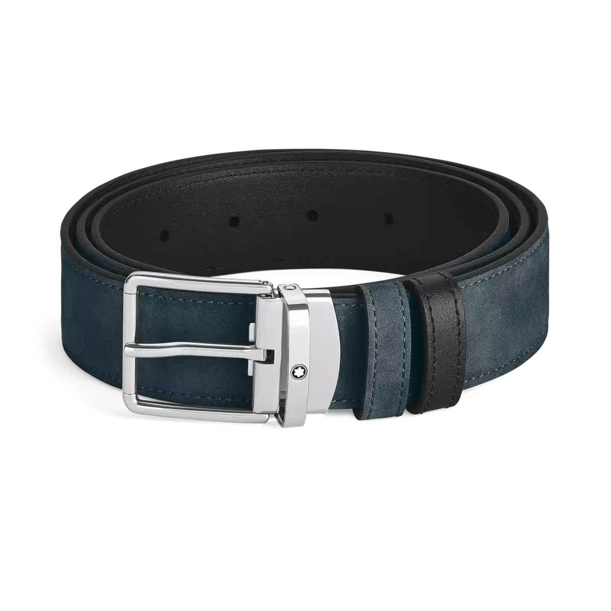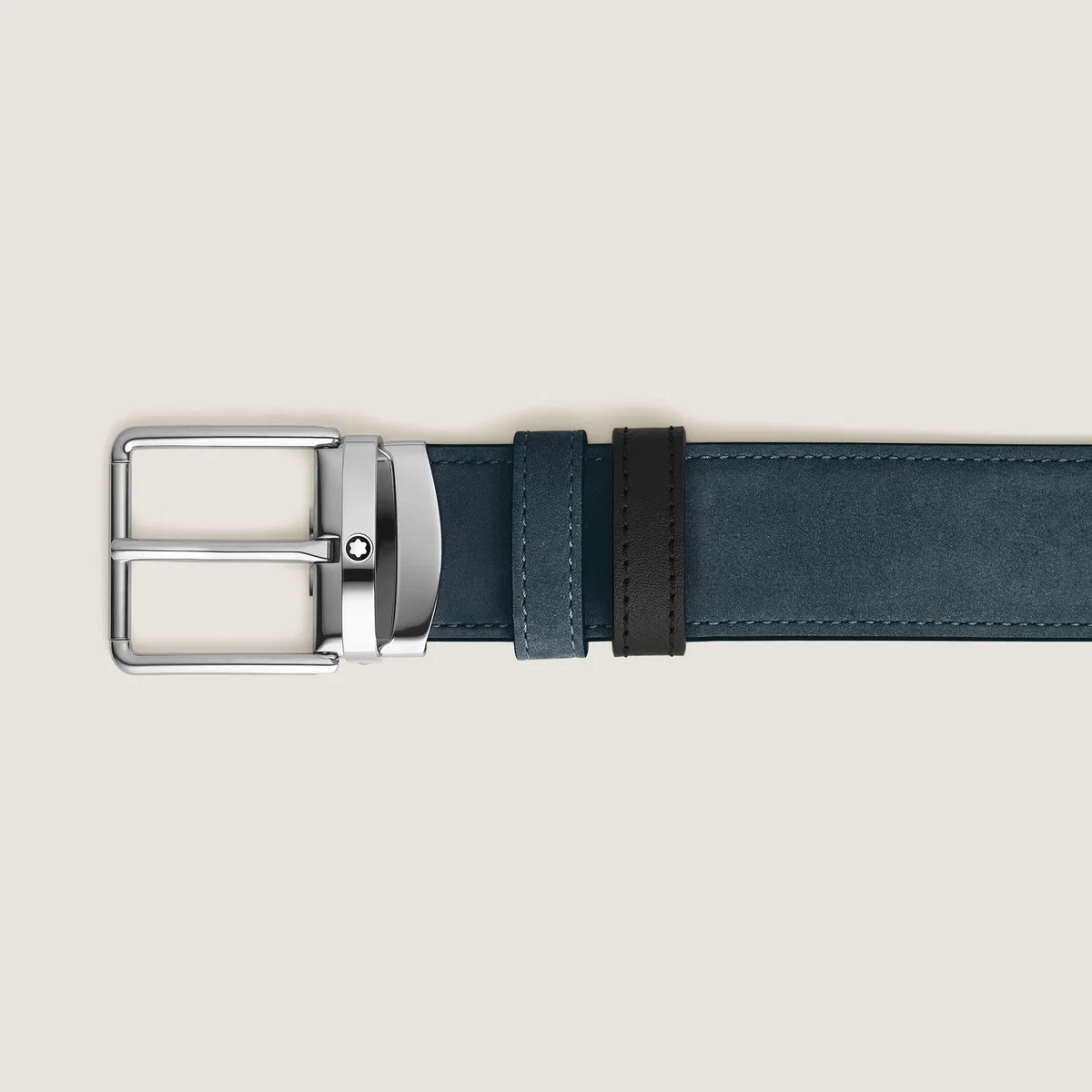 Dette 35 mm vendbare læderbælte kombinerer praktisk funktionalitet og elegance. Den ene side fremhæver det afslappede look med blødt, fløjlsagtigt blåt ruskind, mens den anden side har klassisk, blødt sort læder for et mere traditionelt look. Everyday-spændet med sin slanke, rektangulære silhuet er fremstillet i sort gummieret PVD-finish og har rene kanter og et diskret Montblanc-logo indlagt i bunden. Identifikationsnummer: MB221007