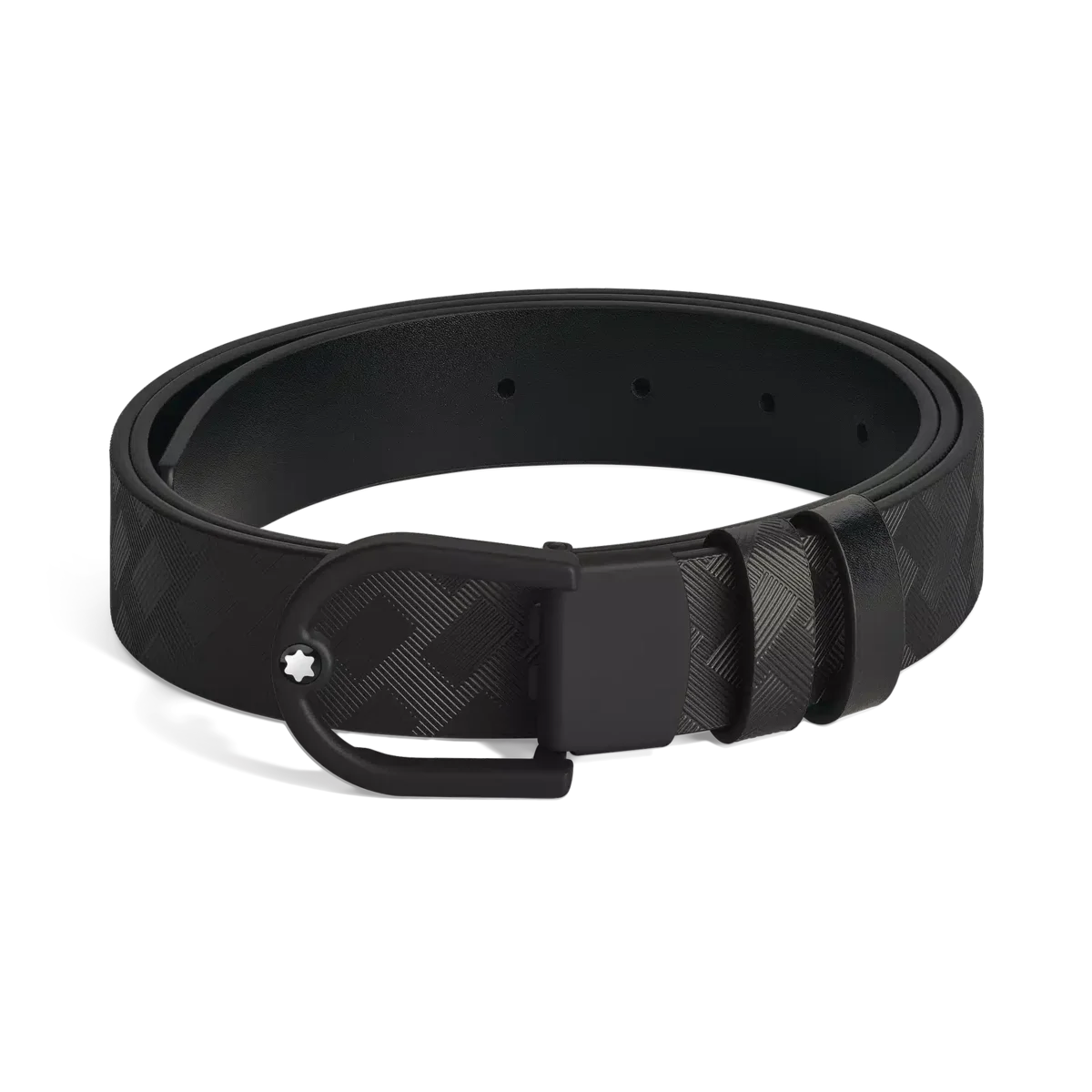 Dette vendbare 30 mm bælte kombinerer den slanke silhuet af en gummieret PVD-finish spænde med alsidigheden af to forskellige læderremme. Med rene og buede linjer tilføjer hestesko-spændet et strejf af moderne raffinement til din stil. Bæltestroppen tilbyder alsidighed og raffineret stil med to forskellige looks i ét tilbehør: mens den ene side har sort Extreme 3.0-trykt læder med et markant, struktureret design, har den anden side elegant sort Meisterstück-læder for en tidløs, poleret finish.