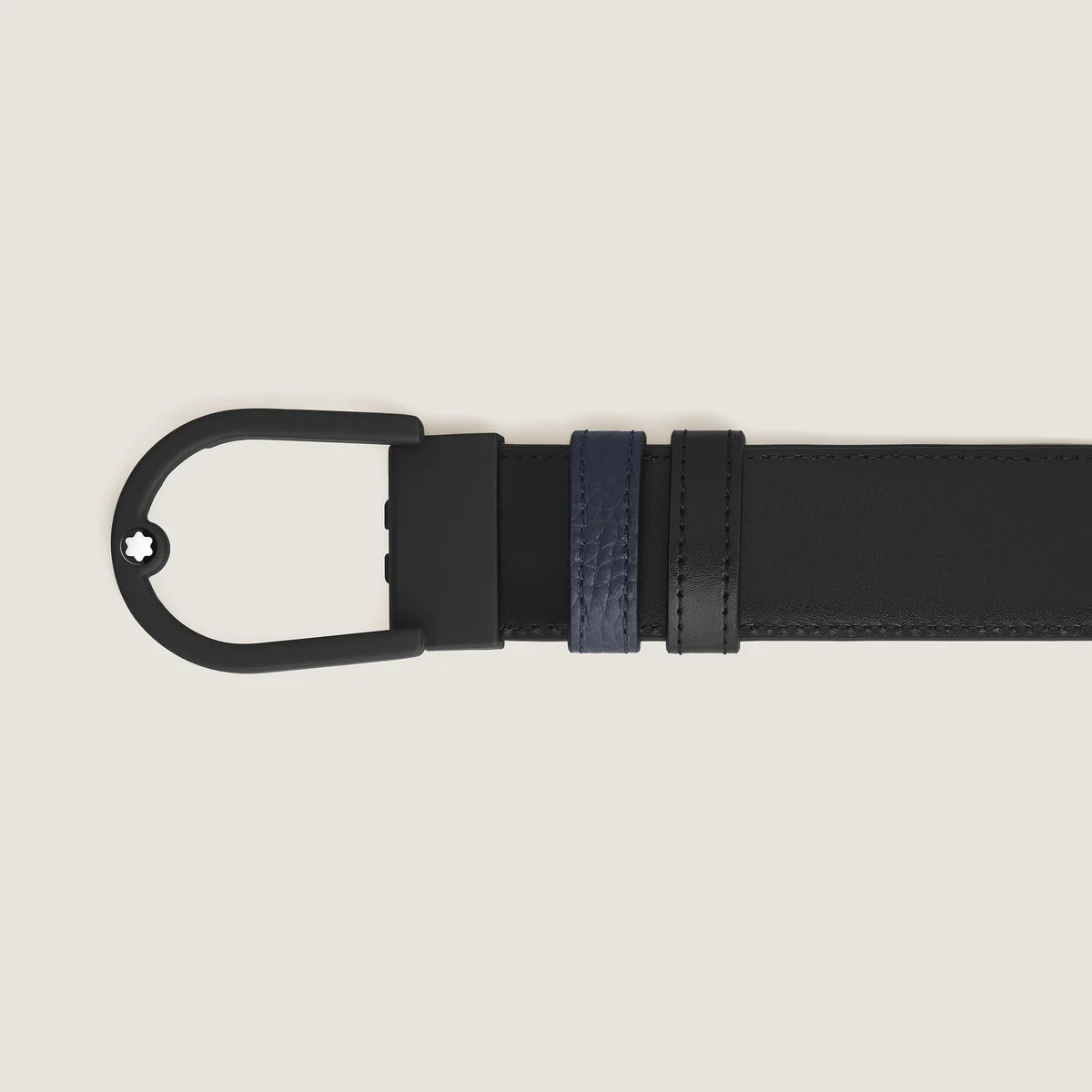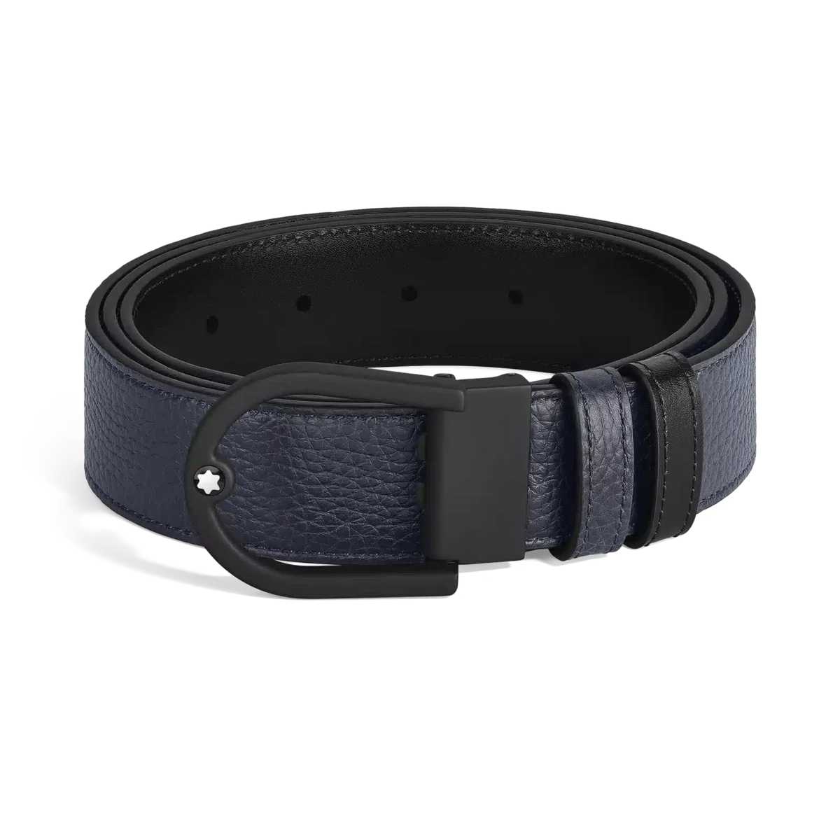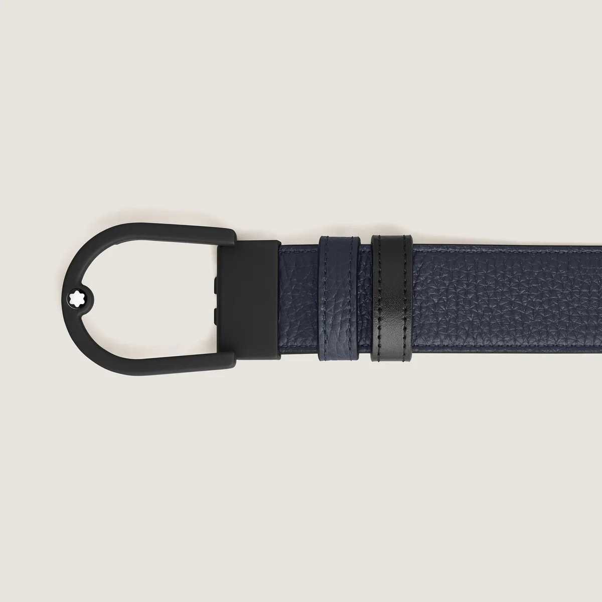 Dette vendbare 35 mm bælte kombinerer den elegante silhuet af en gummieret PVD-finish spænde med alsidigheden af to forskellige læderremme. Med rene og buede linjer tilføjer hestesko-spændet et strejf af moderne sofistikering til din stil. Bæltestroppen tilbyder alsidighed og raffineret stil med to forskellige looks i ét tilbehør: mens den ene side har kornet læder i en dyb midnatsblå nuance, har den anden side elegant sort Meisterstück-læder for et tidløst, poleret finish. Identifikationsnummer MB220998