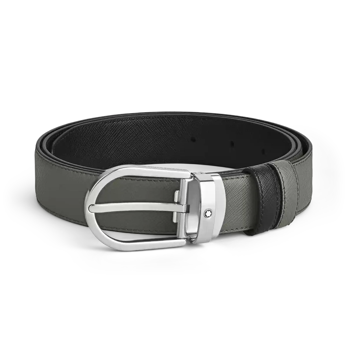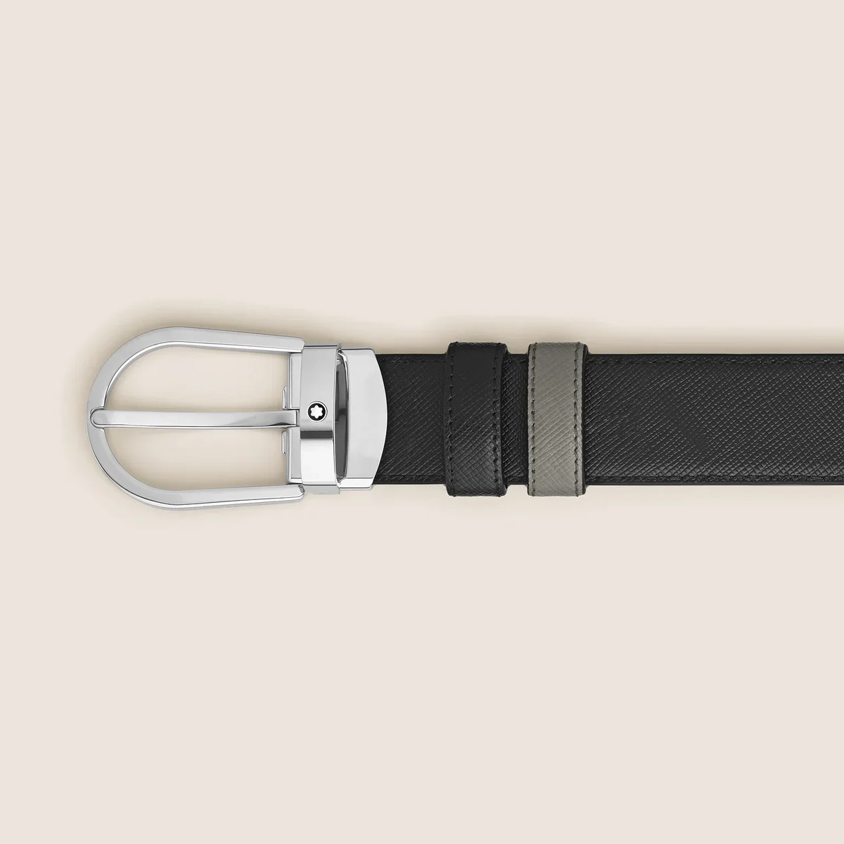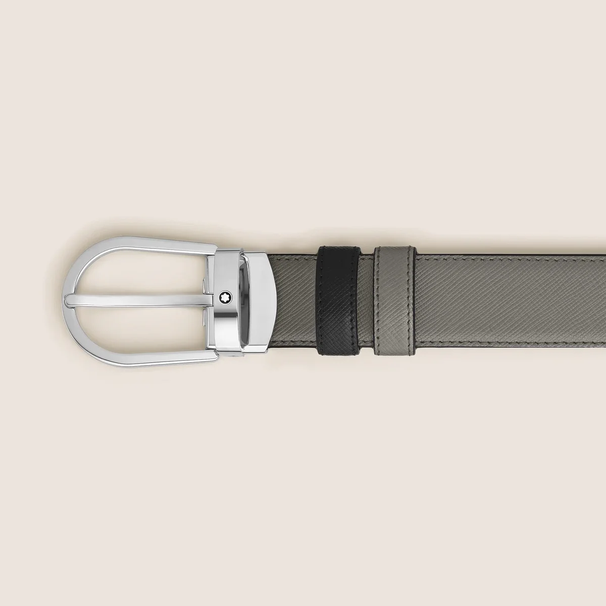 Dette alsidige vendbare bælte har en raffineret, skinnende hestesko-spænde, der giver to looks i ét. Det er fremstillet af luksuriøst Saffiano-læder, hvor den ene side har en diskret mellemgrå farve, mens den anden side er klassisk sort, hvilket giver en ubesværet stil og tilpasningsevne til enhver lejlighed.MB220019