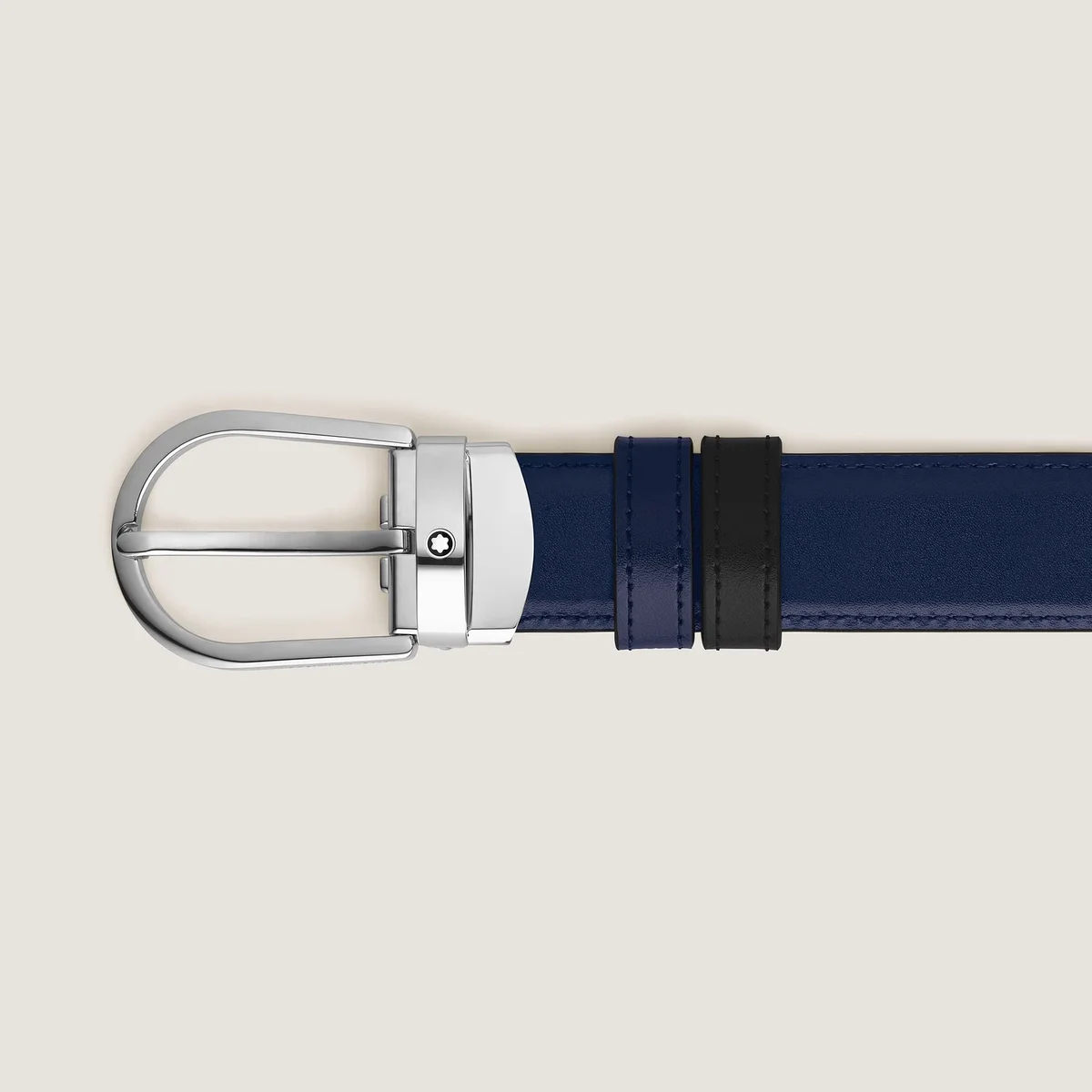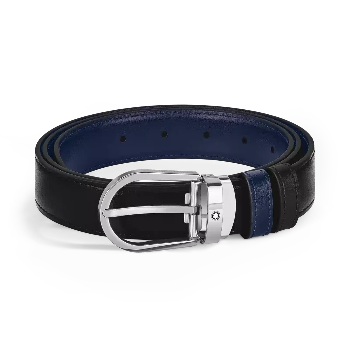 Se alle detaljer om det vendbare læderbælte med hestesko-spænde i sort/blå 30 mm. Køb online i den officielle Montblanc-butik.