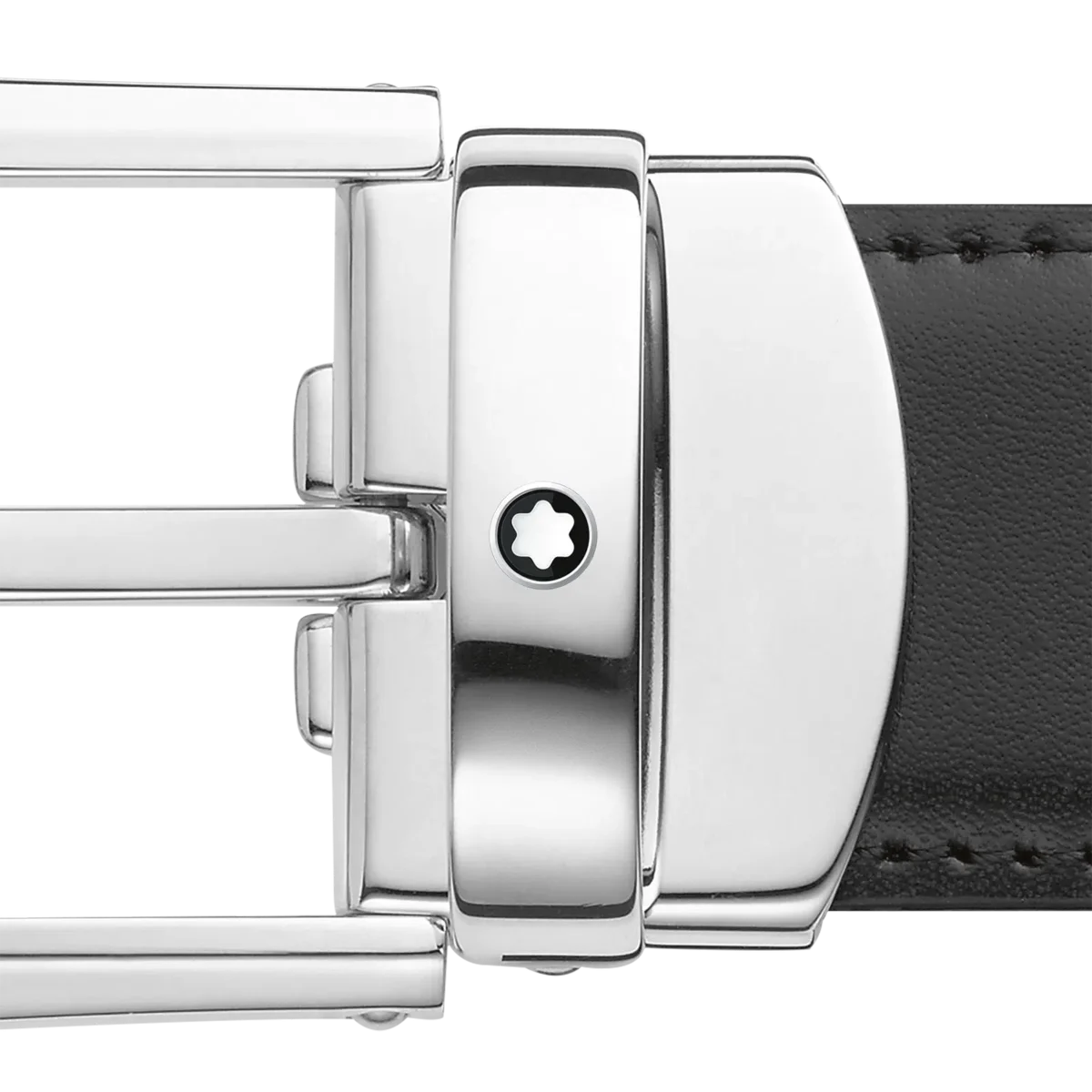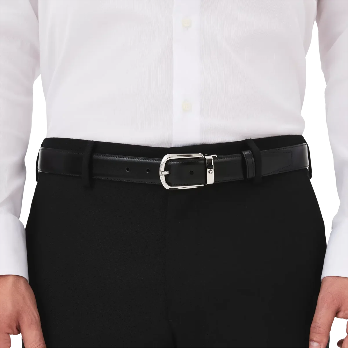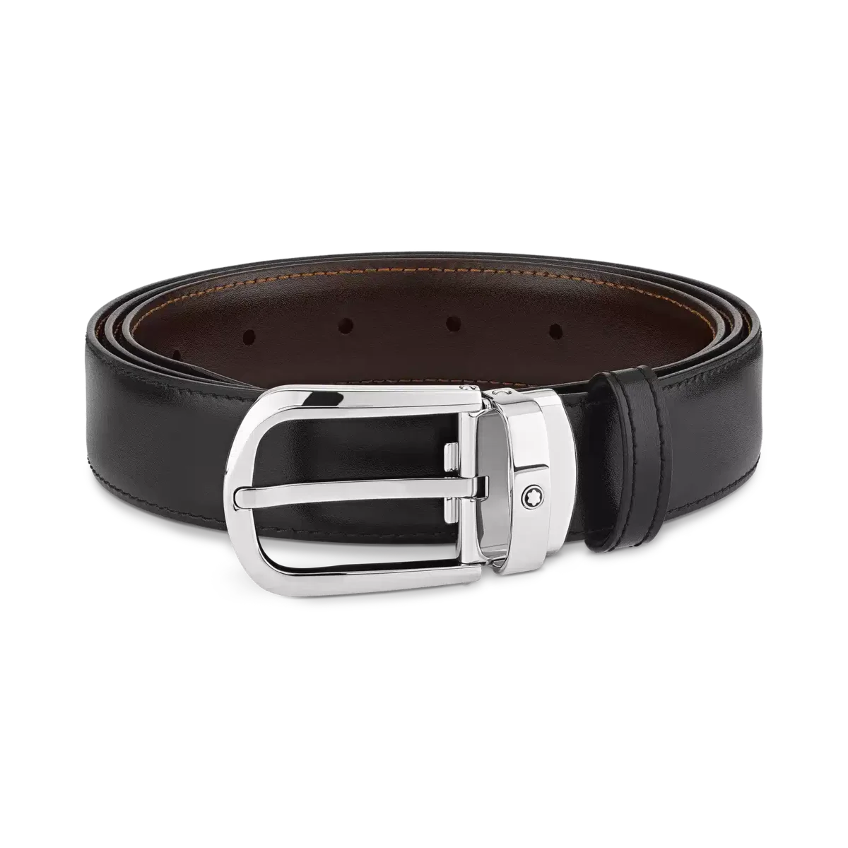 Buet hesteskoformet skinnende rustfri stålspænde. Selvjusterbar, 3 cm x 120 cm, vendbar sort og brun læderrem