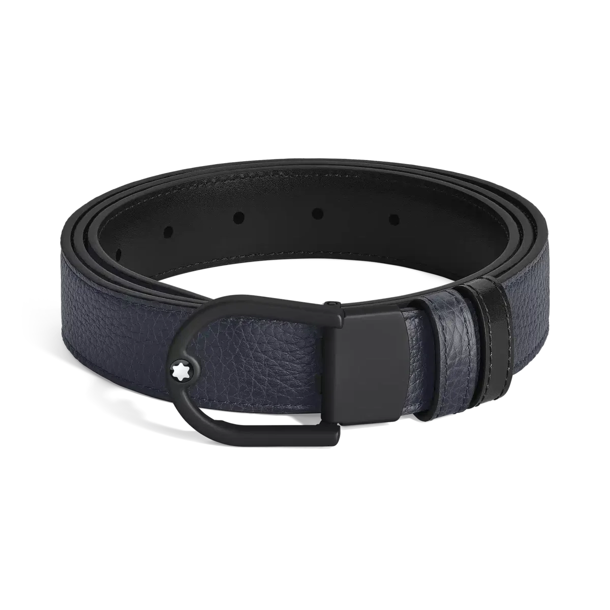 Dette vendbare 30 mm bælte kombinerer den elegante silhuet af en gummieret PVD-finish spænde med alsidigheden af to forskellige læderremme. Med rene og buede linjer tilføjer hestesko-spændet et strejf af moderne sofistikering til din stil. Bæltestroppen tilbyder alsidighed og raffineret stil med to forskellige looks i ét tilbehør: mens den ene side har kornet læder i en dyb midnatsblå nuance, har den anden side elegant sort Meisterstück-læder for et tidløst, poleret finish. Identifikationsnummer MB220997