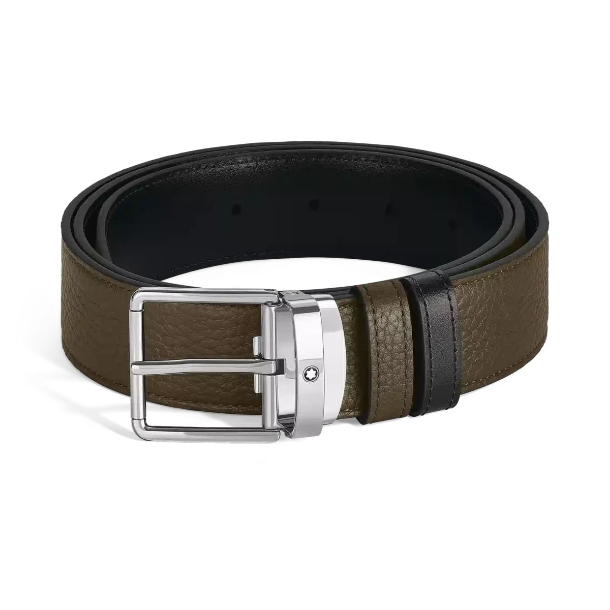 Dette 35 mm vendbare læderbælte tilbyder både diskret elegance og alsidig stil. Den ene side af remmen er lavet af kornet læder i en elegant khaki-farve, mens den anden side er lavet af klassisk glat sort Meisterstück-læder. Everyday-spændet med sin slanke, rektangulære silhuet er fremstillet i sort gummieret PVD-finish og har rene kanter og et diskret Montblanc-logo indlagt i bunden. Identifikationsnummer: MB221004