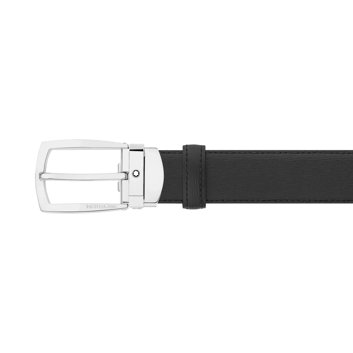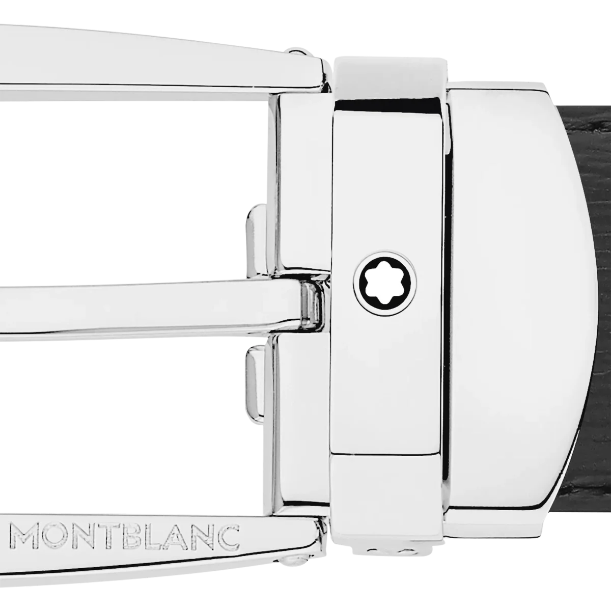 Trapezformet, skinnende PVD-rutheniumbelagt spænde i rustfrit stål. Selvjusterbar, 3 cm x 120 cm, sort læderrem med Montblancs eksklusive, diskrete print, der matcher 4810 Westside Leather Goods-serien. Med den nye gunmetal-spænde er det det perfekte bælte til et stilfuldt look.
