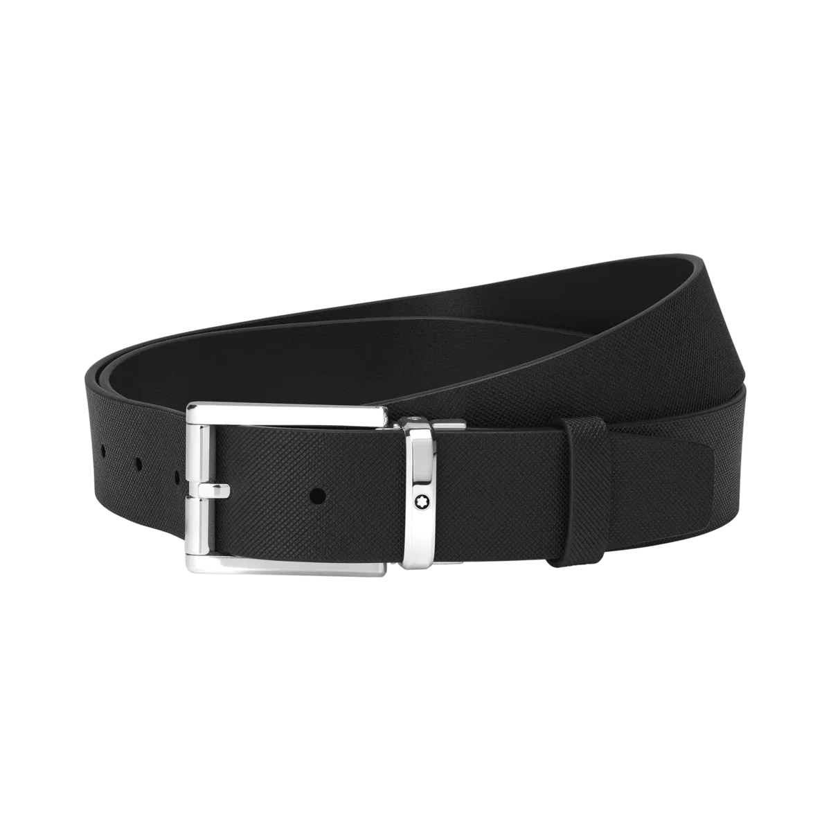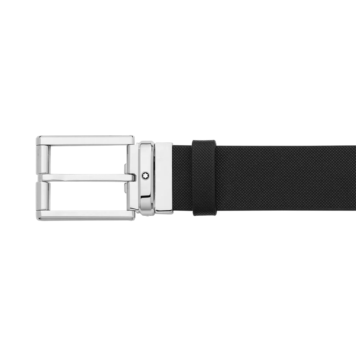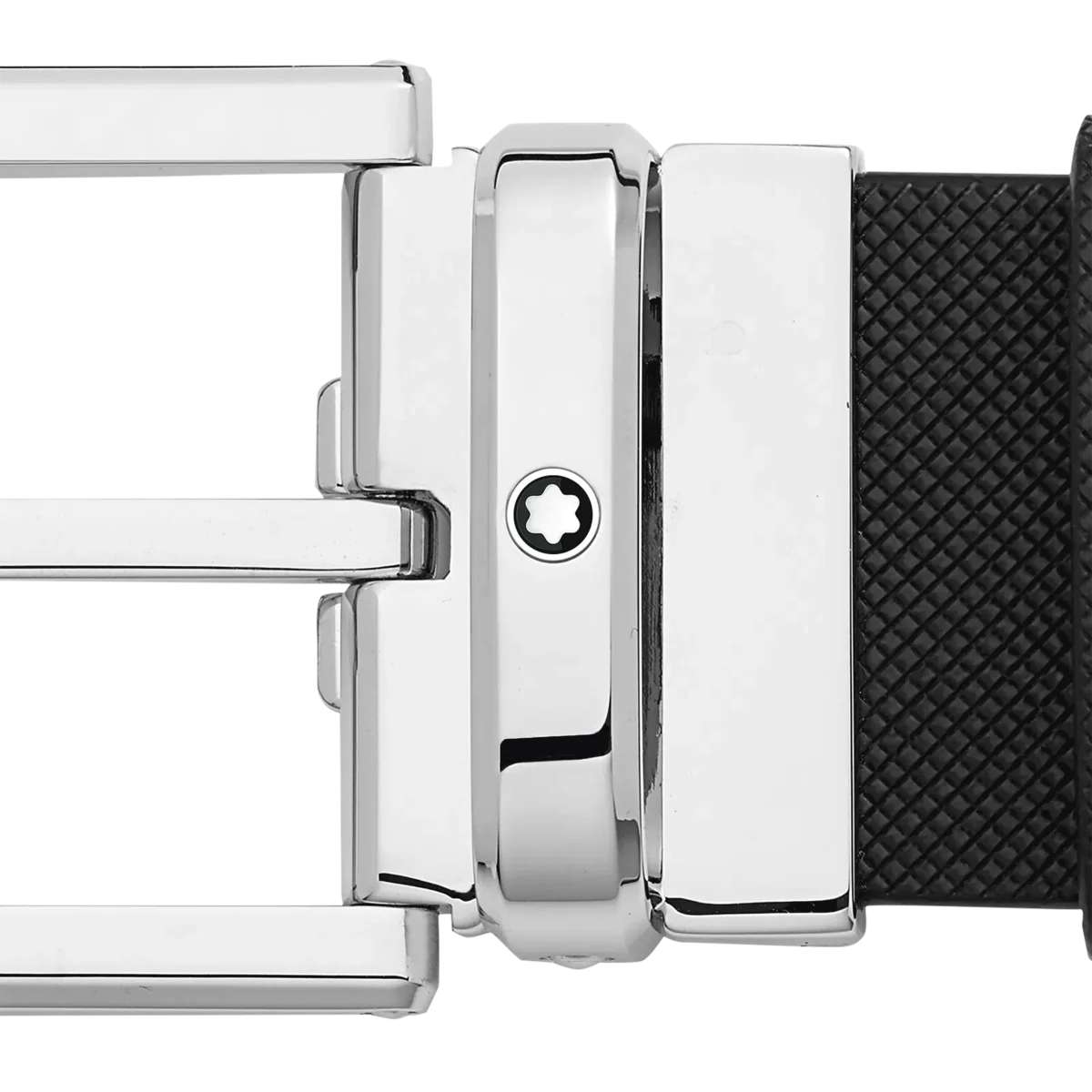 Skinnende rektangulær palladiumbelagt spænde med rulledetalje. Selvjusterbar, 3,5 cm x 120 cm, sort trykt læderrem for et urbant look.