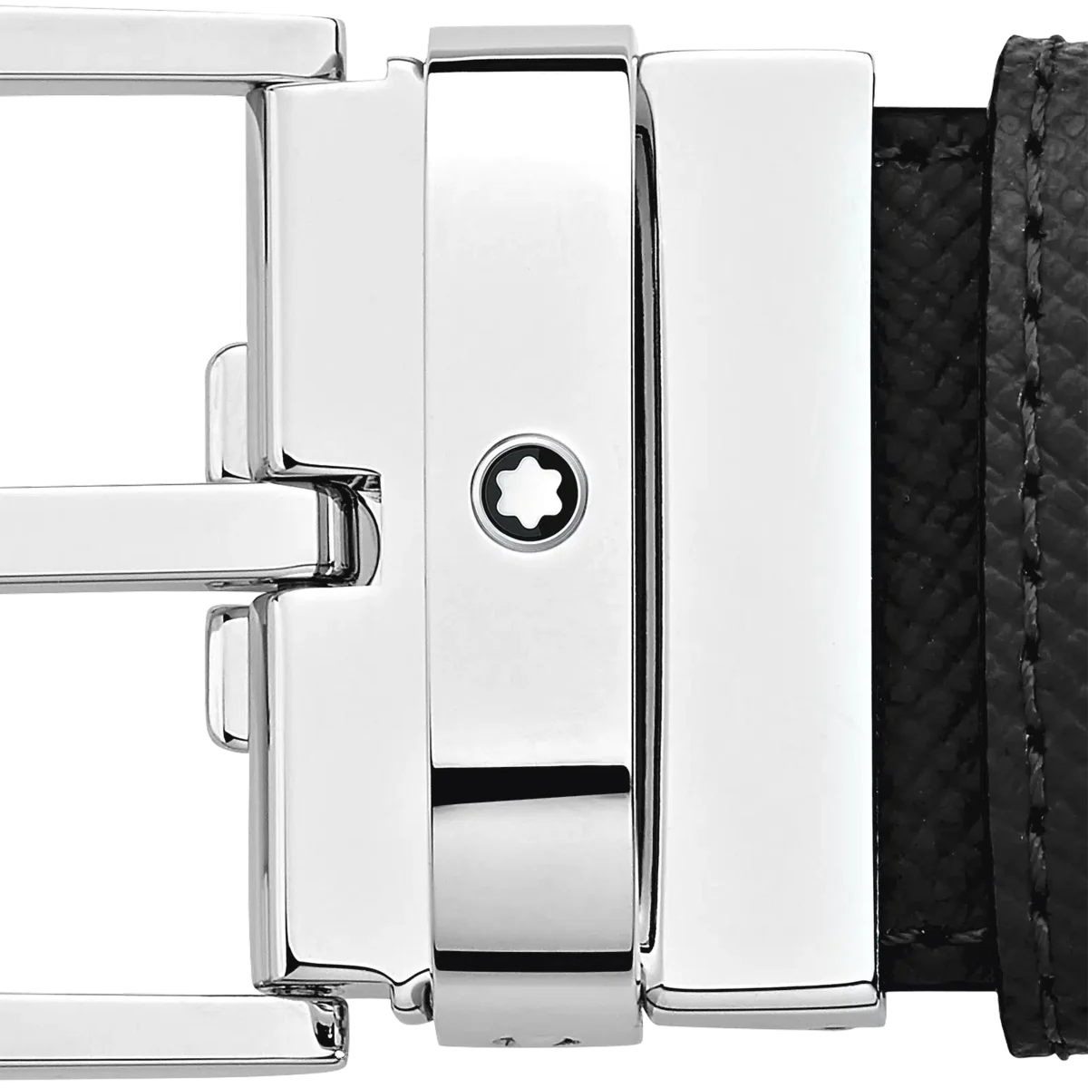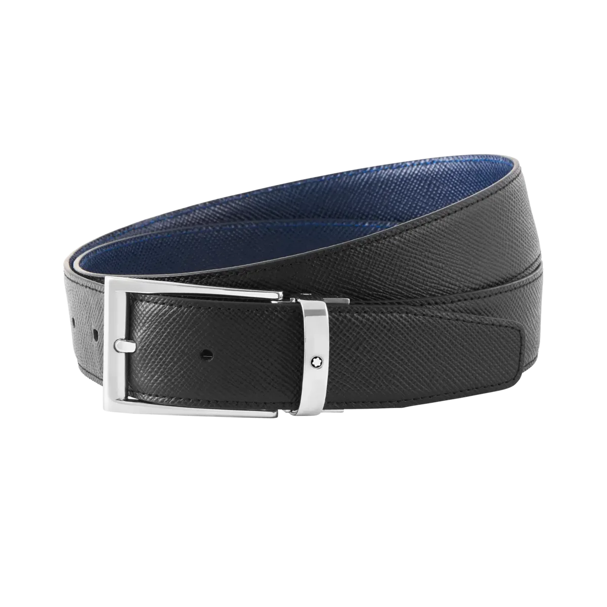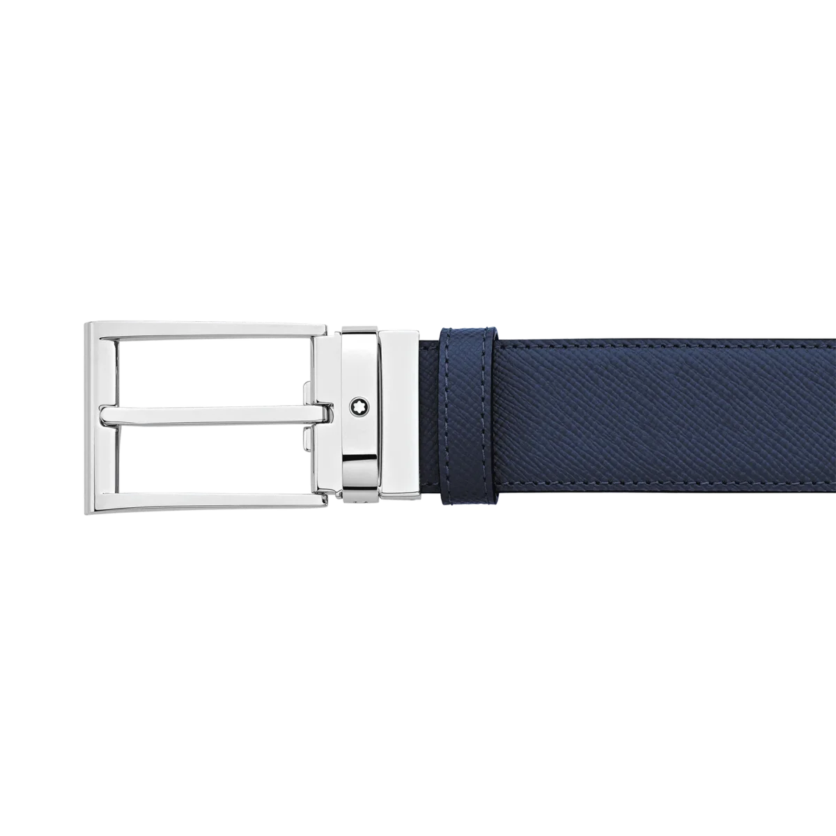 Trapezformet, skinnende palladiumbelagt spænde. Selvjusterende, 3,5 cm x 120 cm, vendbart sort og blåt Saffiano-læderbælte, der matcher Montblanc Sartorial Leather Goods-serien. Dette vendbare bælte har en diskret spænde i rustfrit stål og en elegant rem i kalveskind i sort på den ene side og blå på den anden, hvilket gør det velegnet til både forretnings- og fritidstøj.