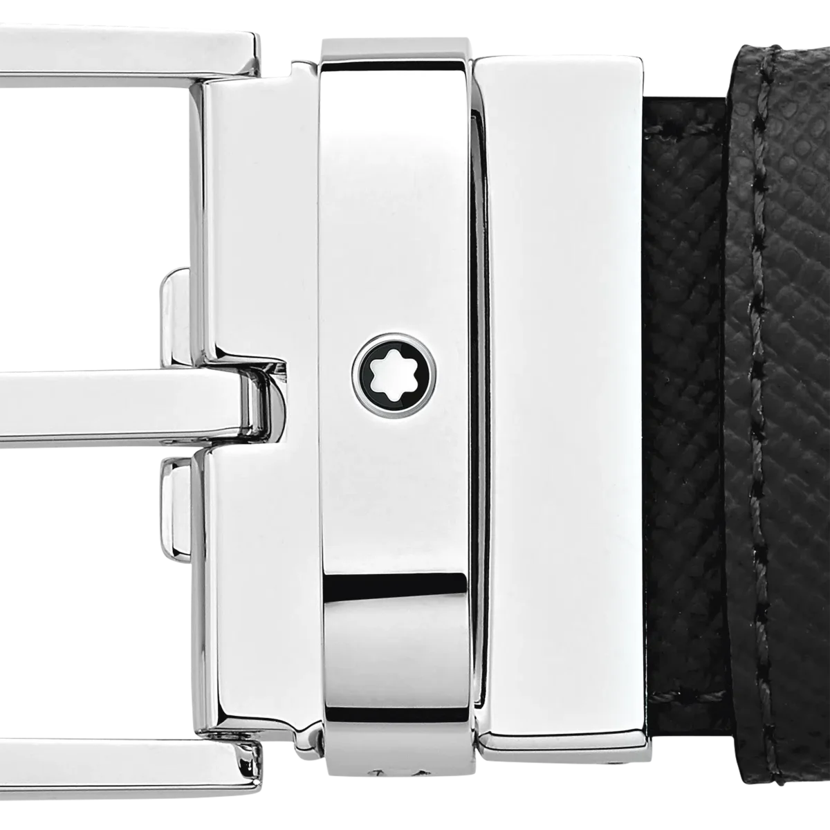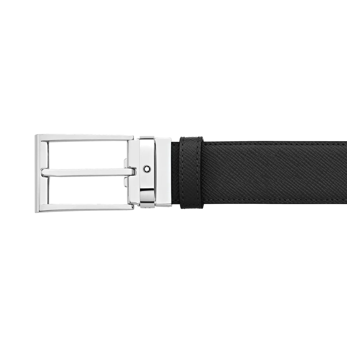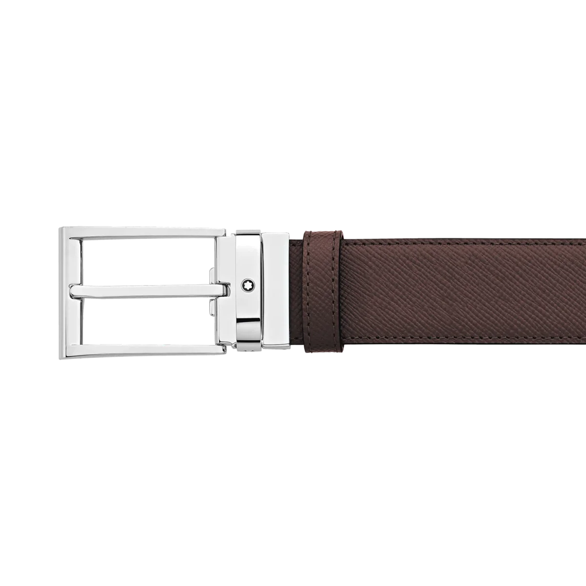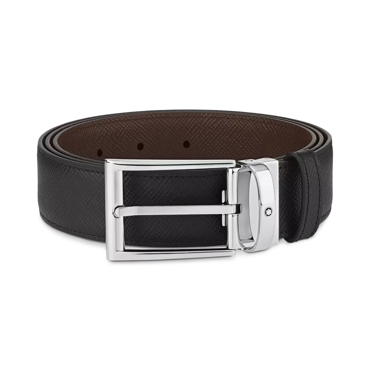 Trapezformet, skinnende palladiumbelagt spænde. Selvjusterbar, 3,5 cm x 120 cm, vendbart sort og brunt Saffiano-læderbælte, der matcher Montblanc Sartorial Leather Goods-serien. Dette vendbare bælte har en diskret spænde i rustfrit stål og en elegant rem i kalveskind i sort på den ene side og brun på den anden, hvilket gør det velegnet til både forretnings- og fritidstøj.