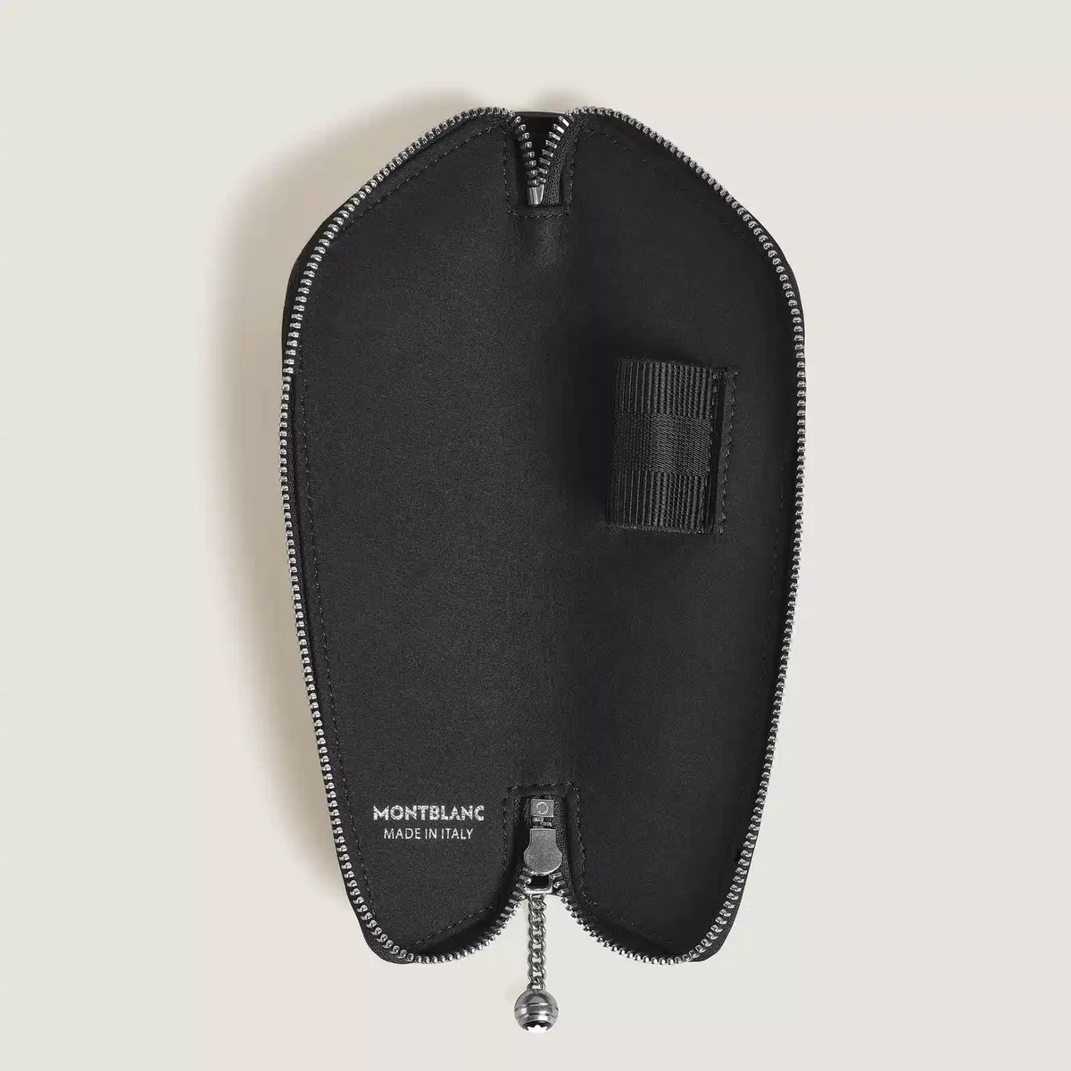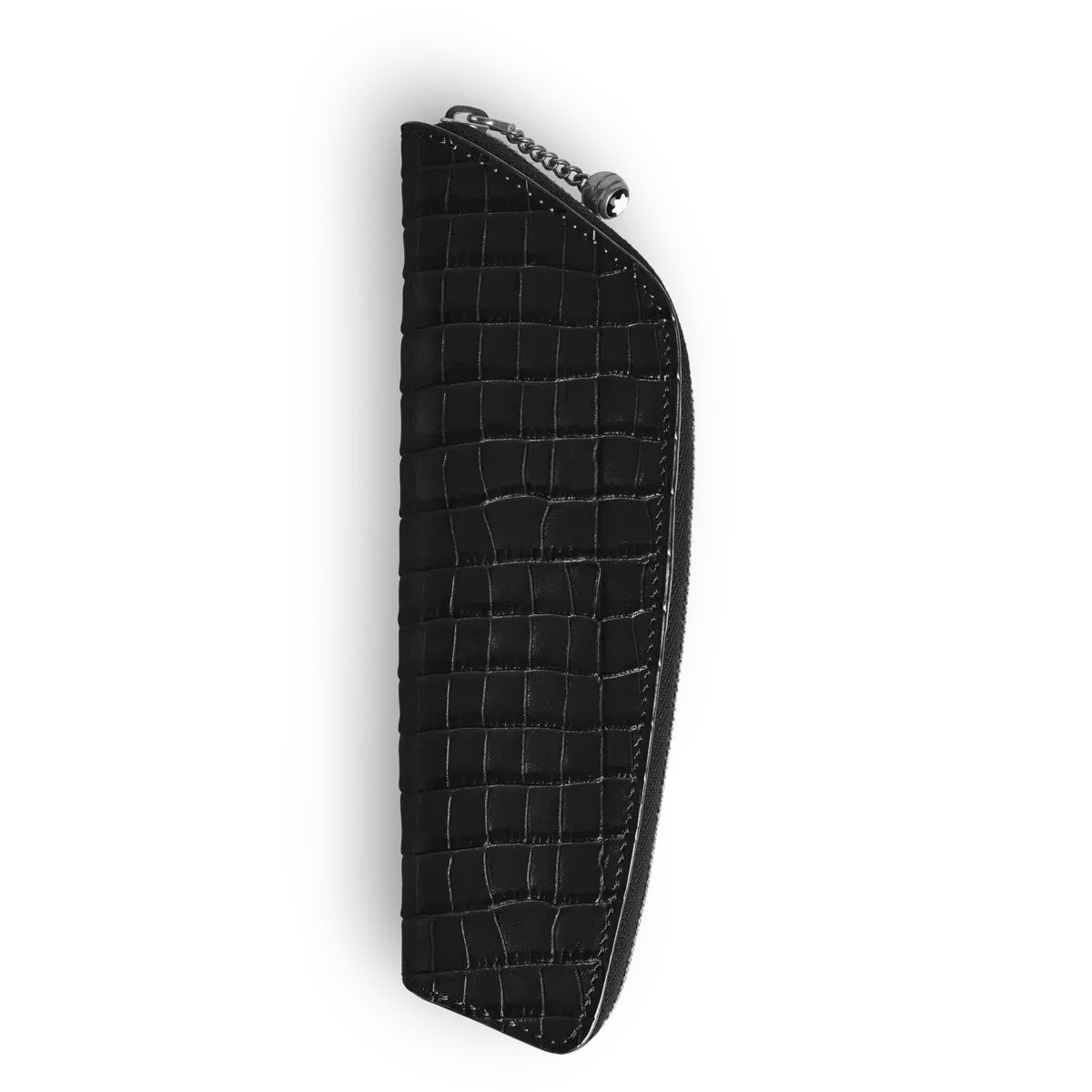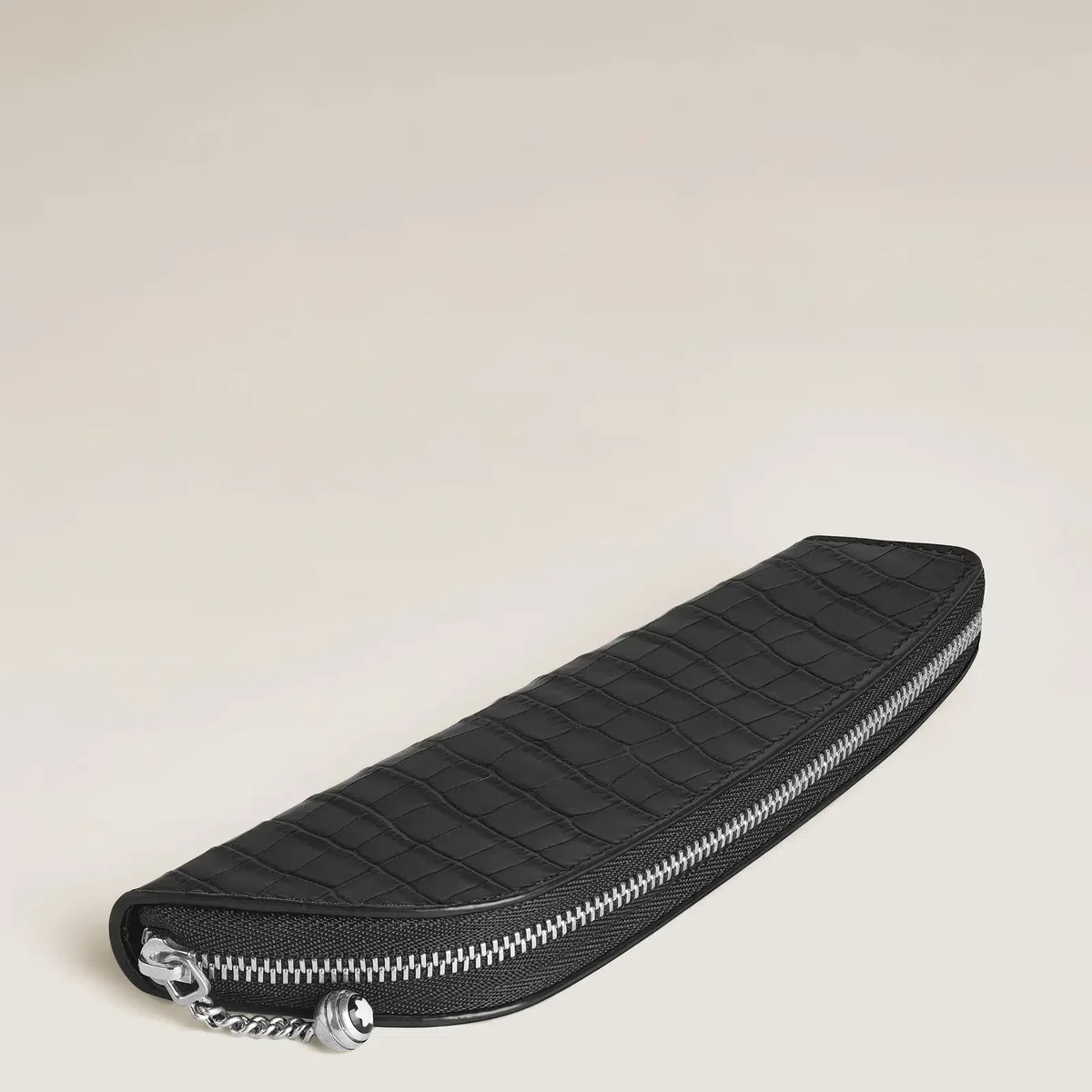 Pennetasken hylder Montblancs arv med et moderne touch. Den er fremstillet af sort krokodillepræget læder og har den karakteristiske kæde-lynlås med et sfærisk emblem, inspireret af en arkivert Montblanc-penneetui, en af brandets tidligste læderkreationer. Denne elegante etui er designet til at rumme et skriveinstrument, såsom Meisterstück Classique eller LeGrand, og kombinerer en karakteristisk stil med praktisk anvendelighed i hverdagen.