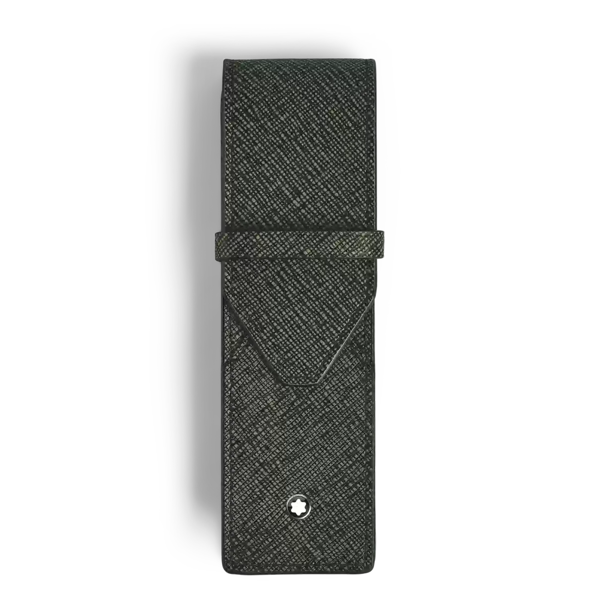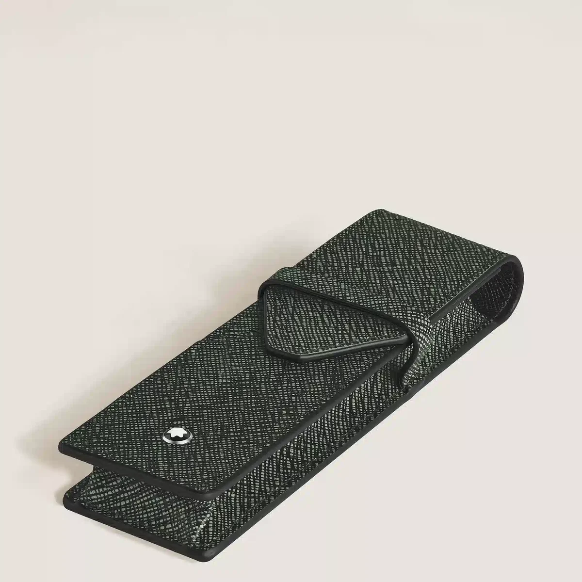 Denne pennepose er et elegant og raffineret tilbehør, der er designet til at rumme op til to skriveinstrumenter. Den er fremstillet af præget sartorial læder i en elegant tofarvet kombination af klassisk khaki og sort, og dens overlappende silhuet er inspireret af formen på en konvolut, hvilket er en hyldest til skrivekulturen.